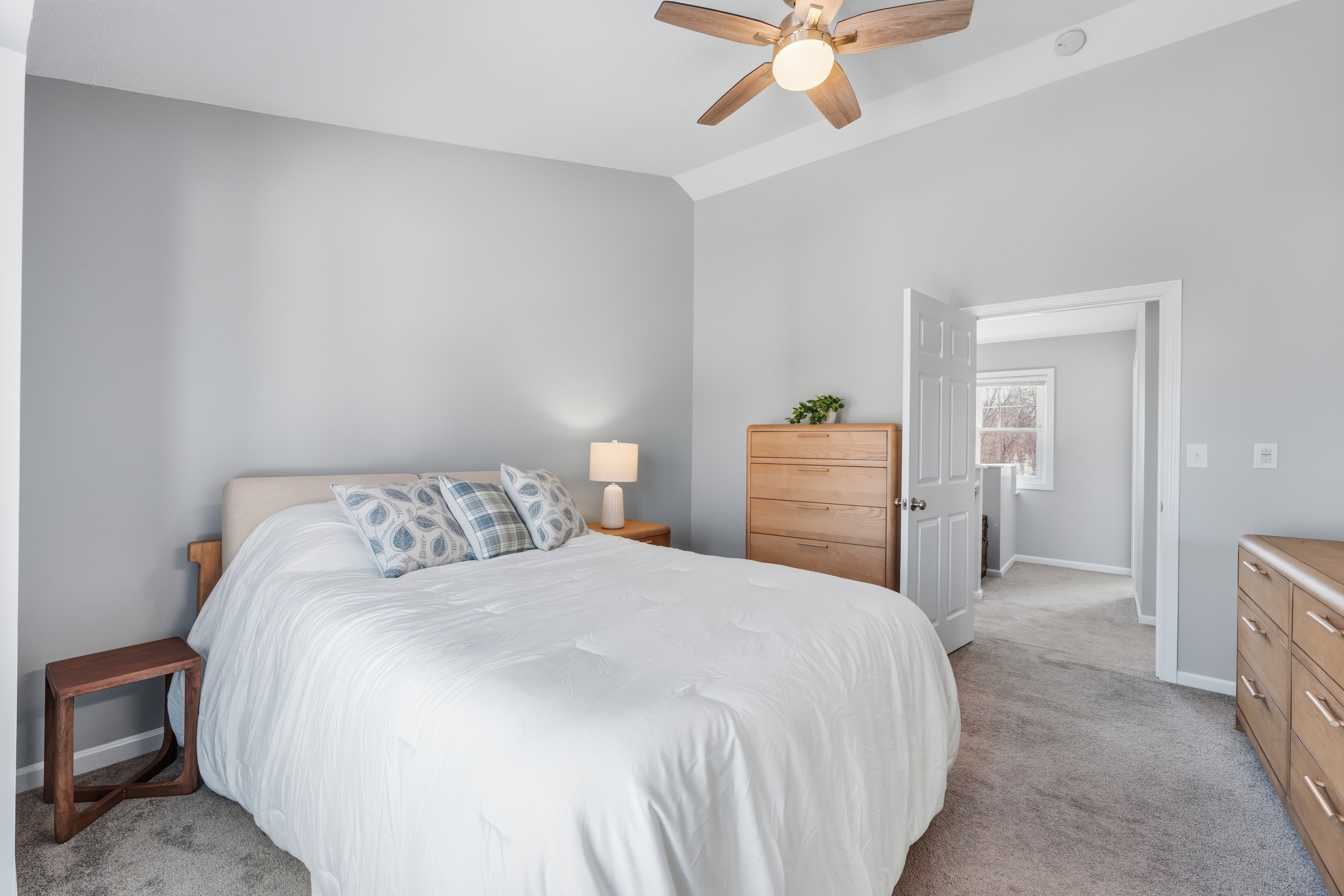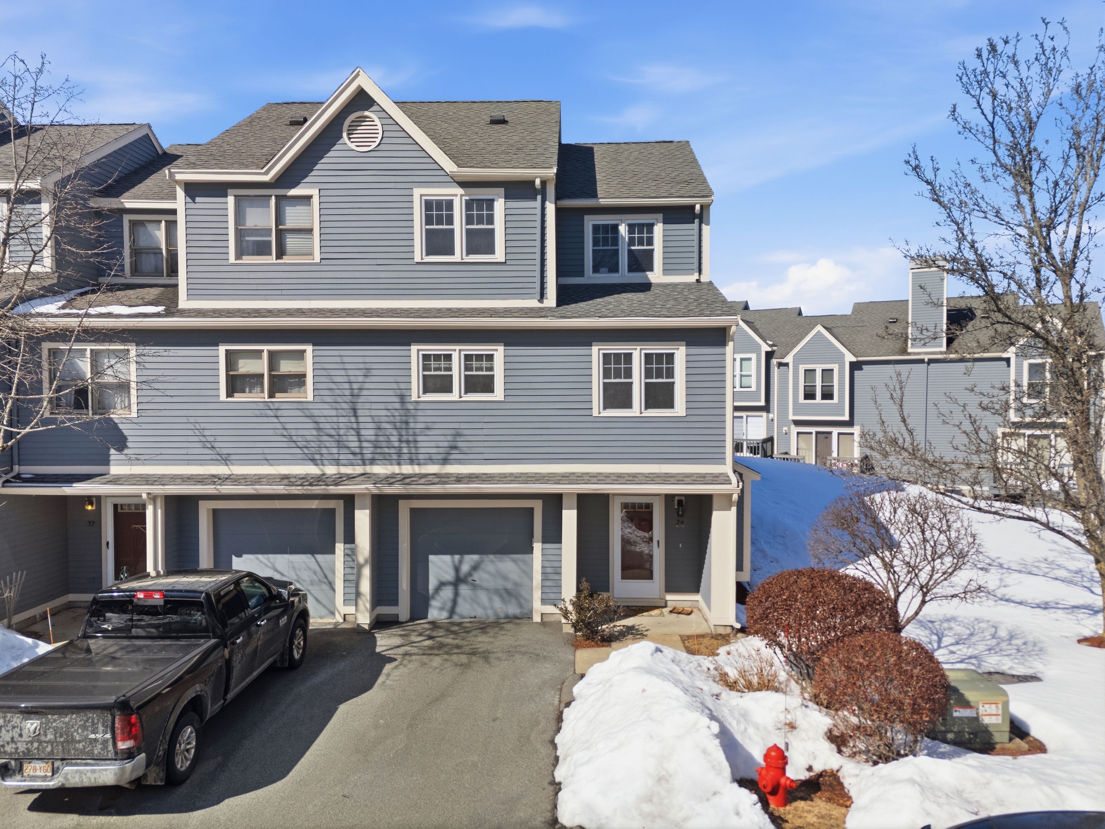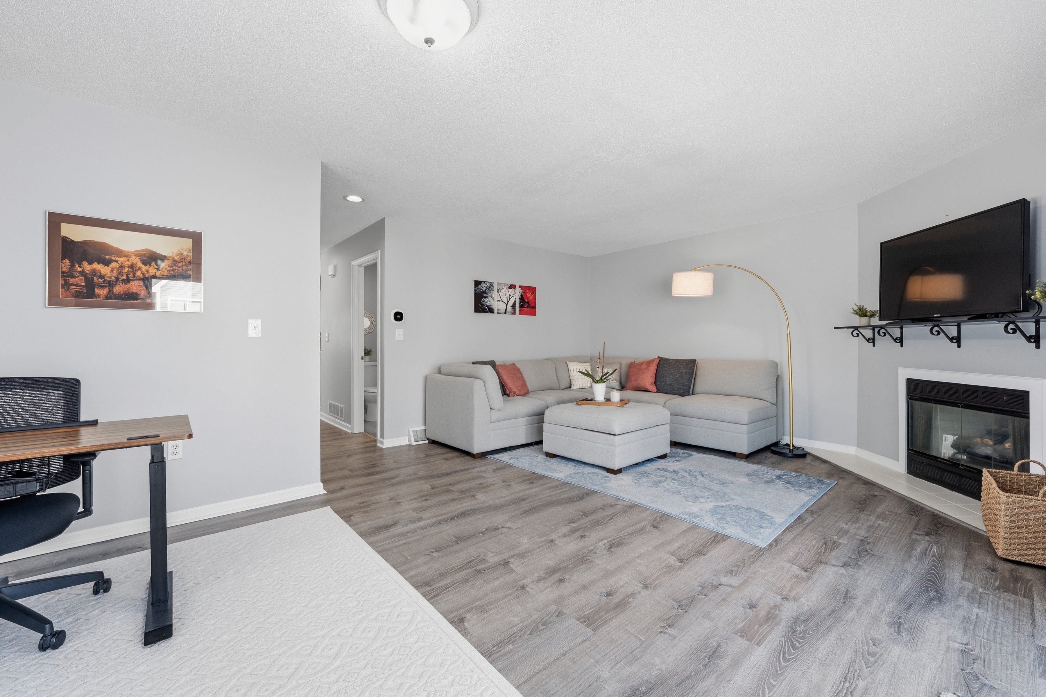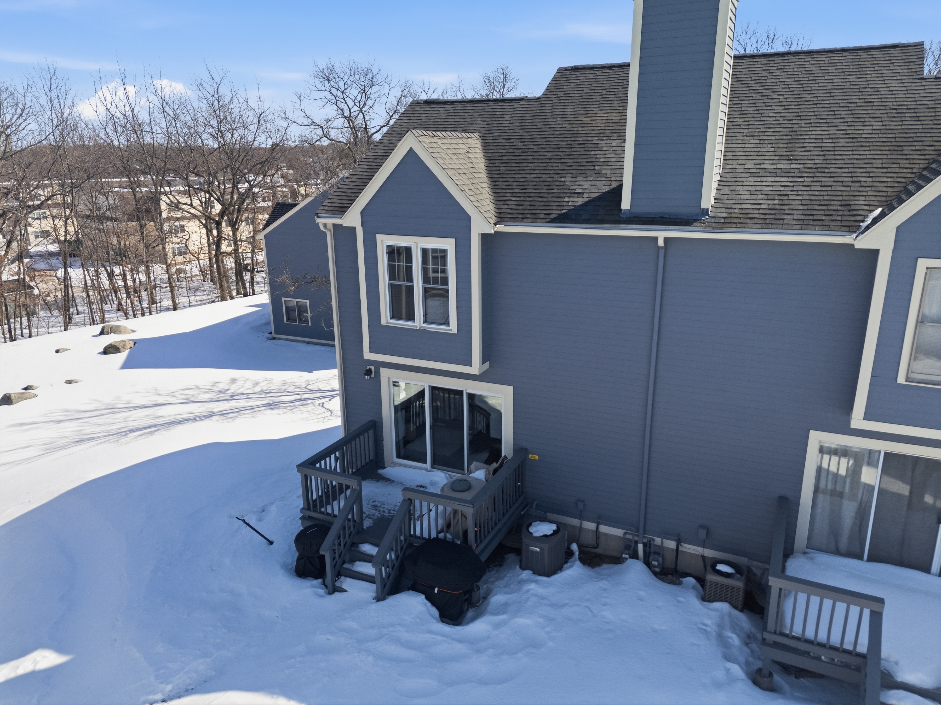 Pride of ownership shines in this rare opportunity to own a private end-unit townhouse at the very back of the desirable Stoneybrook complex, with no units behind you and peaceful surroundings. Inside, the home feels bright and open with a beautifully renovated vaulted-ceiling kitchen featuring quartz countertops, white shaker cabinetry, stainless steel appliances, recessed lighting, and a large pantry, plus a sunny dining area. The spacious and bright living room opens to a private deck—perfect for morning coffee or entertaining. Upstairs are two generous bedrooms with soaring ceilings, including a primary bedroom with a walk-in closet. Both baths have been refreshed with new flooring and upgraded vanities. Major updates include a brand-new water heater, furnace and central air in 2023, adding comfort and efficiency. The lower level offers a one-car garage and laundry area, and residents enjoy access to the community in-ground pool. Move-in ready and easy to love. Come home today!