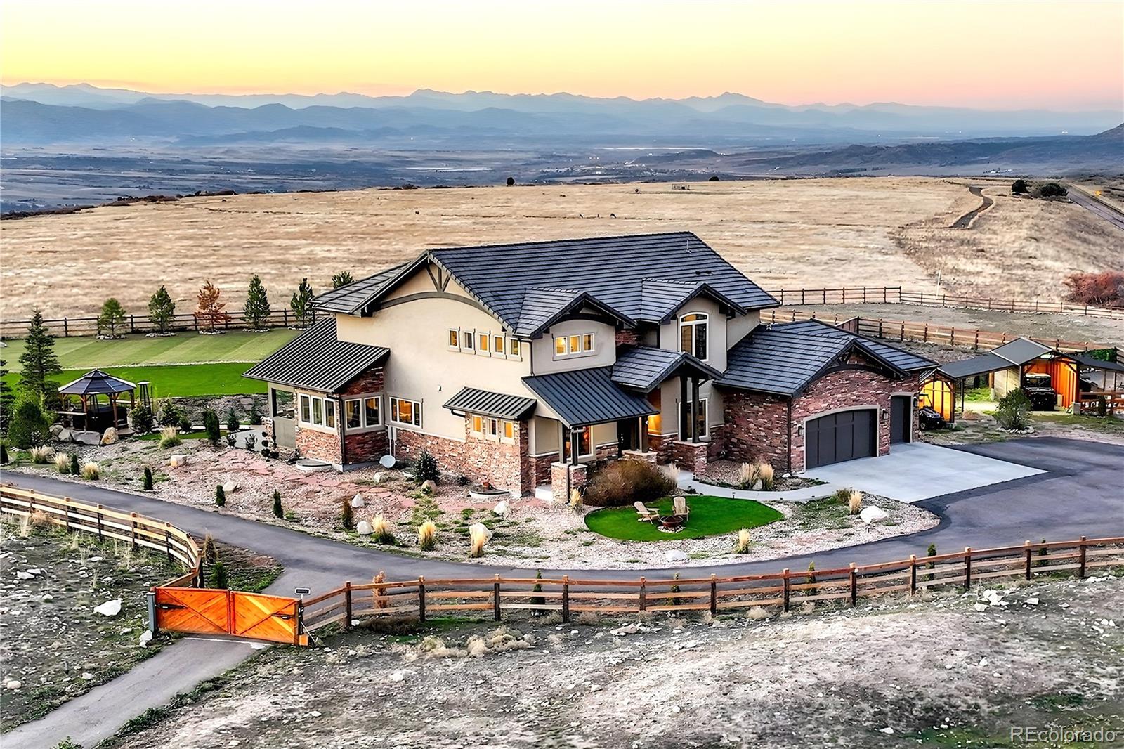 Unrivaled 360 Front Range views, absolute privacy, and resort-level amenitiesthis is one of Douglas Countys most extraordinary gated estates.Perched atop a private mesa just minutes from Castle Rock, this 35-acre luxury residence and equestrian property captures breathtaking vistas from Fort Collins to Colorado Springs, plus dazzling city lightsall within a secure, gated community and fully gated homesite.The gourmet kitchen is a showpiece with Sub-Zero refrigeration, four ovens, a 7-burner gas range, dual dishwashers, beverage drawers, an expansive slab granite island, walk-in pantry, and 8 doors. The dramatic great room features a 25 ceiling, floor-to-ceiling stone fireplace, and a wall of glass framing the panoramic views, with automated window coverings and seamless access to a covered outdoor living area complete with a second kitchen and pizza oven.The main-level primary suite is a private retreat with soaring ceilings, fireplace, picture windows, and a spa-like bath with multiple shower heads, soaking tub, and an oversized custom closet with built-ins and secure jewelry storage. Upstairs, two bedrooms offer en-suite baths and a versatile loft. The walk-out lower level is designed for entertaining with a game room, media space, wet bar with wine storage, fitness room, and two additional en-suite bedrooms.Built for efficiency and peace of mind, the home includes geothermal heating and cooling, whole-home water filtration, tankless water heater, fire suppression, & radon mitigation systems.Outdoors, enjoy a true private compound: maintenance-free turf, a full-size soccer field, putting green, yoga mat, outdoor kitchen, two gazebos (hot tub fire pit), auxiliary garages, and fenced areas for animals. Equestrian amenities include a 1,200 sq ft barn, tack room, fenced pastures, livestock water permit, and solar power system (2024).A rare blend of luxury, acreage, security, and unmatched viewsjust minutes from the heart of Castle Rock