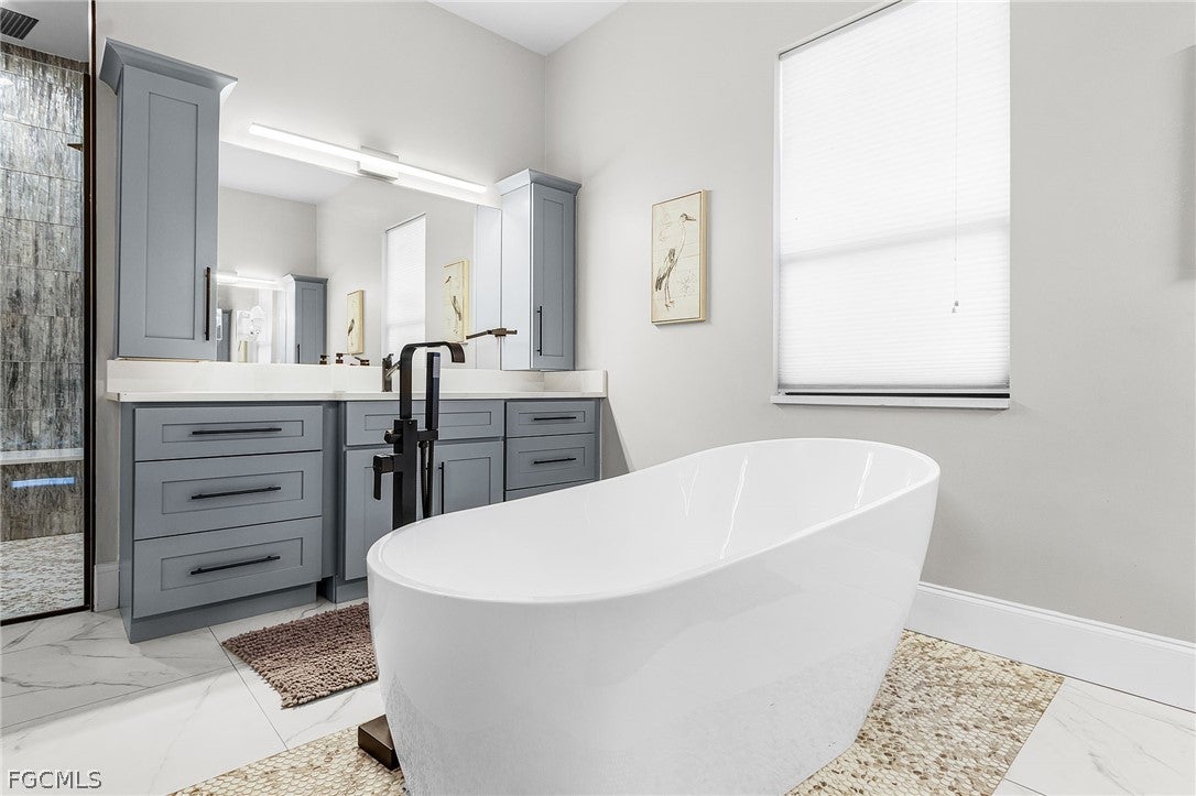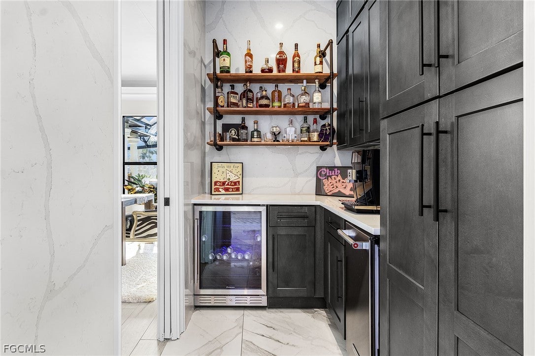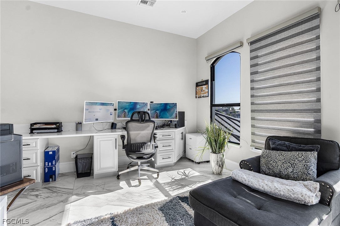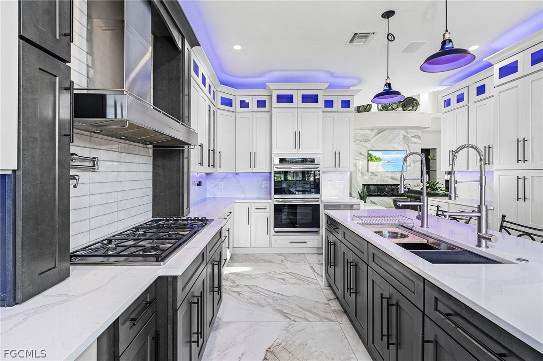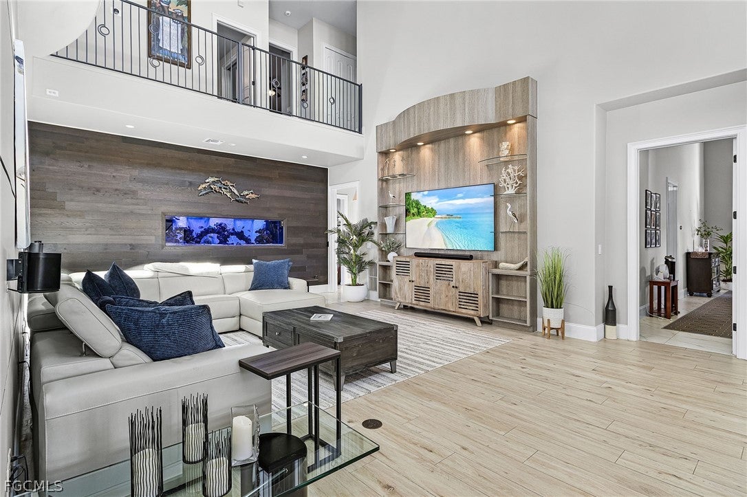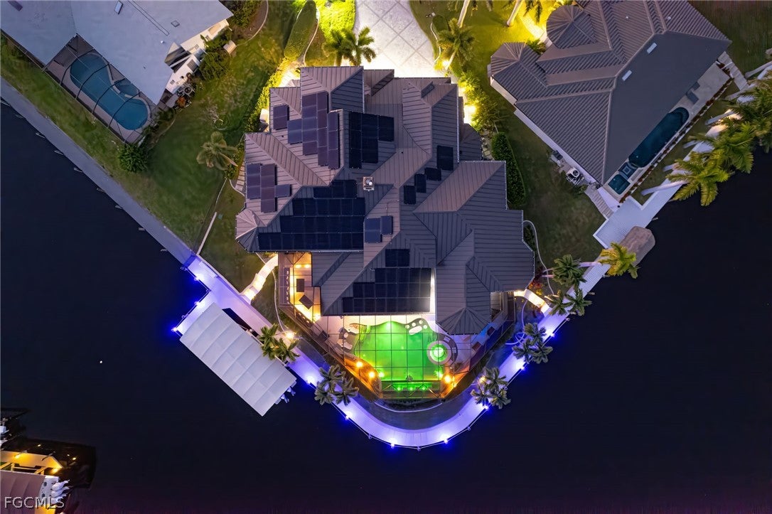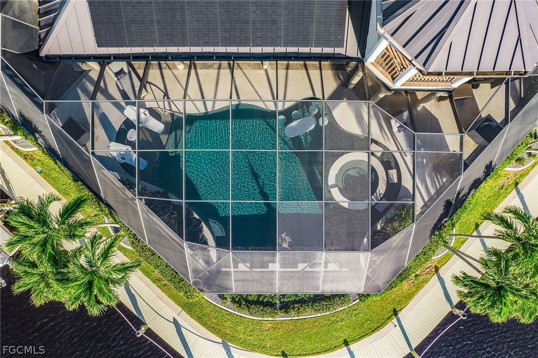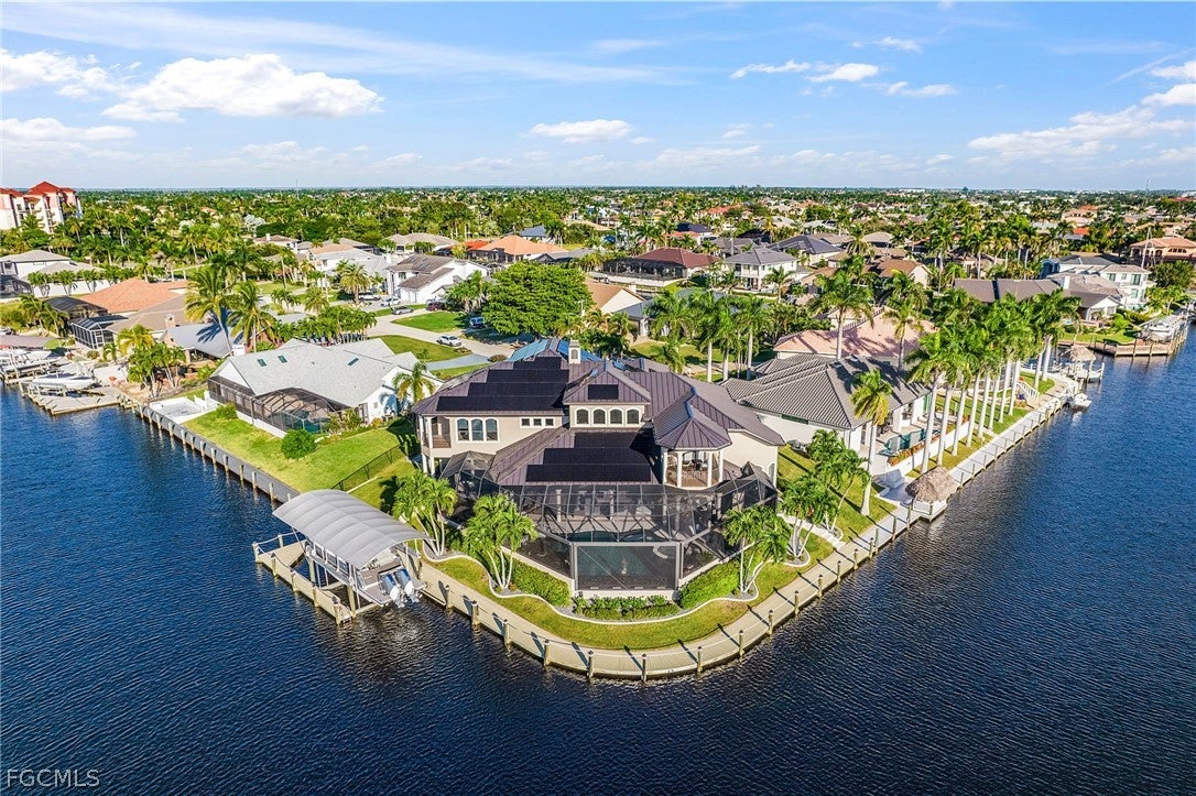 Commanding intersecting, river-like canal views set the stage for this furnished modern waterfront estatejust steps from Cape Harbour and designed for true resort-style living. Perfectly positioned on what may be one of the finest oversized lots in Cape Coral, the home is set back from the waters edge to capture long panoramic views down the spreader canal while maintaining exceptional privacy. Enjoy all the beauty of wide river-like water without the typical exposure, plus direct no-bridge Gulf access.Set on 178 feet of seawall and wraparound dockage, the residence has been completely reimagined through a full designer remodel. A clean modern faade, lush tropical landscaping, and a new standing-seam metal roof paired with paid solar create a striking first impression.Inside, soaring 30-foot ceilings flood the grand entry with natural light, anchored by a dramatic architectural staircase. Large-format tile flooring flows throughout expansive living areas designed to seamlessly connect indoor and outdoor entertaining. The family room features a stunning 400-gallon saltwater aquarium, creating a relaxed yet unforgettable focal point.The chefs kitchen is a true showpiece, redesigned with quartz countertops, premium stainless appliances, a dramatic waterfall island, and a butlers pantry that blends high design with everyday functionality. The formal dining room overlooks the water, offering a refined setting for entertaining.The primary suite is conveniently located on the first floor, providing a private retreat with a freestanding soaking tub and an expansive floor-to-ceiling tiled shower. Guest rooms reflect the same level of detail, while the executive office and media spaces offer exceptional flexibility, easily accommodating a 6- or even 7-bedroom configuration.Outdoors, the resort-style lanai is designed for both relaxation and entertaining, featuring multiple lounging areas, a fully equipped outdoor kitchen and bar, a custom quartz dining table, and a saltwater disappearing-edge pool and spa accented by dramatic fountains and fire features. Tropical landscaping, architectural lighting, and a whole-home Sonos sound system create an exceptional day-to-night ambiance.For boaters, the property offers 178 feet of seawall and dockage, including a Captains Walk, wraparound composite dock, and 30,000-lb lift, providing deep-water, sailboat access directly to the Gulfno bridges, no locksmaking waterfront dining and open-water adventures effortless.Evenings are unforgettable, with sunsets shimmering across the canal and a short stroll to Cape Harbours shops and waterfront dining.A spacious air-conditioned 3-car garage, meticulous craftsmanship, and true move-in-ready condition complete this extraordinary offering.Modern. Refined. Extraordinary. This is waterfront living at its finest in Cape Coralwhere every day feels like a luxury vacation.