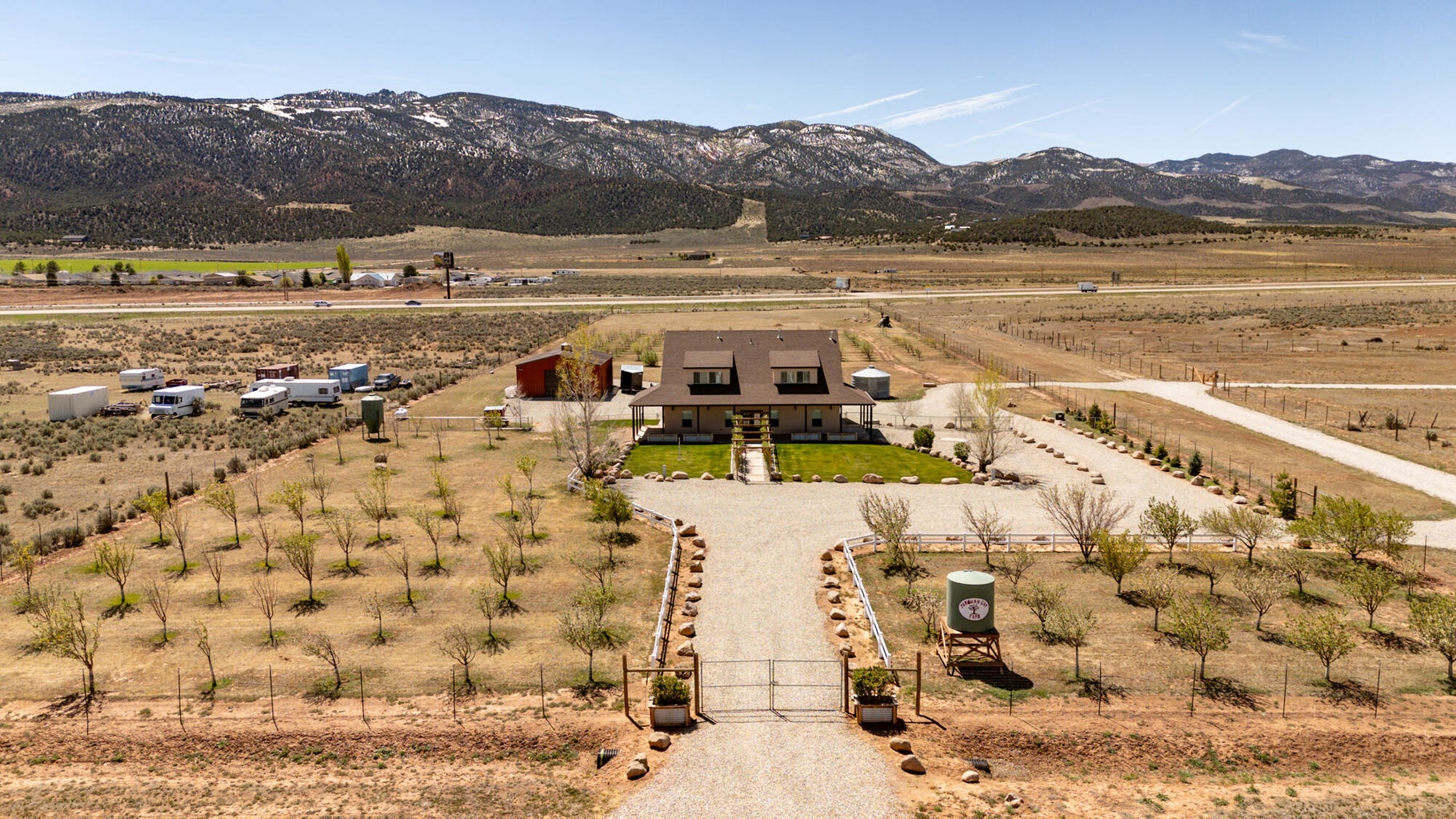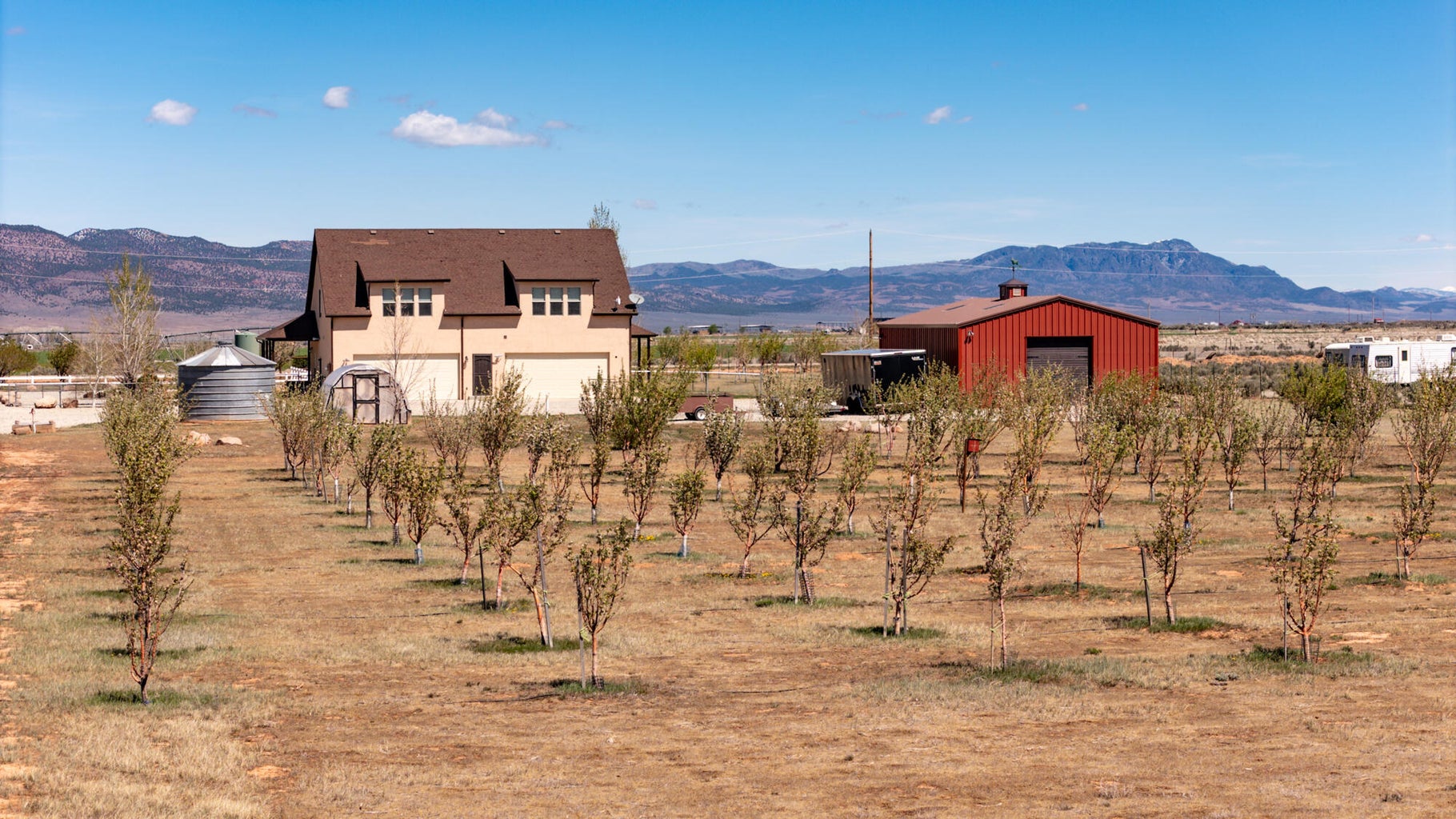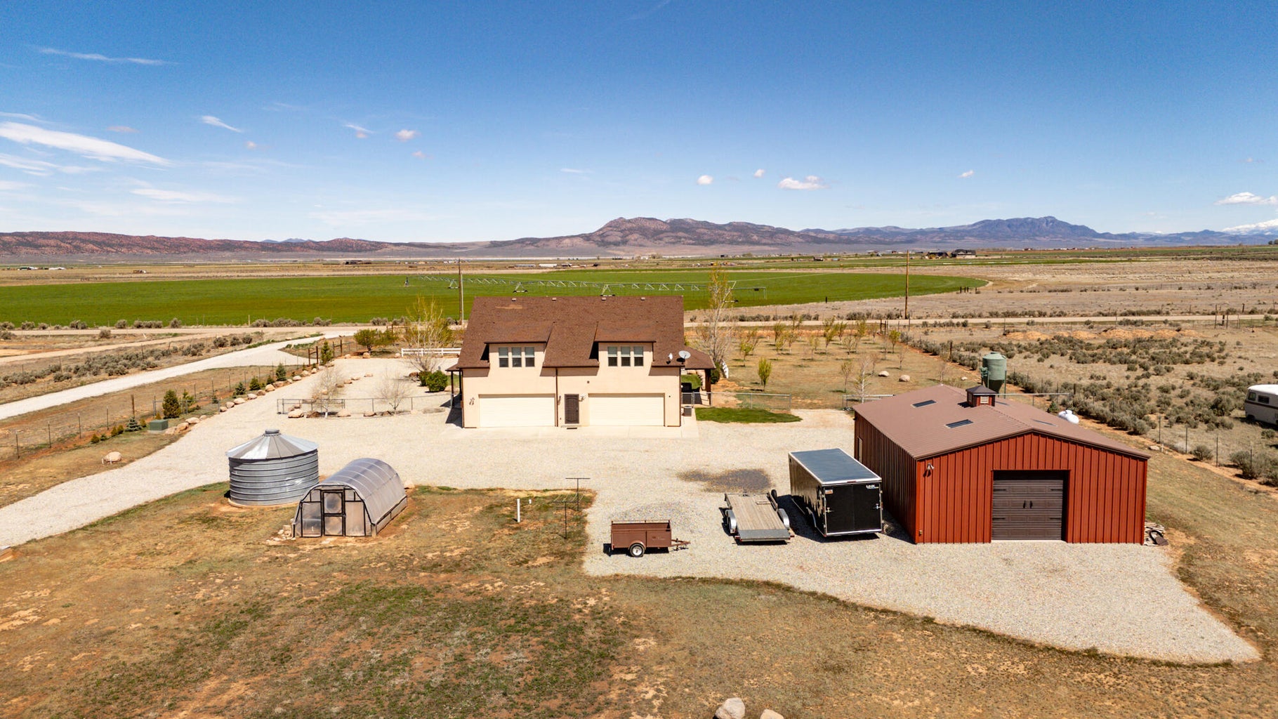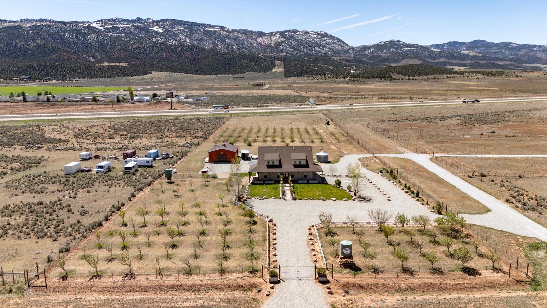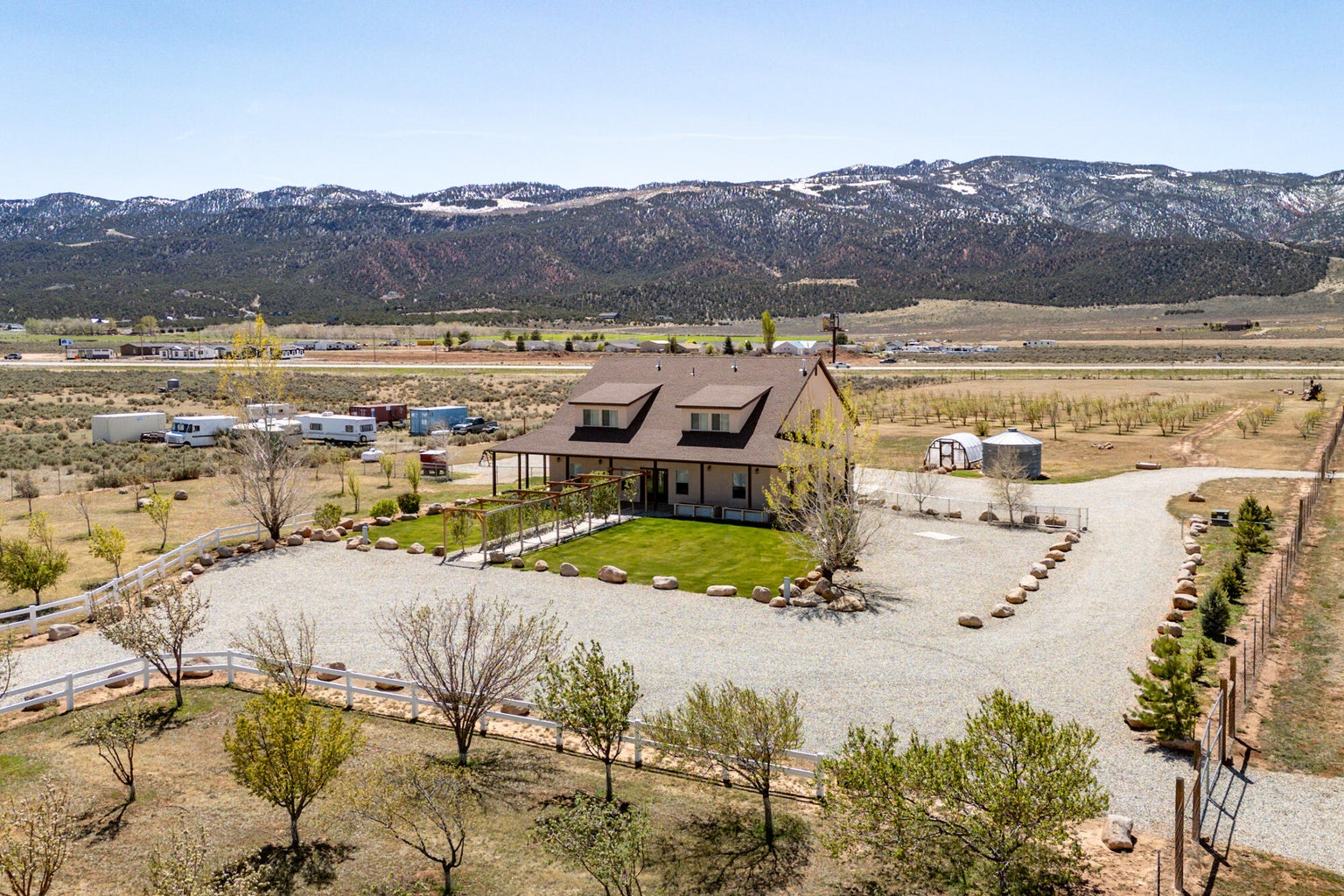 PAROWAN GAP FARM, 5.24 Acres, wraparound porch. 2 separate living quarters upstairs. Ea unit has 1 bedroom, full bath, living, kitchen, dining area. Main floor has open living area, 1/2 bathroom & laundry room. Property has 230 fruit trees, cottonwood & pine all on drip irrigation. Extra water spigots on prop. Irrig grassed front yd w/walkway & Espalier trellis. 7 ac ft water rights (2 w/1917 priority date, 5 w/1954 priority date). 40 X 30 barn w/cement floor & 1 man door & two 10 high drive thru doors. Completely fenced (6 high) w/4 gates. Decorative vinyl driveway rail fencing. 4 separate 50 amp RV electric svcs on lot. 2 RV pedestals in front of home, 1 in barn w/ability to convert to 220V, 1 in back w/access to sewer & water. All driveways covered in gravel, grain silo & greenhouse. Features forced air propane heat & A/C. Ceiling fans in all rooms. 4 car garage apx 1200 sq ft. Both 2 car garages insulated w/heaters in ea. Home has porch lighting, flood lights on each side of garages in back & on barn. Fence w/gates on each side of home that divides lot into front & back area. 1 upstairs unit with oven/range other without. Lots of storage space with walk-in closets and large pantry space.