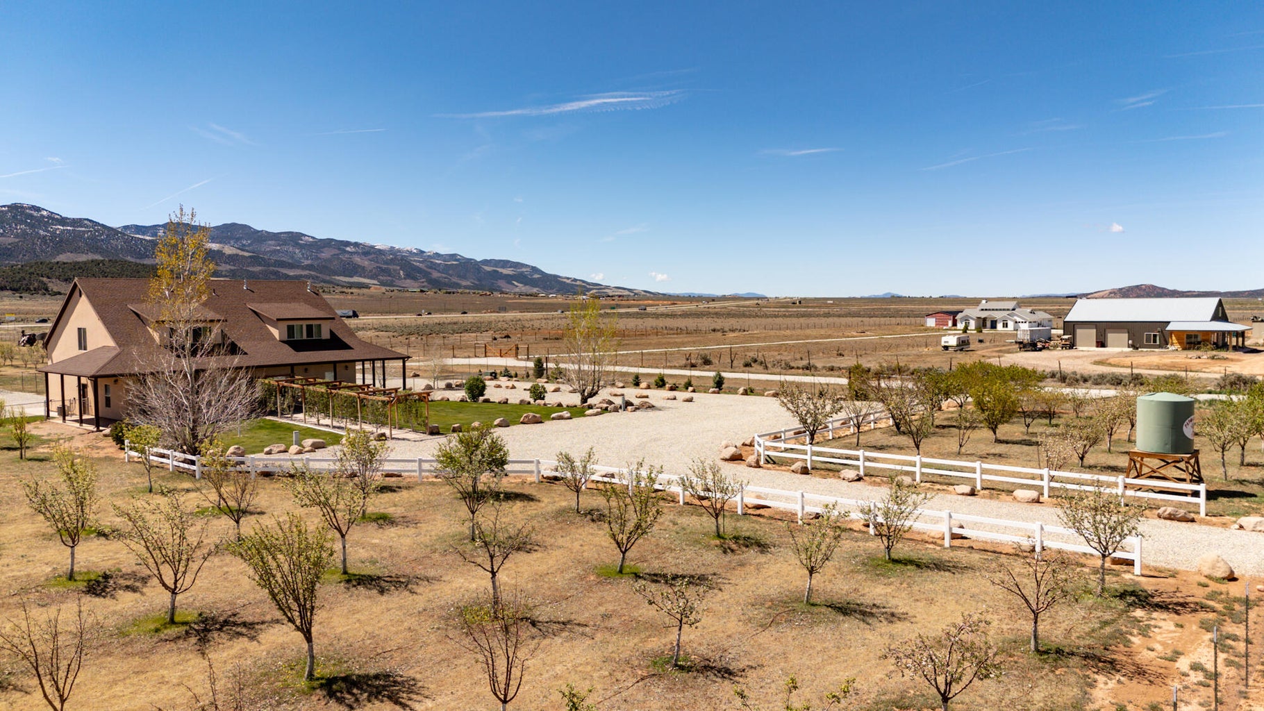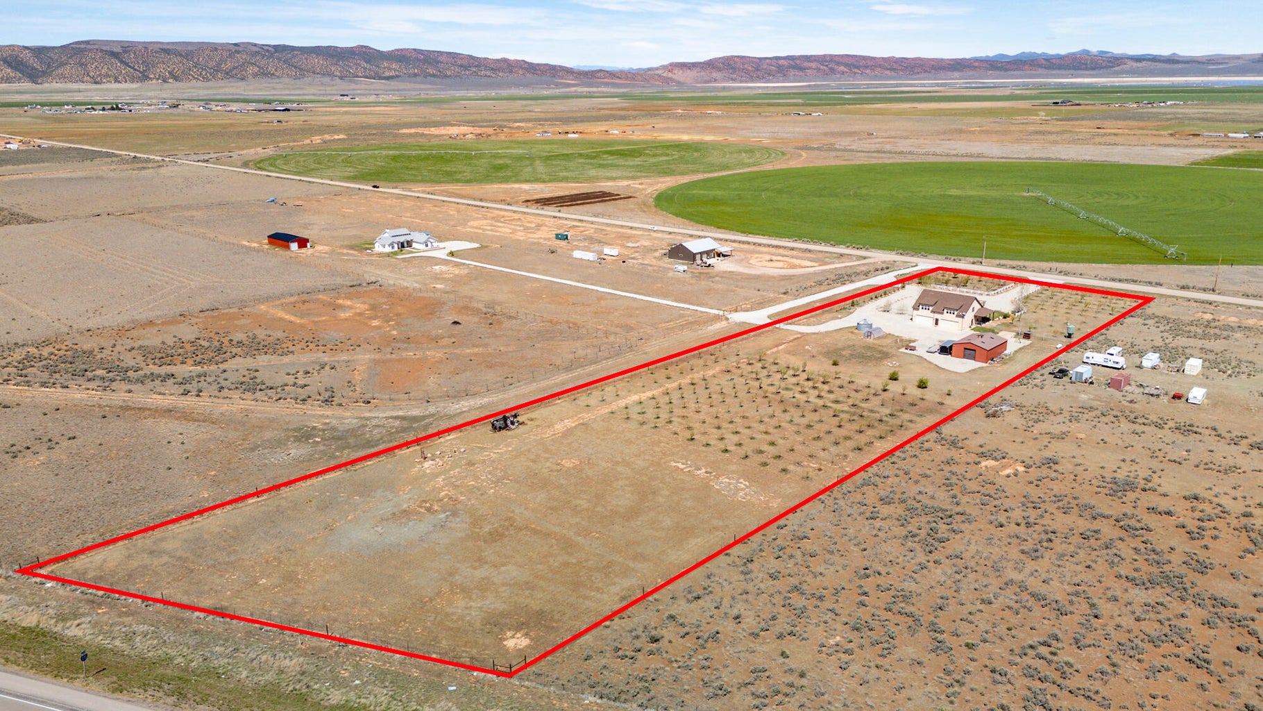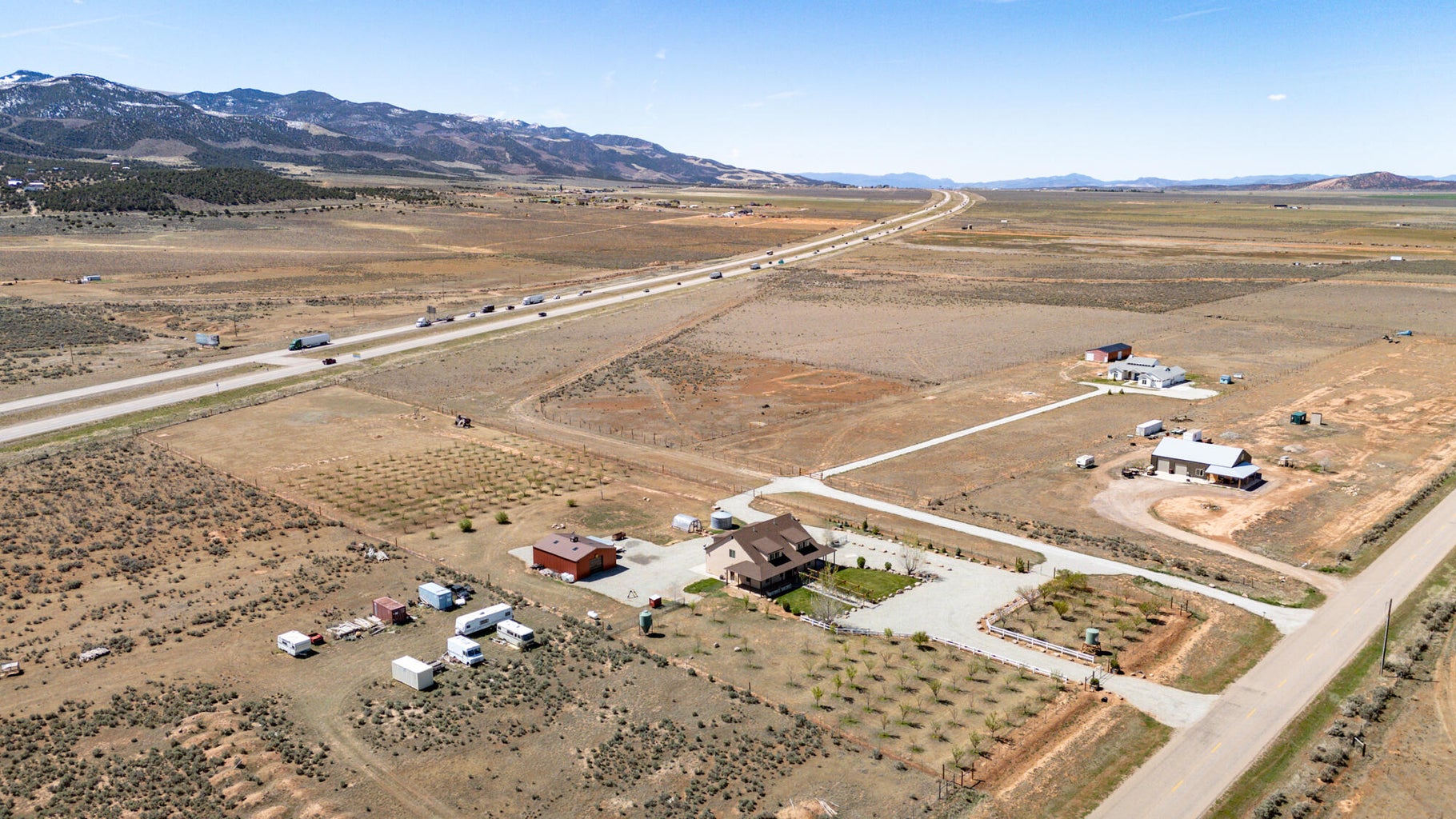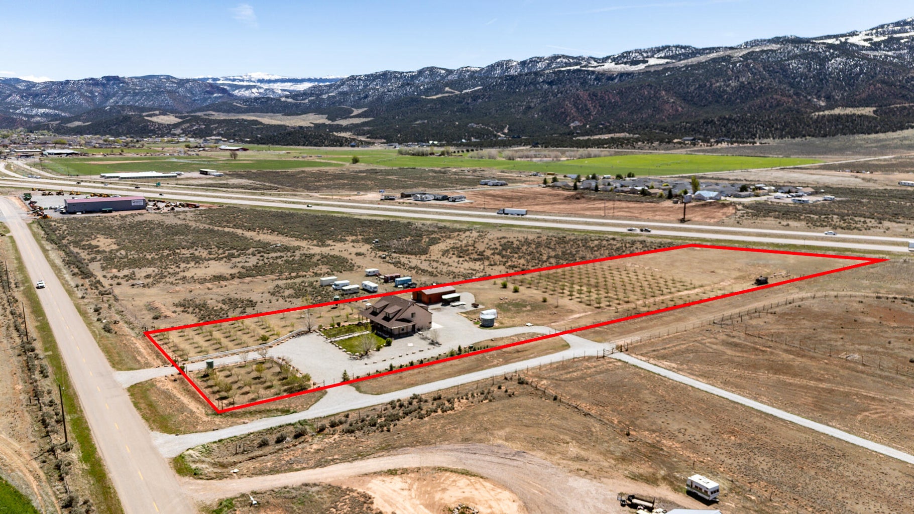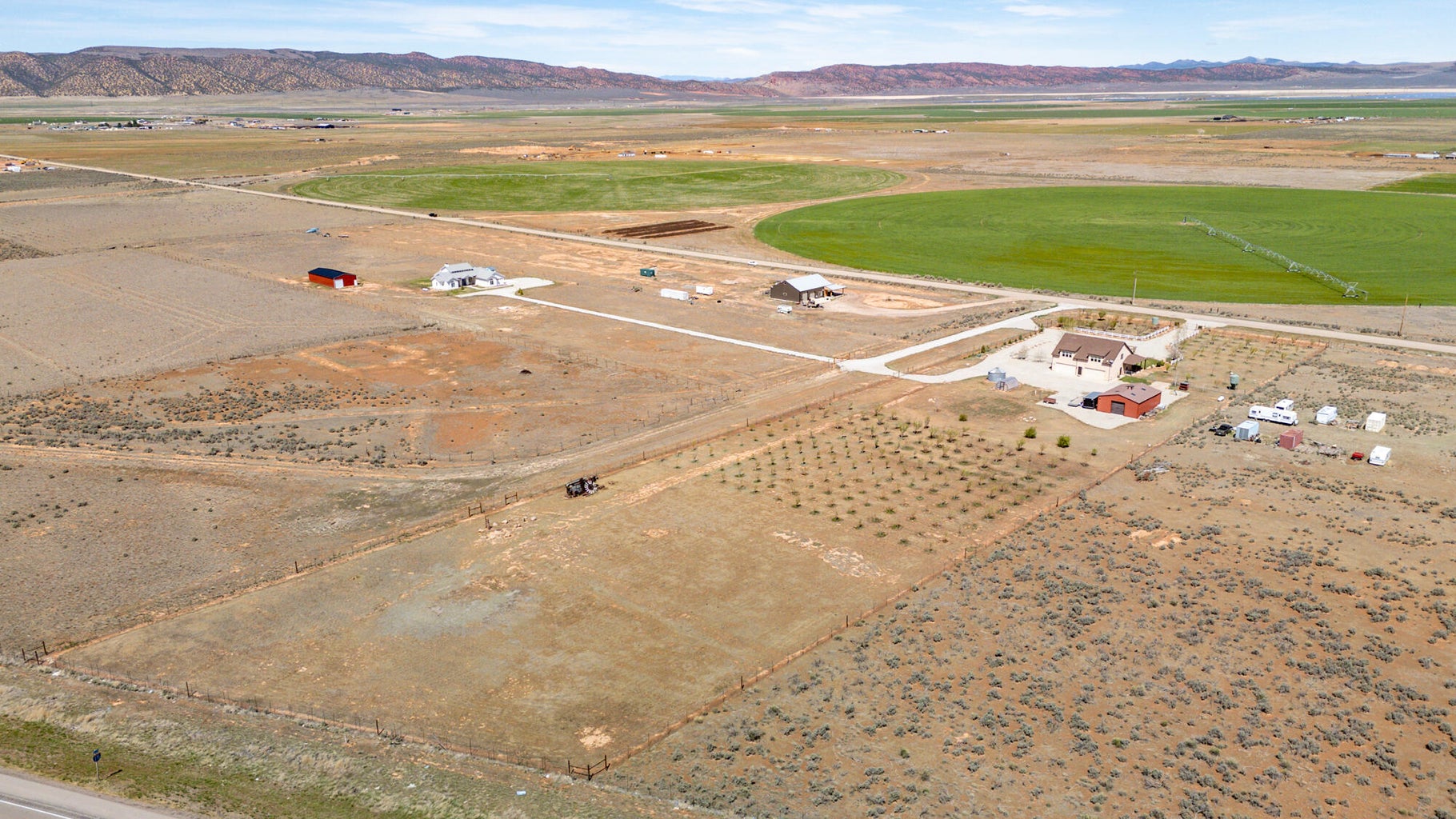 PAROWAN GAP FARM, 5.24 Acres, wraparound porch. 2 separate living quarters upstairs. Ea unit has 1 bedroom, full bath, living, kitchen, dining area. Main floor has open living area, 1/2 bathroom & laundry room. Property has 230 fruit trees, cottonwood & pine all on drip irrigation. Extra water spigots on prop. Irrig grassed front yd w/walkway & Espalier trellis. 7 ac ft water rights (2 w/1917 priority date, 5 w/1954 priority date). 40 X 30 barn w/cement floor & 1 man door & two 10 high drive thru doors. Completely fenced (6 high) w/4 gates. Decorative vinyl driveway rail fencing. 4 separate 50 amp RV electric svcs on lot. 2 RV pedestals in front of home, 1 in barn w/ability to convert to 220V, 1 in back w/access to sewer & water. All driveways covered in gravel, grain silo & greenhouse. Features forced air propane heat & A/C. Ceiling fans in all rooms. 4 car garage apx 1200 sq ft. Both 2 car garages insulated w/heaters in ea. Home has porch lighting, flood lights on each side of garages in back & on barn. Fence w/gates on each side of home that divides lot into front & back area. 1 upstairs unit with oven/range other without. Lots of storage space with walk-in closets and large pantry space.