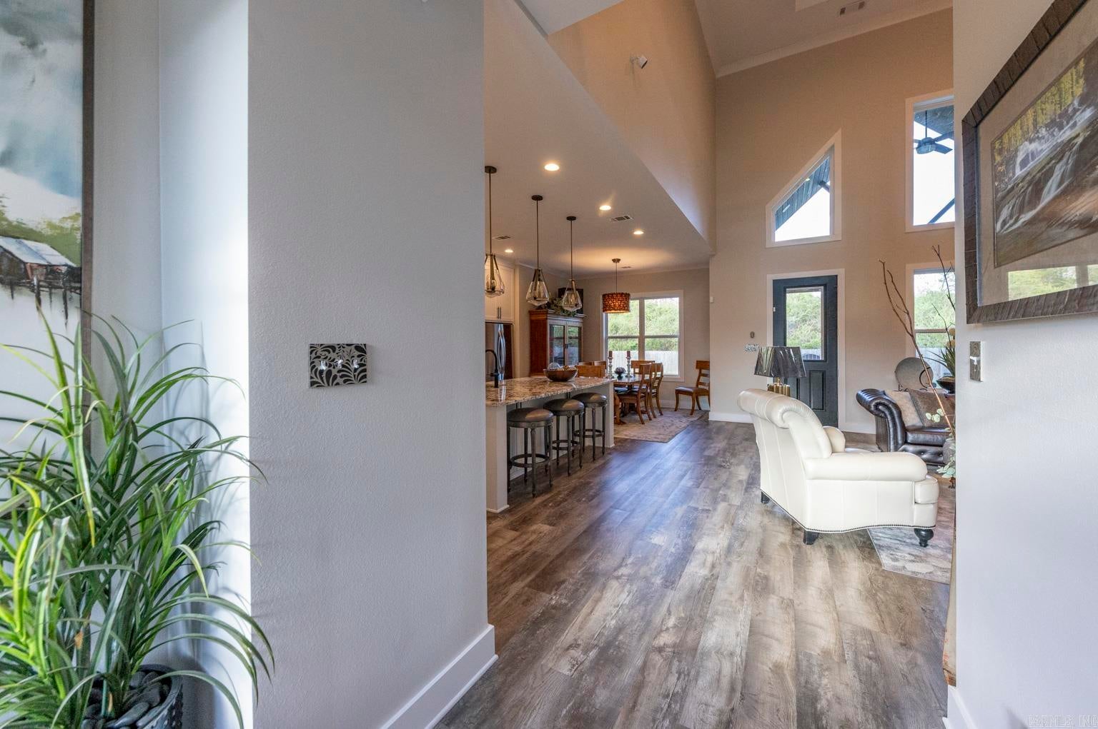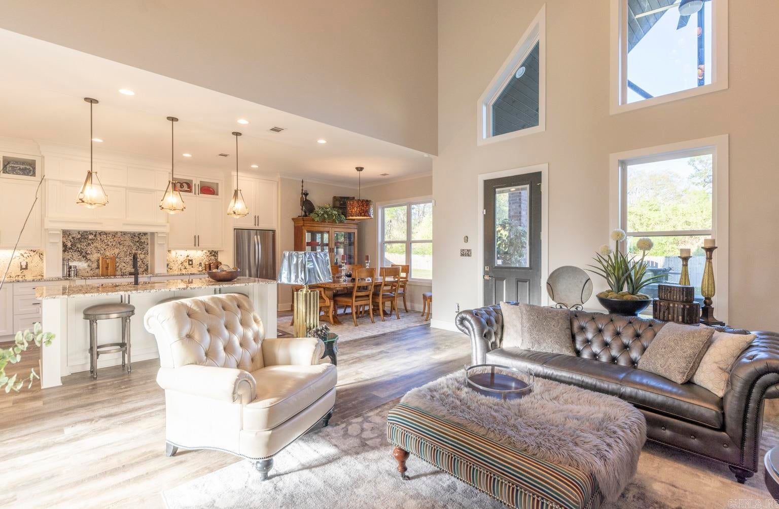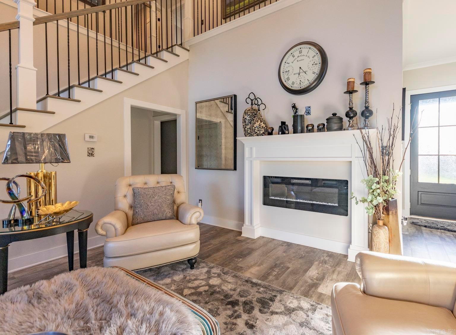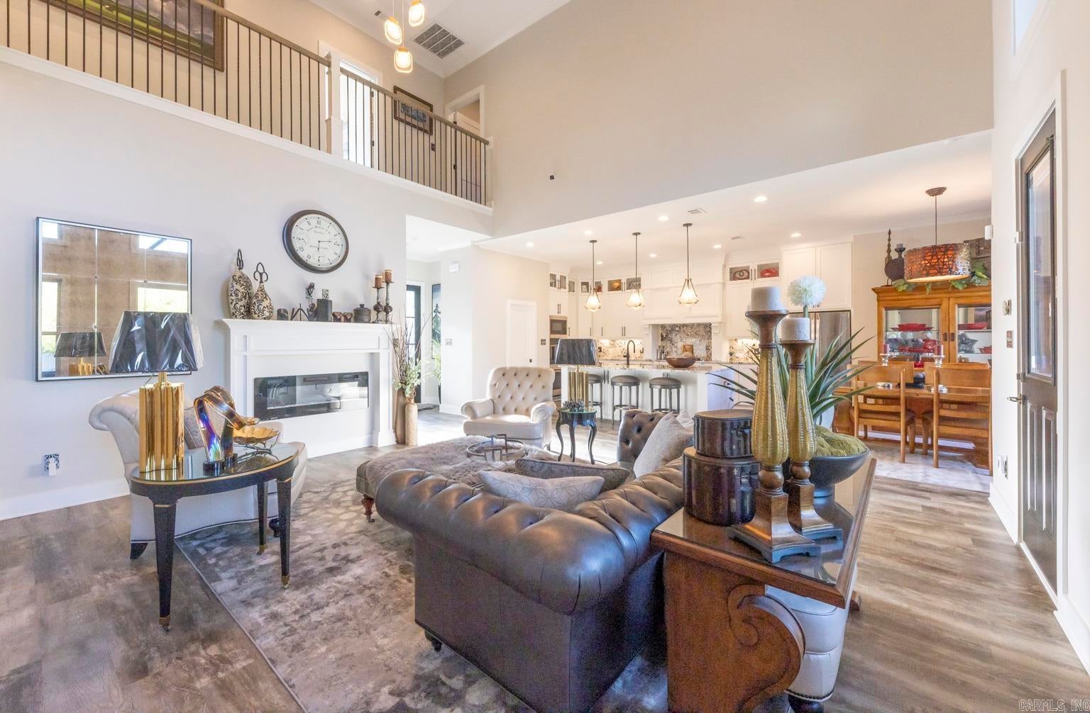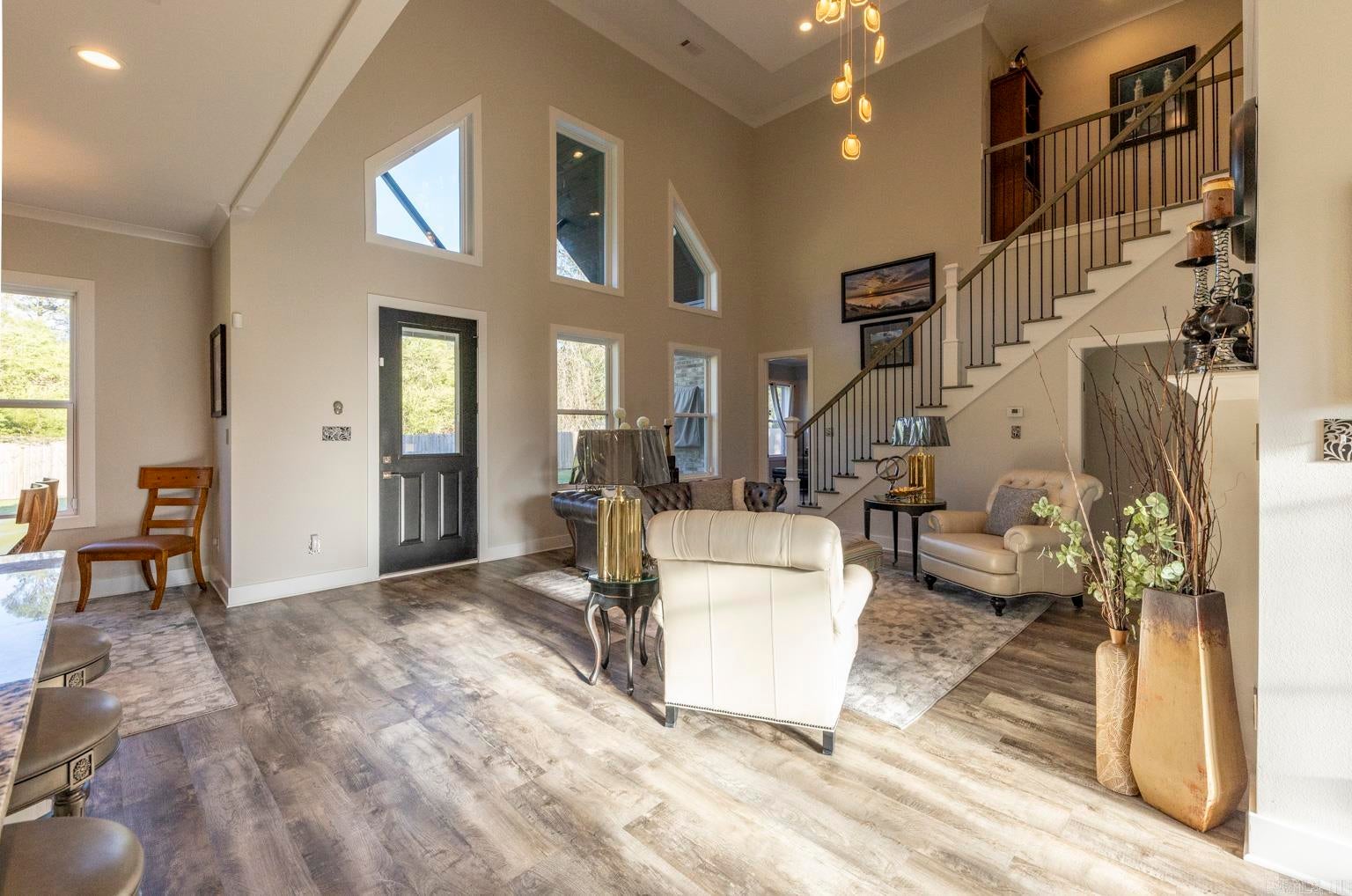 Stunning gated modern home, nestled on approximately 1 acre, conveniently located just seconds away from I-30, offering easy access to nearby amenities. As you enter, youll be welcomed into a spacious and unique living room featuring a high tray ceiling adorned with a stunning light fixture, creating an inviting atmosphere for relaxation and entertainment.