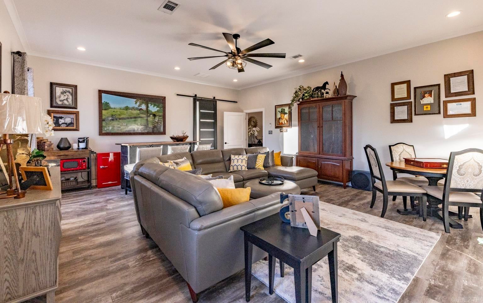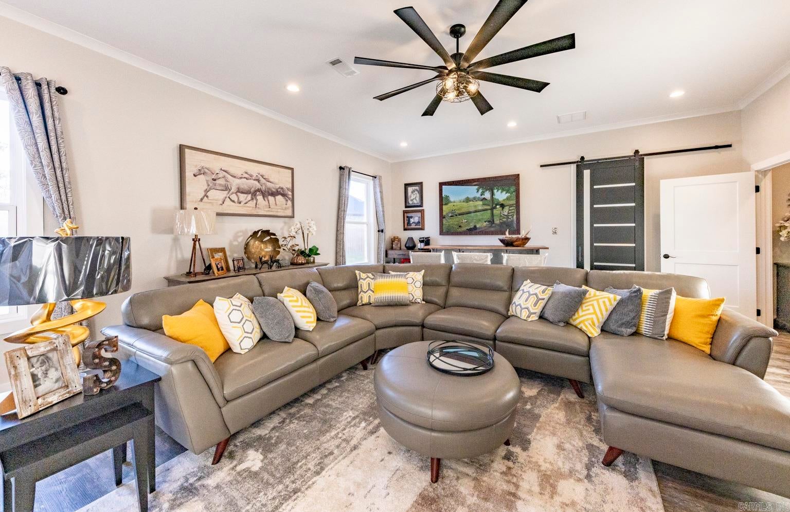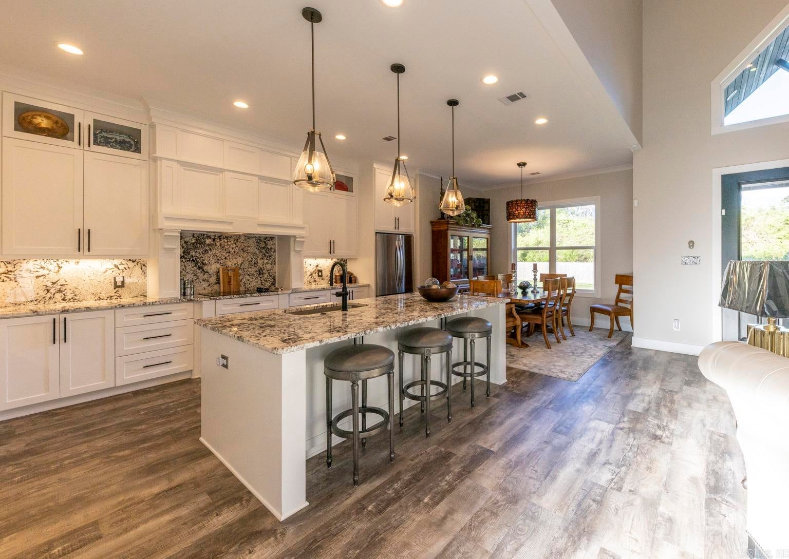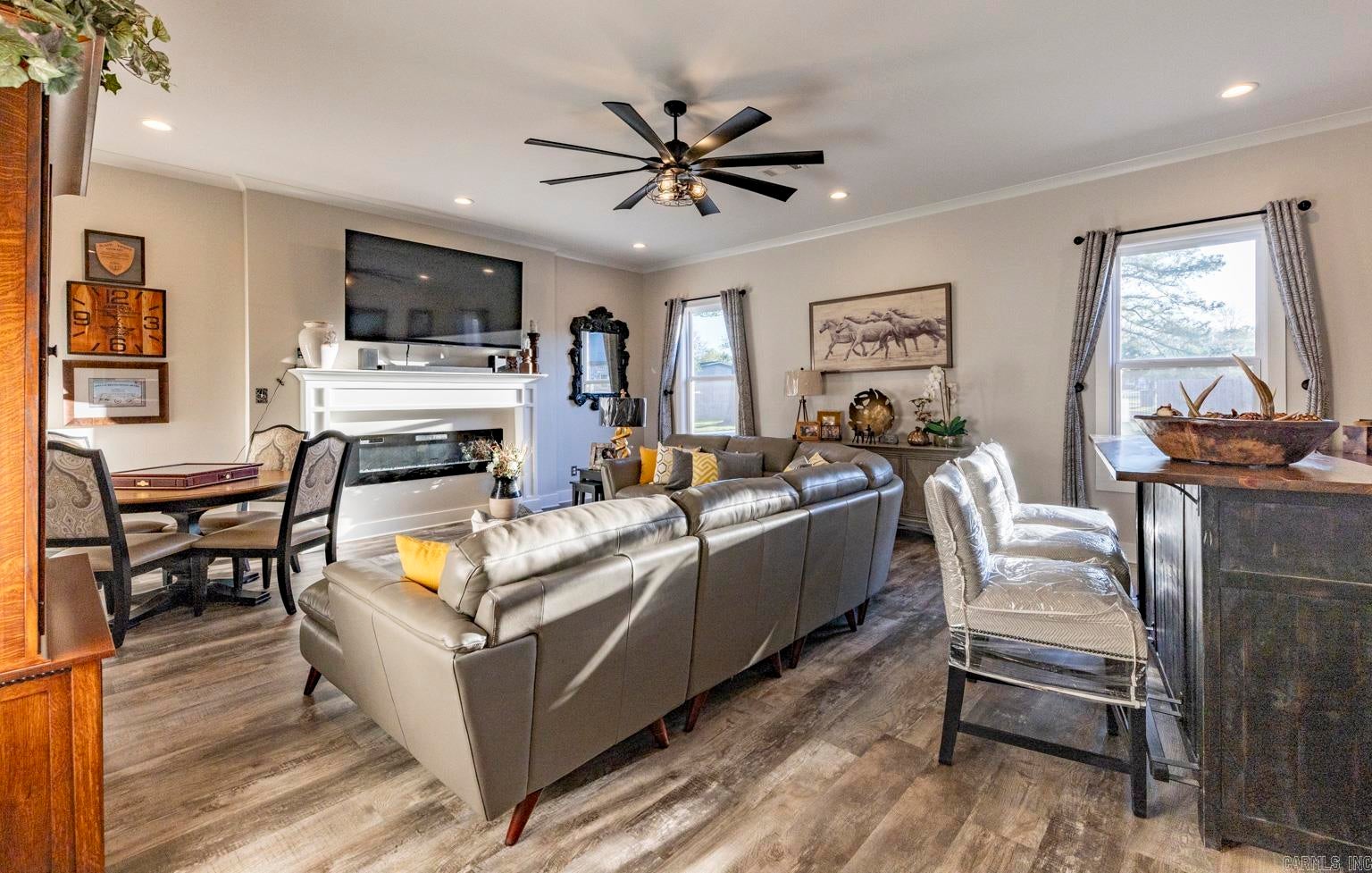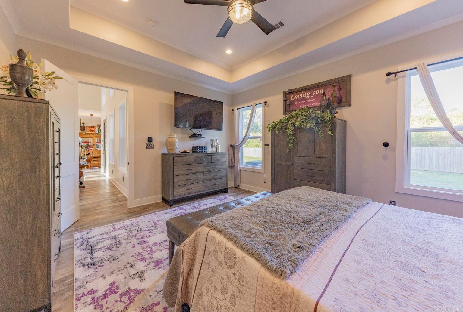 Stunning gated modern home, nestled on approximately 1 acre, conveniently located just seconds away from I-30, offering easy access to nearby amenities. As you enter, youll be welcomed into a spacious and unique living room featuring a high tray ceiling adorned with a stunning light fixture, creating an inviting atmosphere for relaxation and entertainment.