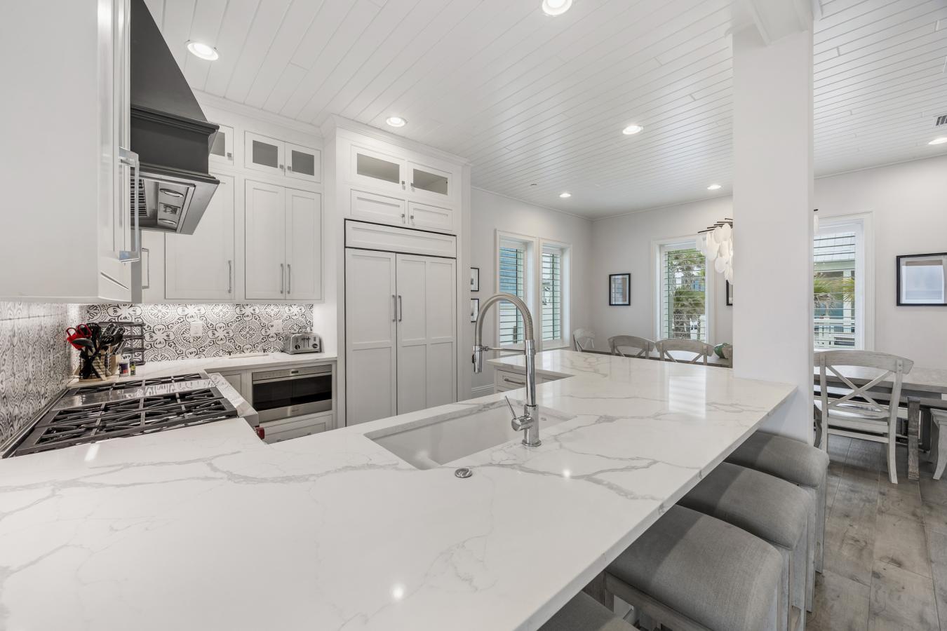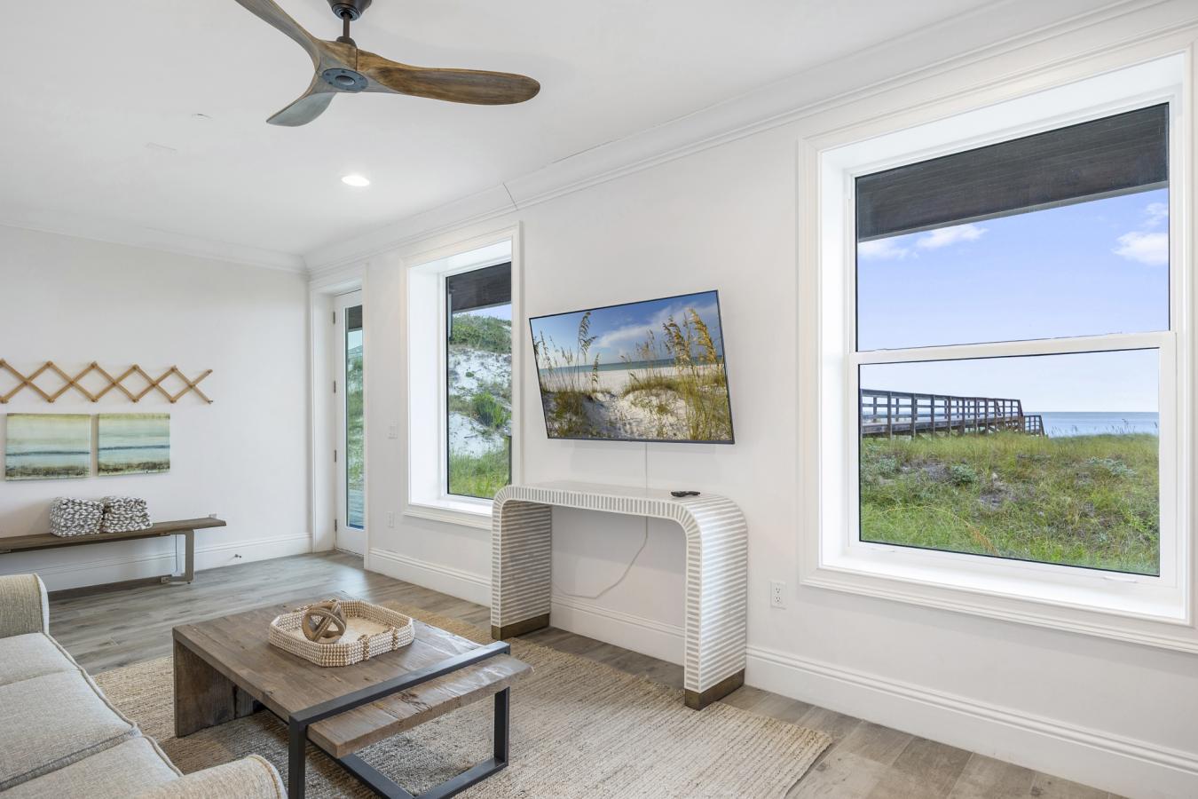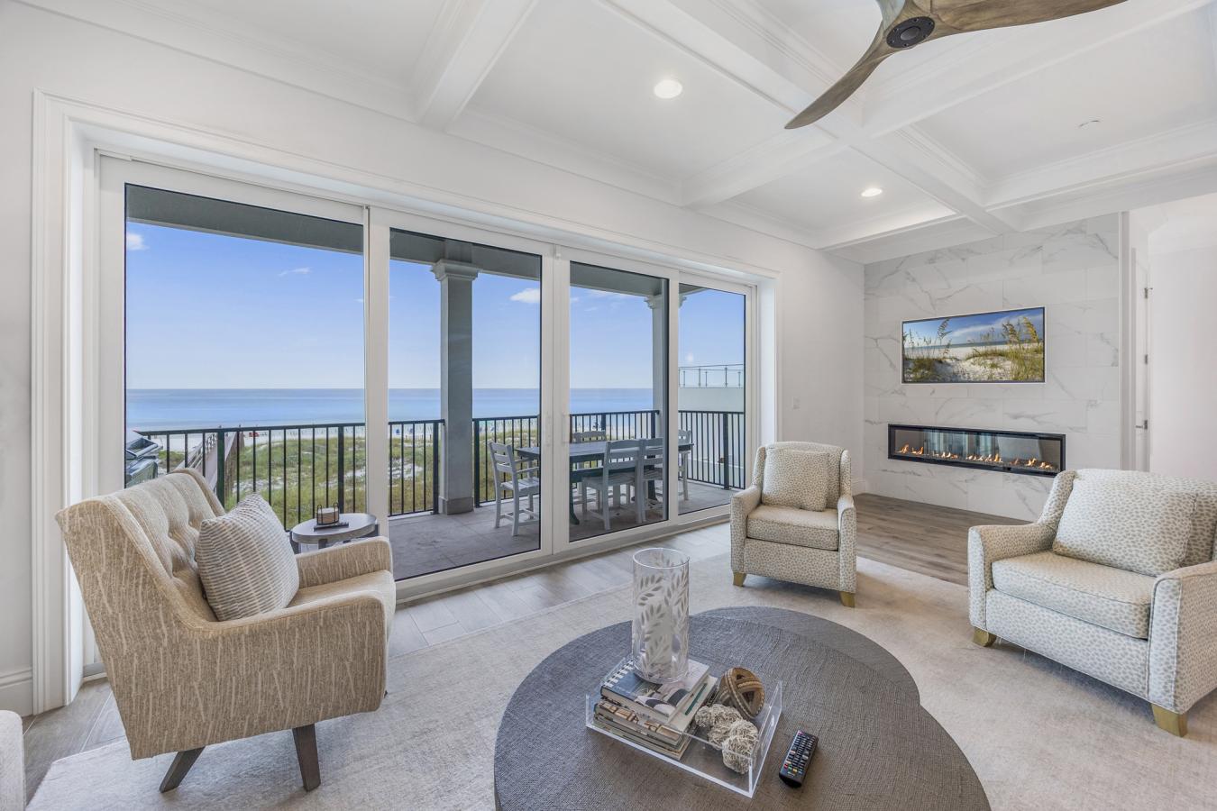 Perched along 109 feet of pristine Gulf frontage, this exceptional 4-bedroom, 4,272 sq ft coastal retreat offers a rare blend of space, privacy, and direct beach access via a shared dune walkover with Unit B, all set on nearly an acre of coveted shoreline. A rooftop pool & multiple Gulf-facing balconies provide a stunning backdrop of panoramic coastal views. Designed by Eric Craig of B. Designed, the home reflects a sophisticated blend of architectural precision & coastal elegance. Interiors feature soaring 9-10ft ceilings, wood-look porcelain tile, spruce accents, custom mosaics, and curated designer lighting, creating a refined yet relaxed atmosphere throughout. Built with ICF construction & impact-rated glass, the residence prioritizes durability, efficiency, and comfort with multiple high-efficiency HVAC systems, integrated dehumidification, tankless gas water heating, and full smart-home capabilities. A crisp white exterior, paver drive, and spacious 3-car garage with additional parking enhance both form and function. The first level is tailored for entertaining, featuring a spacious game room with a wet bar and full bath, ideal for a seamless transition from beach to home. A private elevator connects all four levels, each offering light-filled living spaces and Gulf-front vantage points. The rooftop terrace serves as a showpiece, complete with a stainless steel pool, expansive sun deck, and glass railings framing unobstructed views of the shoreline. The main living level showcases an open-concept design where the kitchen, dining, and great room flow effortlessly together, all oriented toward the Gulf through expansive glass. Elevated details include a coffered ceiling, LED fireplace, and professionally curated interiors. The chefs kitchen is appointed with Sub-Zero refrigeration, a Wolf dual-fuel range with an 8-burner gas cooktop, a wine cooler, custom cabinetry, and a striking backsplash. Upstairs, two Gulf-front suites with private balcony access are complemented by a versatile living space with a wet bar, offering both comfort and flexibility. The top level is dedicated to a luxurious primary suite with sweeping Gulf views, a spa-inspired bath, and a generous walk-in closet, along with an additional Gulf-front guest suite and convenient pool bath. Offered fully furnished and professionally designed, this turnkey property presents an outstanding opportunity as a primary residence, a second home, or a high-performing investment. With proven rental success generating 229K in 2025 and 85K already on the books for 2026, the property delivers both immediate income potential and long-term value. Smart-home integration allows for effortless remote management of climate, security, pool, and garage systems. Tucked along a private, palm-lined street shared by only three other Gulf-front residences, Azzurro offers a rare balance of privacy and accessibility. Located in the heart of Seagrove Beach, it is just moments from the vibrant communities of Seaside, Alys Beach, and Rosemary Beach, as well as beloved local destinations including Old Florida Fish House, Buddys Seafood Market, and Beachy Bean Coffee. Nearby coastal dune lakes, state parks, and scenic bike trails further enhance the lifestyle. Azzurro is a true Gulf-front retreat, where timeless design meets modern luxury in one of 30As most sought-after settings.