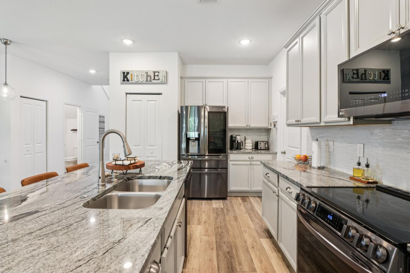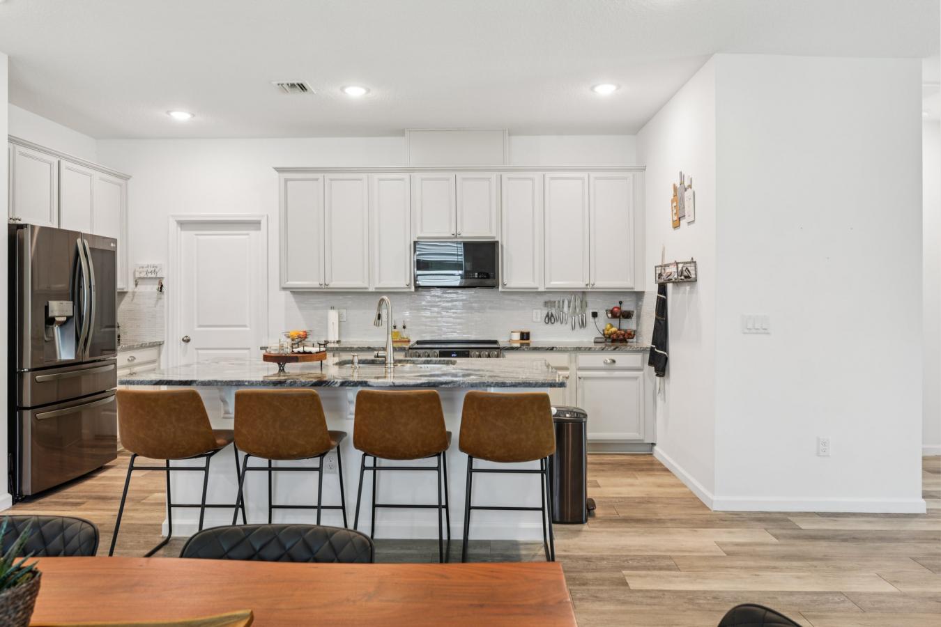 Here is a recently built 4-bedroom, 2.5-bath smart home with a 2-car garage and great lake view. Home comes with solar panels that will give you savings on day one. This move-in-ready residence features a modern open layout with a spacious pantry and a first-floor primary suite. Recent updates include refreshed finishes, vinyl flooring, granite countertops, and newer LG smart appliances.