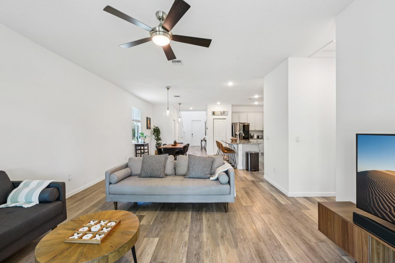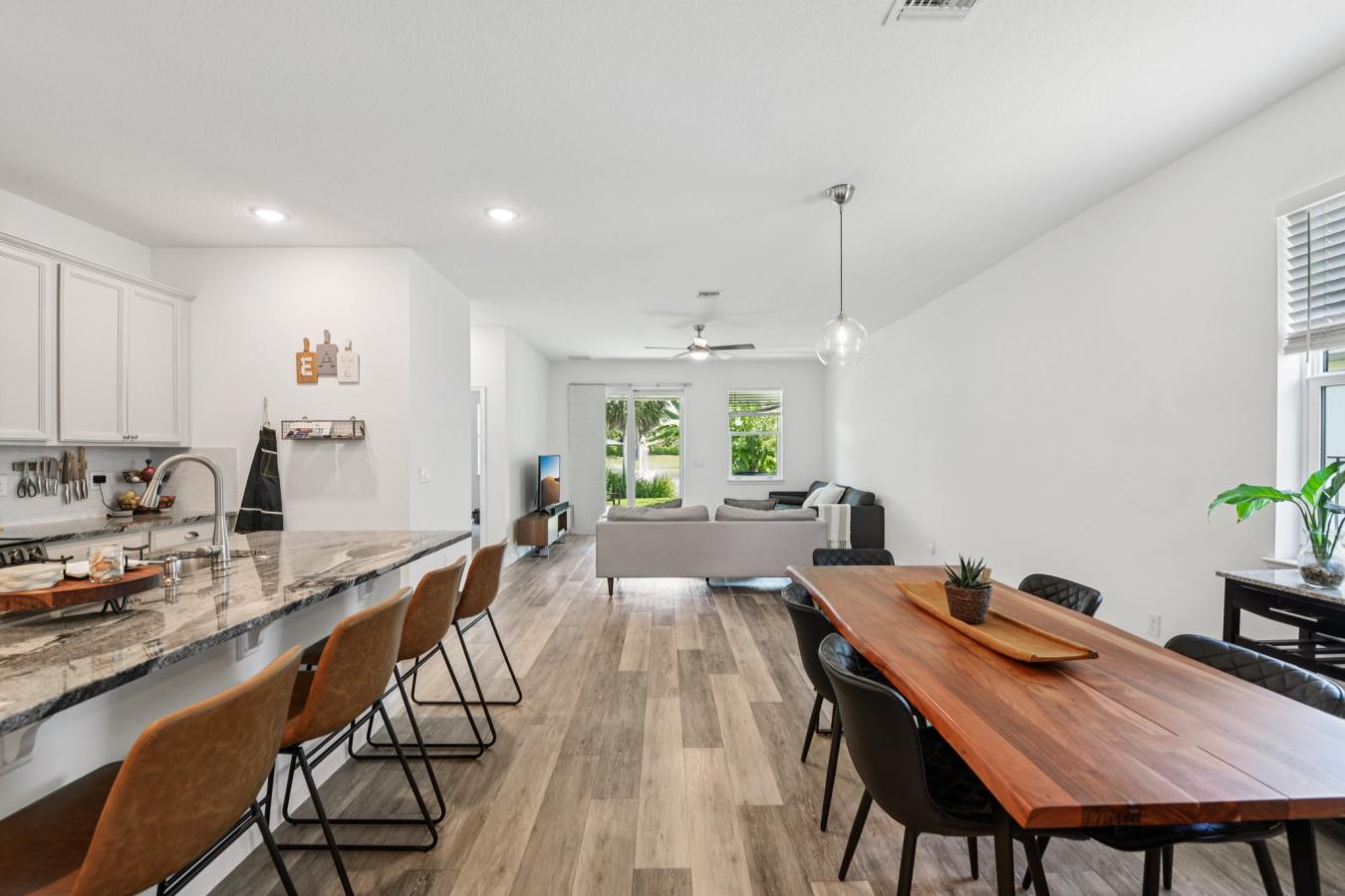 7408 Sungold Meadow Court | WestBay Home 4 Beds | 2 Baths | 2,072 Sq Ft | Private Saltwater Pool | Waterset 7408 Sungold Meadow Court is a well-maintained pool home built in 2018 by WestBay. This popular Sandpiper floorplan is set just a short distance from the main Community Amenity Center! Inside, you’ll find 4 bedrooms and 2 full baths across 2,072 square feet, featuring high ceilings and tall door frames throughout. The open-concept floorplan centers around a spacious kitchen with 42” light shaker cabinets, quartz countertops, stainless steel appliances, gas range, designer backsplash, huge island for prepping meals and eating space, a large walk-in pantry, and ceramic tile flooring that flows through the main living areas. The owner’s suite is tucked privately away and offers ample space and comfort. The owners ensuite bath has large walk in closet space and dual vanities. Secondary bedrooms are at the front of the house making this a flexible floorplan where one can easily be converted to office space. Sliding glass doors open from the living room to a covered lanai and fully fenced backyard, where you’ll enjoy your private saltwater pool with fiber-optic lighting. Waterset is known for its resort-style amenities—including four pools (lap pool and water slides included), two fitness centers, a game room, tennis, basketball, pickleball, sand volleyball courts, 20 acre outdoor sports complex, shops, more than ten parks and playgrounds, 12 miles of trails, and off-leash dog parks. Additional Home features include natural gas HVAC, hurricane shutters, ceramic tile flooring, and a two-car garage. This home truly has everything you need for comfortable Florida living.