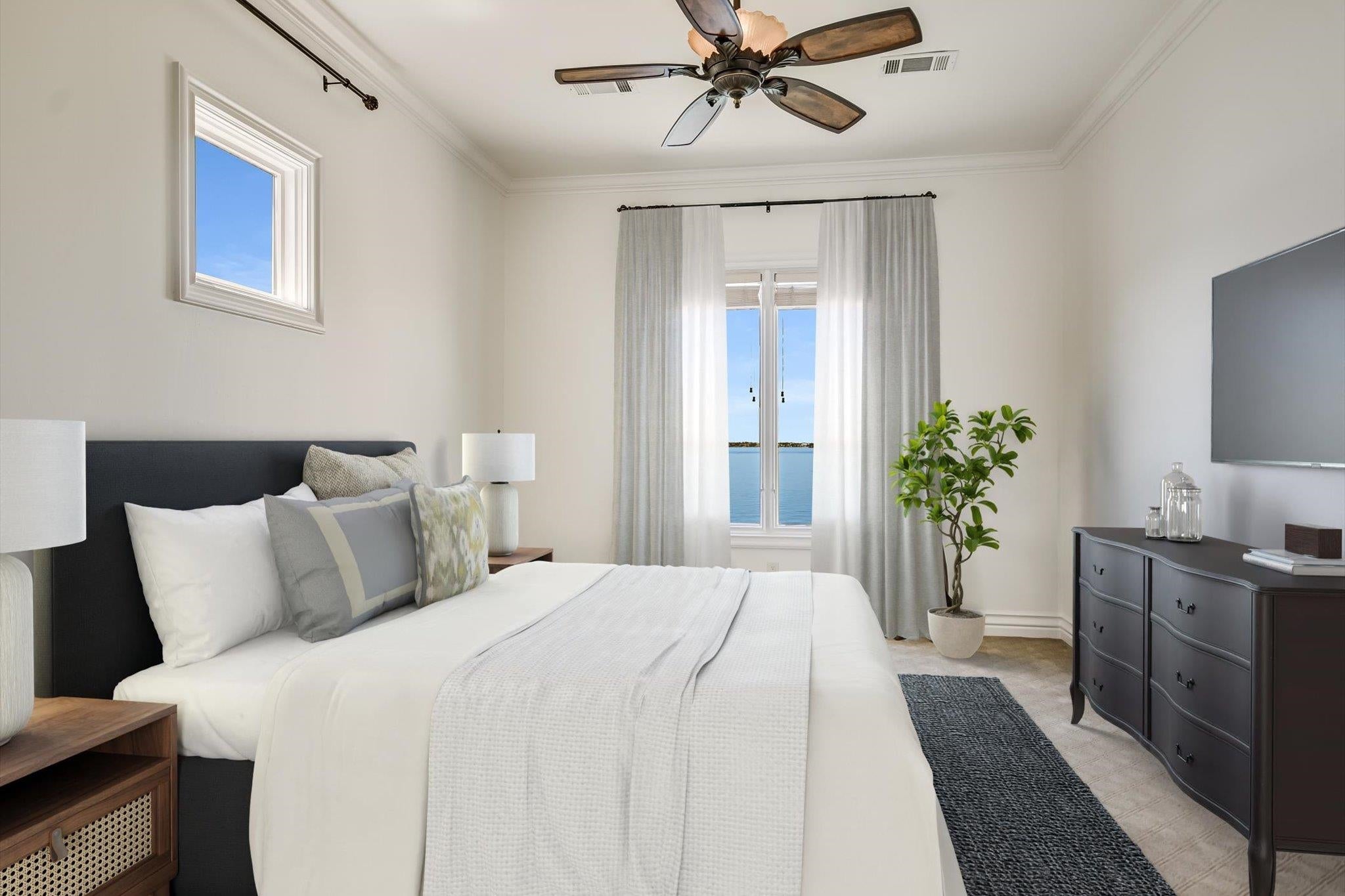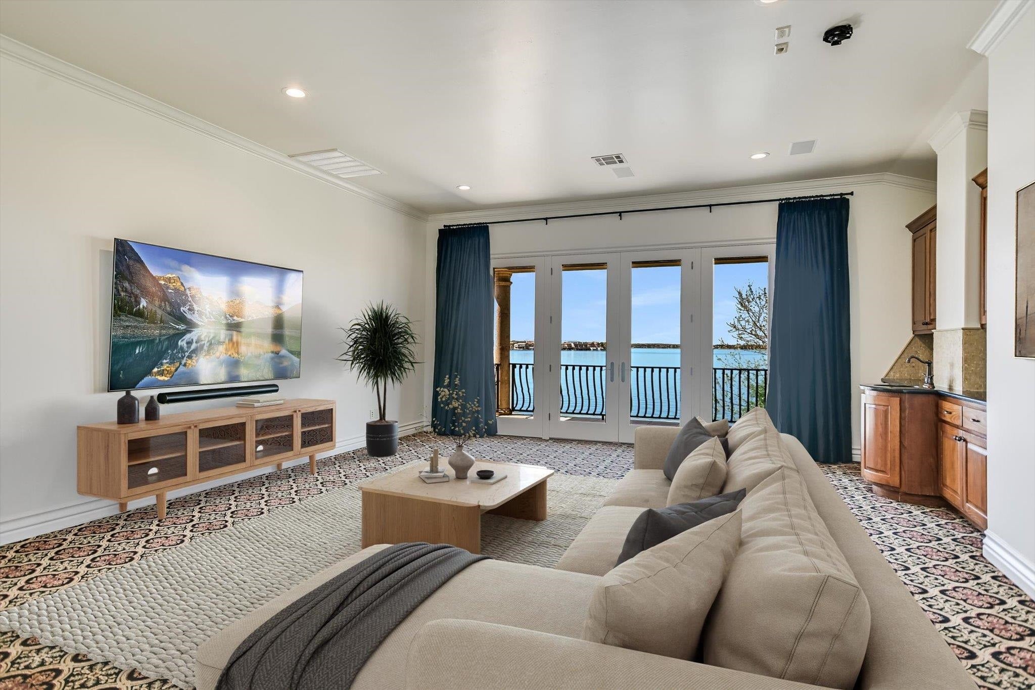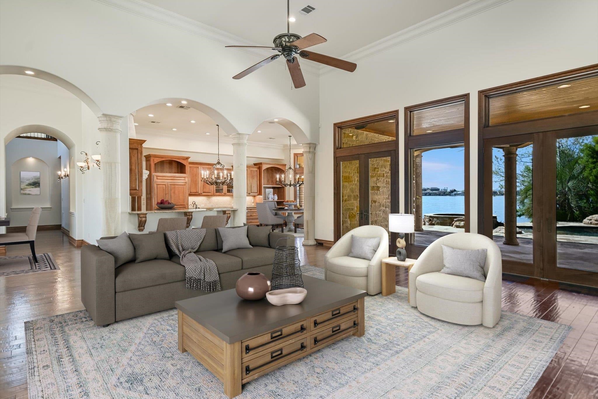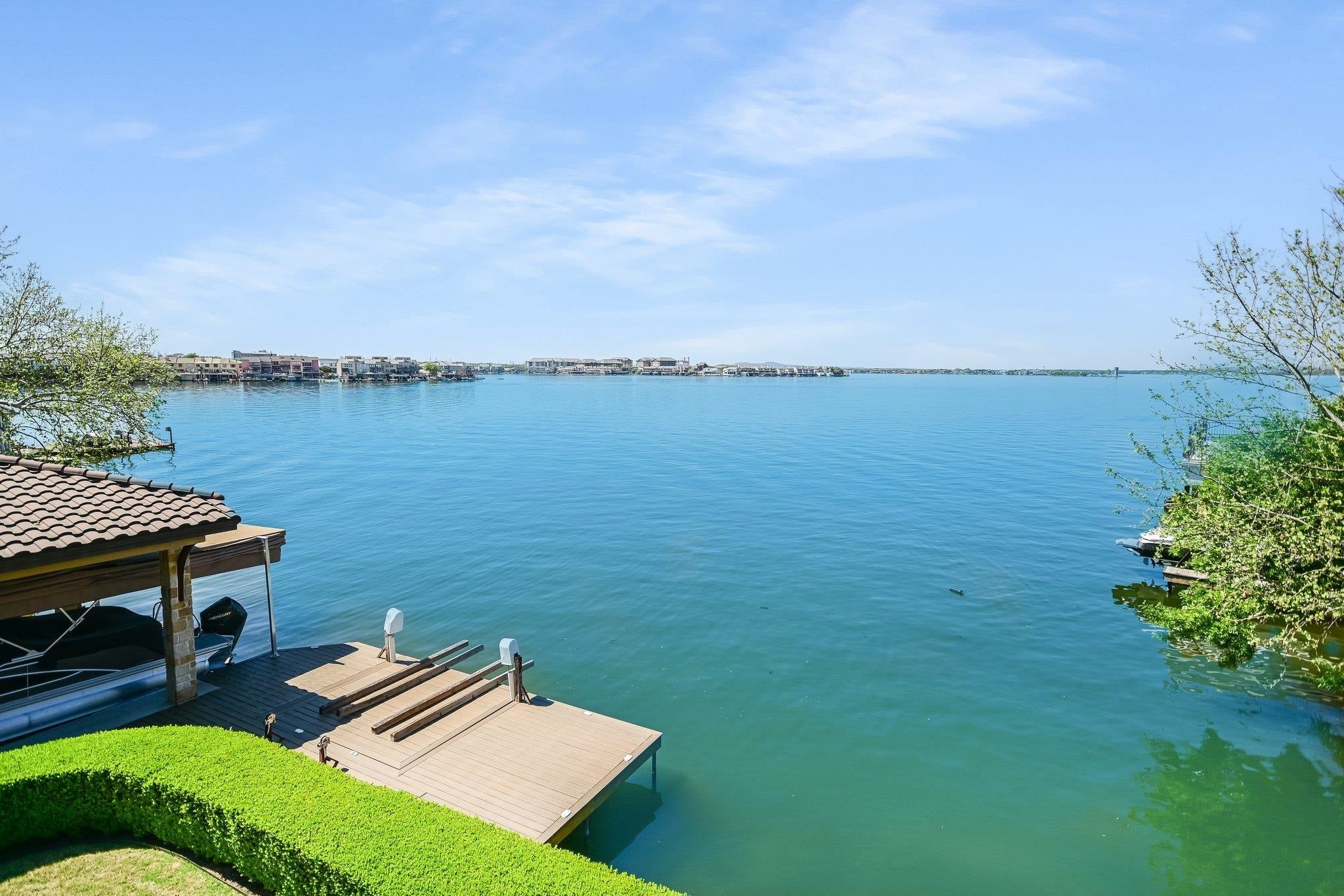 Positioned on 136 feet of prime open-water frontage along Lake LBJ, this custom Horseshoe Bay residence captures expansive lake views from nearly every room. Set on a quiet cul-de-sac and framed by lush, park-like landscaping, the property offers a private waterfront setting.
