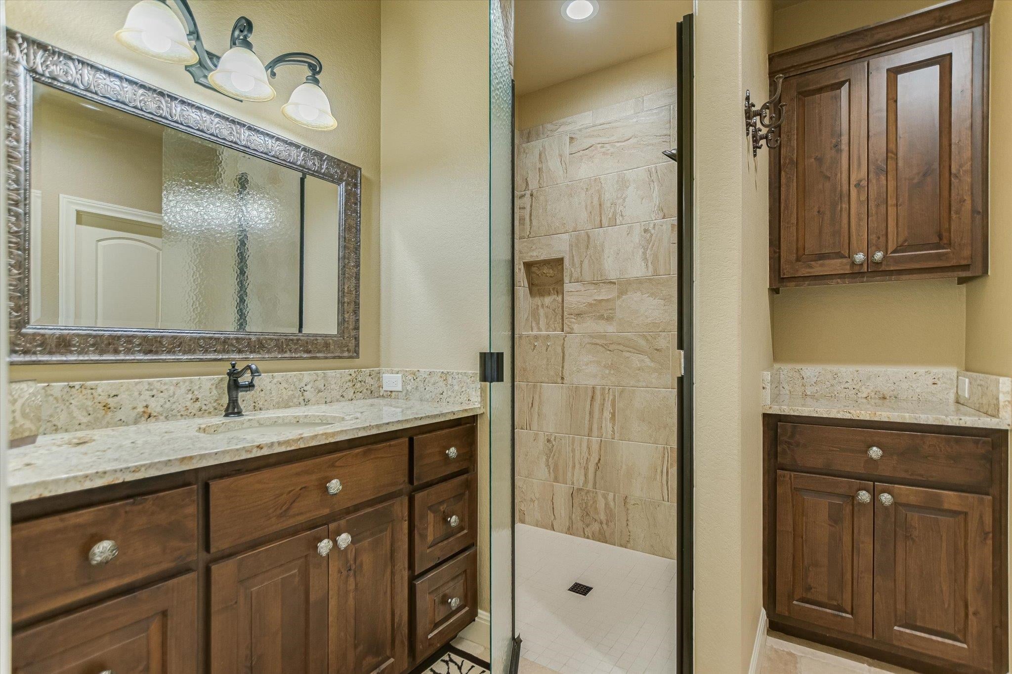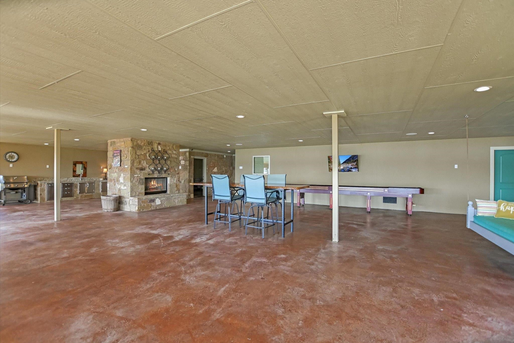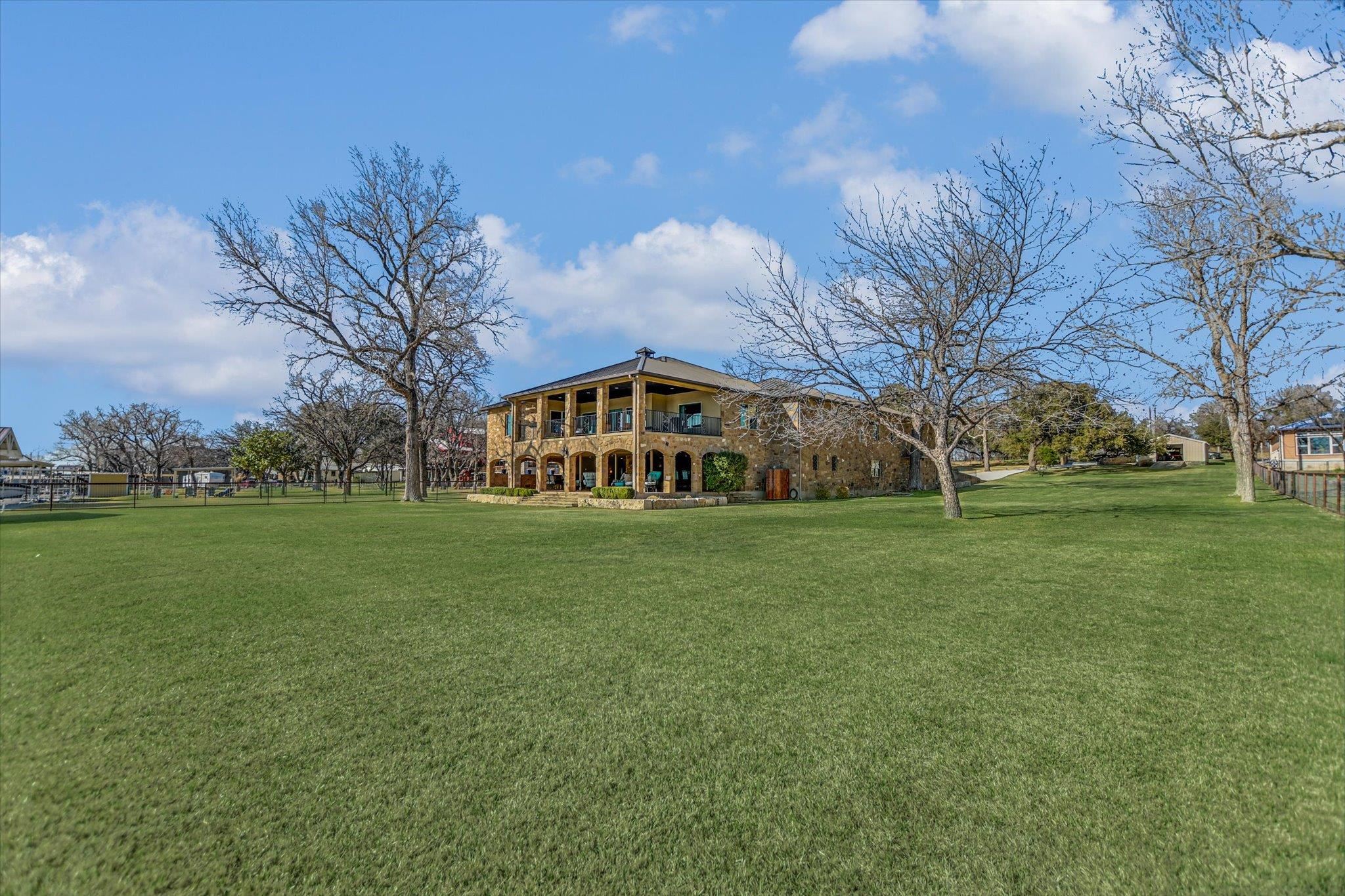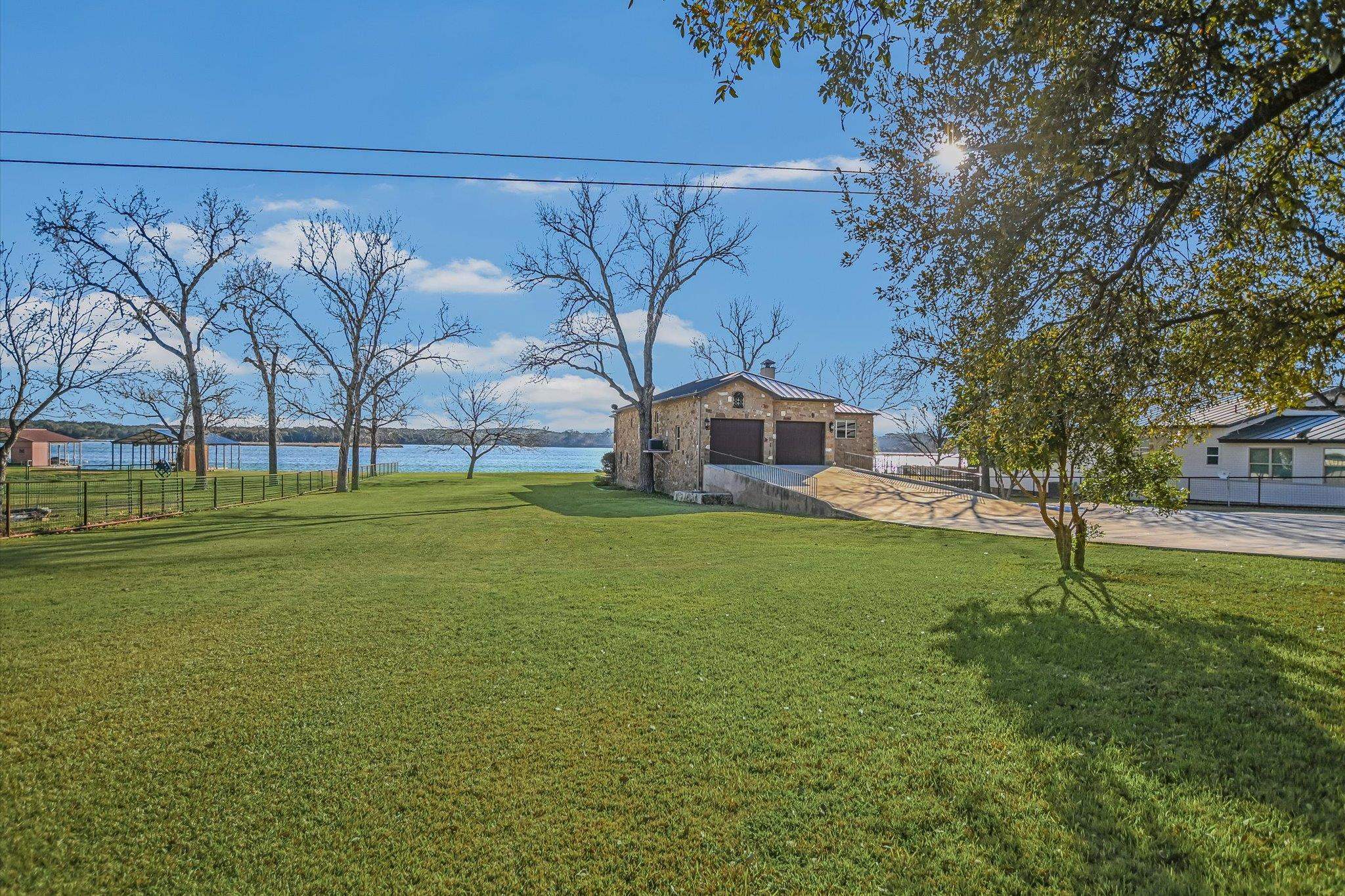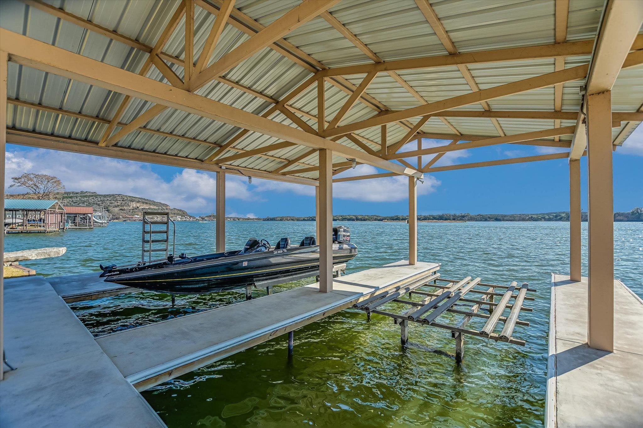 Positioned on two Lake LBJ waterfront lots, 360 Campa Pajama offers 140 of shoreline and sweeping southwest-facing views across the main body of the lake. Built in 2018 with 3-bedrooms, 3.5-baths, plus a dedicated study, the 3,295 sq. ft. home blends comfortable lake living with exceptional indoor & outdoor entertaining spaces. The open-concept living area features soaring ceilings and a wood-burning fireplace, with expansive windows that frame the lake views and fill the space with natural light. The kitchen is anchored by a large center island and offers a convenient butlers pantry for prep and storage space, and a Bosch appliance package including a gas cooktop. Each bedroom features its own ensuite bath, while the study offers a built-in Murphy bed, providing flexible guest accommodations. The spacious primary suite offers a spa-like bath with double vanity, soaking tub, walk-in shower, and generous closet space. The homes appeal extends to its outdoor living areas. A covered patio off the main living area provides front-row seats to Hill Country sunsets, while the lower level offers extensive covered outdoor living and storage space including an outdoor kitchen, wood-burning fireplace, powder bath, outdoor shower, and flex room with mini split. A lush, flat lawn extends from the home to the waters edge, creating an easy connection to the covered two-stall boat dock and a unique diving board. A gated entry and detached storage building provide secure space for boats, lake toys, and equipment.