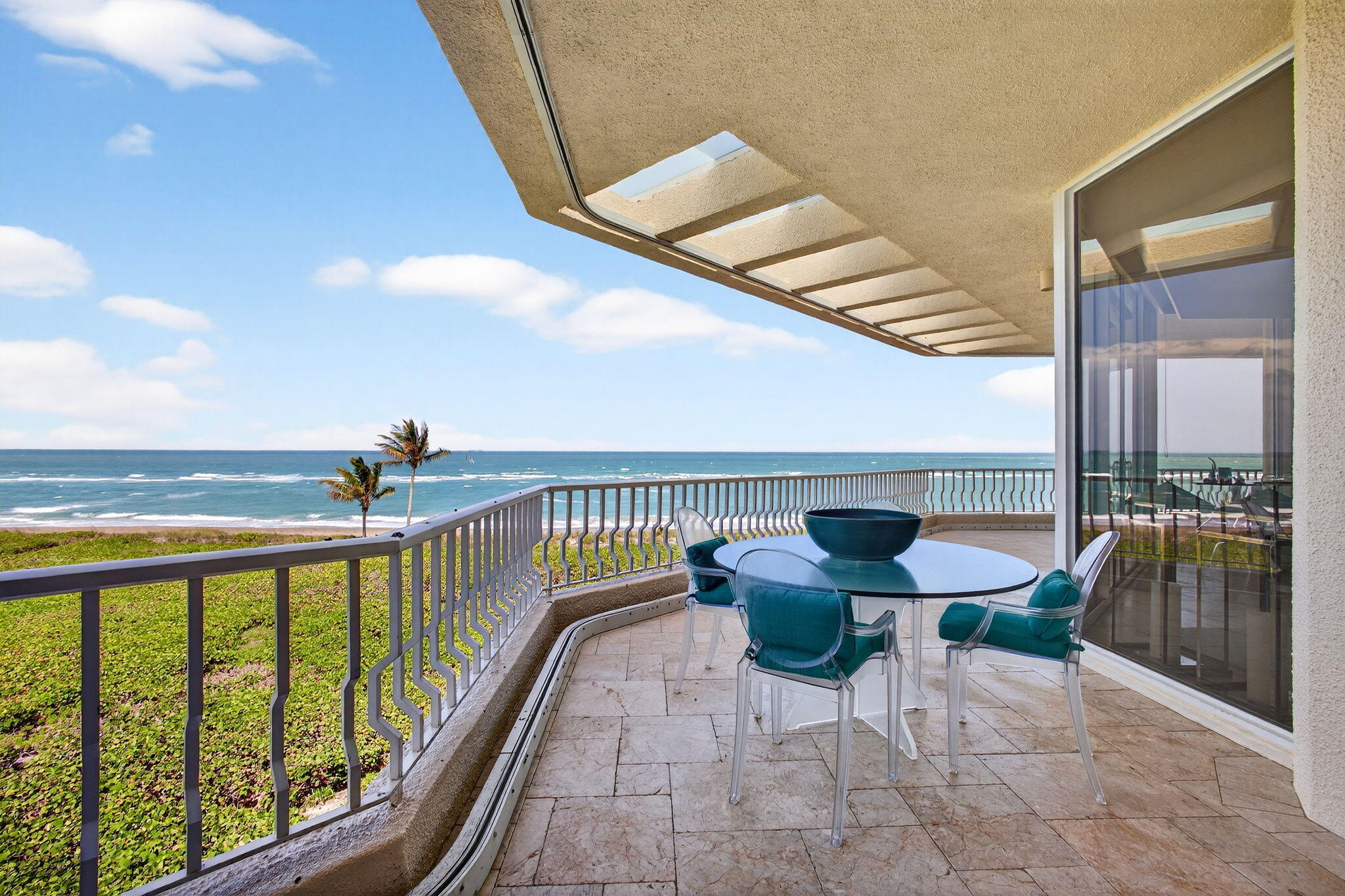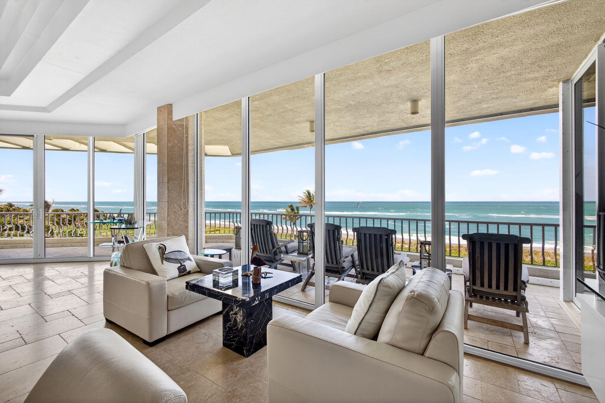 Experience elevated coastal living in this three bedroom, three and a half bathroom Sailfish Point PENTHOUSE with unobstructed Atlantic Ocean views. Arrive via elevator access shared by just two residences per floor, into a light-filled interior with volume ceilings, skylights, and open-concept living. Expansive impact glass windows create seamless indoor-outdoor flow, ideal for entertaining or quiet mornings by the sea. The layout includes a bedroom suited as a secondary owners suite and a third bedroom with private balcony for sunset views. Architectural details such as travertine floors, etched glass, trim, and molding add character and timeless appeal. Two under-building parking spaces and air-conditioned storage included. Residents enjoy exclusive access to world-class amenities... including a Nicklaus Signature golf course, beachfront clubhouse, multiple dining venues, full-service marina with ocean access, fitness and aquatics complex, spa, tennis, pickleball, and 24/7 security