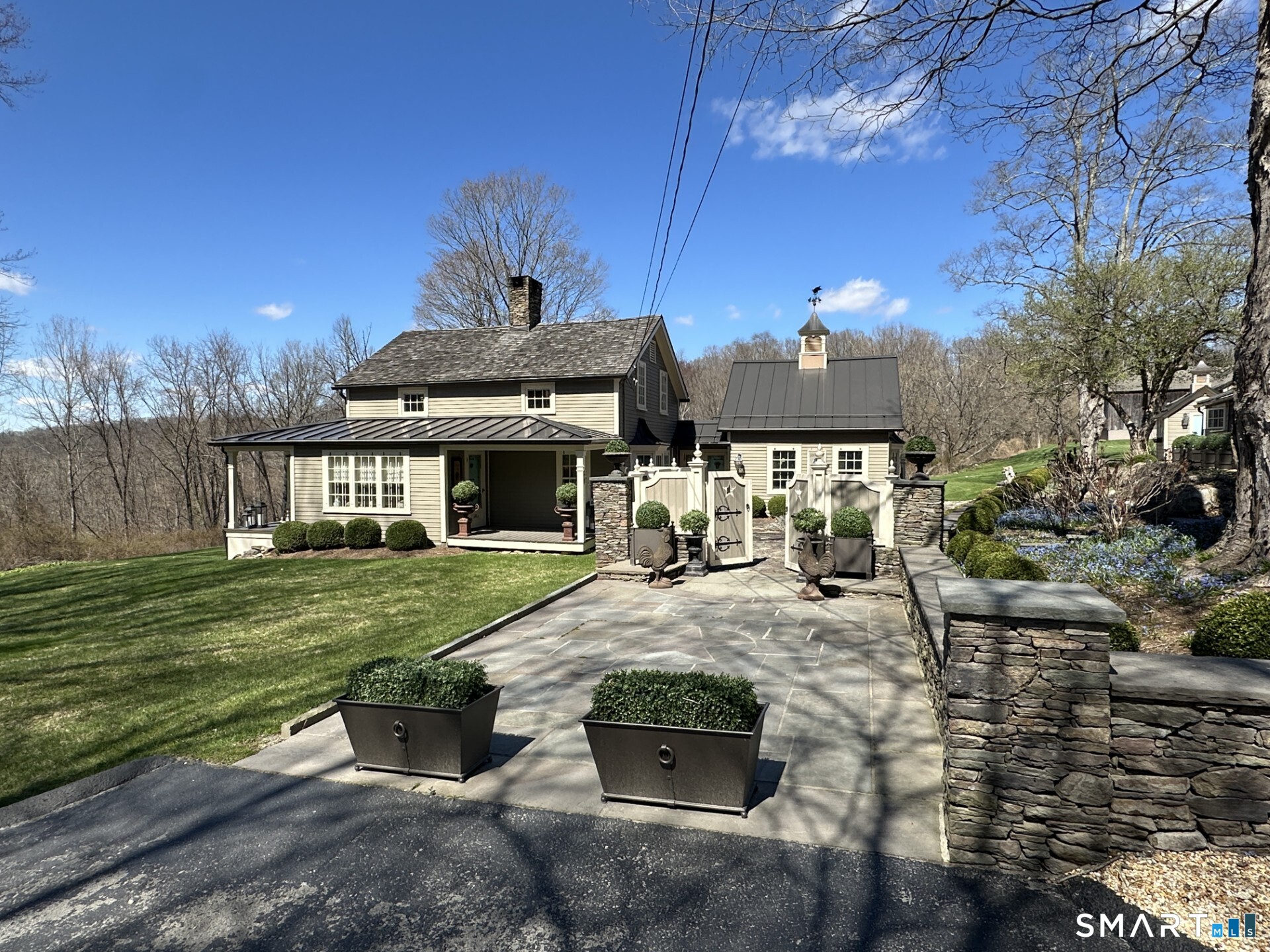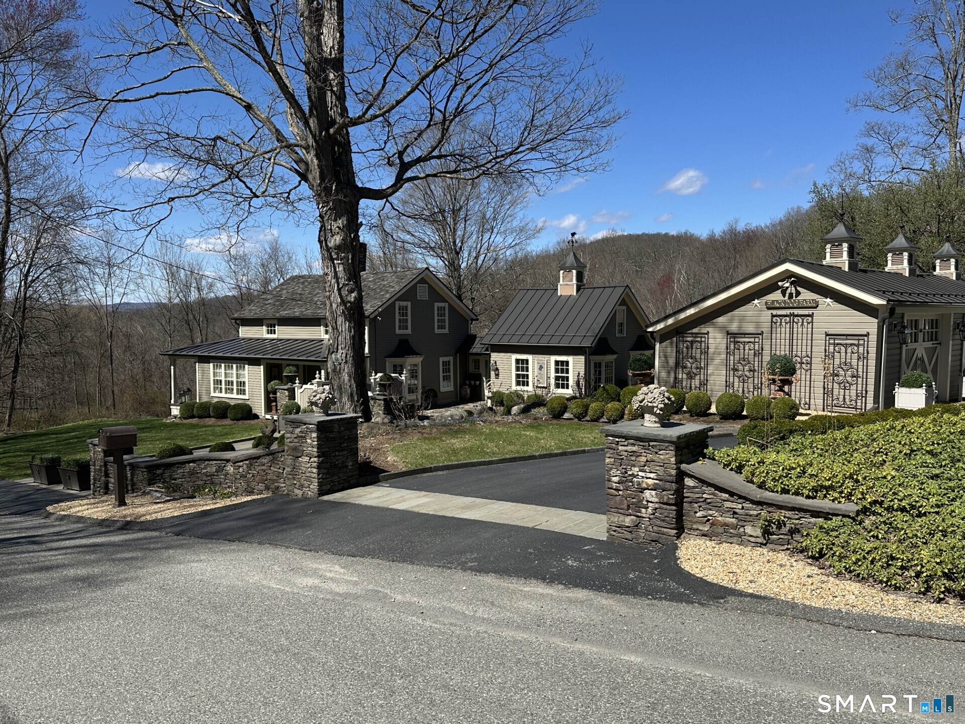 Black Dog Farm, owned by artist Elaine Voghelle, an exceptional estate offering a refined storybook ambiance. The fully restored 1803 Antique Eyebrow Colonial Farmhouse is set on 4.6 acres of prime land along the Appalachian Trail. Renovations throughout the home are executed to the highest standard. The property includes several substantial outbuildings, including a three-level cottage, a two-car detached garage, a sauna and spa room, Tabacco Barn & an expansive horse barn with fully operational paddocks complete with water and electricity. The artists extraordinary vision brings the estate to life, creating a museum-quality residence that embodies elegance and sophistication. Rare materials and uncompromising attention to detail are evident throughout, including white oak hardwood floors sourced from MOMA, custom handmade mahogany windows fitted with imported wavy German glass, and advanced argon gas insulation. The chefs kitchen is thoughtfully designed with gnarled brass pulls, leathered limestone marble countertops, and a handmade, hand-painted tile backsplash. The retreat was constructed using Pennsylvania Lichen Stone, with stone walls and pillars carefully built to replicate the craftsmanship of centuries past. Bronze metal seamed-heated roofs, snow guards, and cupolas crown each structure, providing both durability and architectural distinction. The grounds are beautifully landscaped with rows of English dwarf boxwoods.