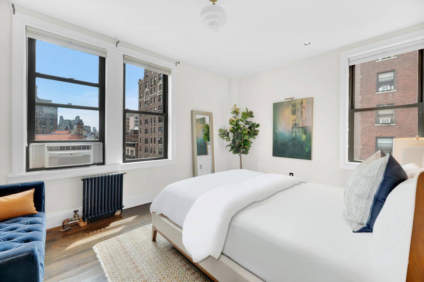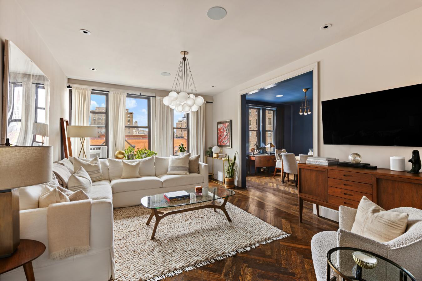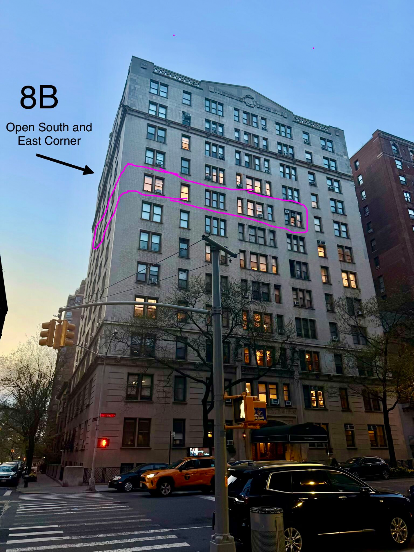 Sun-flooded High Floor Corner Classic 7 on West End Avenue just off West 82nd Street has been exquisitely renovated and smartly reconfigured to live comfortably as a true four-bedroom, three-bathroom home, with gracious space for entertaining. Grand proportions, high ceilings, and oversized windows add volume to this expansive footprint. Attention to detail is evident throughout, from recessed lighting to bespoke fixtures. The layout has been intelligently reimagined to maximize flexibility and comfort while keeping intact the double wide Living Room and Formal Dining Room (Enjoy the 26 foot-wide expanse of gathering space with custom dimmable recessed lights, chandeliers, and built in ceiling speakers). The windowed eat-in kitchen is exquisitely appointed with stone countertops extending seamlessly through the backsplash, and chic custom cabinetry accented with interior lighting. Stylish and trimmed out with the highest level of finish, this chefs-grade kitchen is also practical, featuring high-end appliances including a 42" wide Sub-Zero refrigerator, 36" Bertazzoni induction range, Wolf ventilation hood (vented out) and Sharp microwave drawer. A custom built-in banquette is perfectly positioned beneath the windows, creating an inviting dining area overlooking the charming architecture across West End Avenue. The best surprise, hidden in an oversized, extra deep pantry cabinet, is an XL-sized washer/dryer (vented out) with approximately 4.5 cubic feet capacity offering meaningfully greater volume than typical w/d units found in nyc residences (the ultimate luxury!!!!). The primary wing serves as a private retreat, featuring corner East and South facing windows, brilliant sunlight, an expansive custom walk-in closet and a spa-like windowed bathroom with double vanity, soaking tub, and steam shower. Wake up to gorgeous views of the exquisite buildings with sight lines that extend to the Beresford. Secondary bedrooms are flooded with natural light from bright Southern exposure throughout the day. Well- proportioned, they easily fit king-sized beds, or have ample space to lay out a den with an open up sofa sleeper. Full bathroom off the hallway services bedrooms 2 and 3, and functions as a powder room for guests. Luxurious finishes include Calacatta penny tile, Gold Kohler fixtures, and 3 different luxurious shower heads. A former maids room has been expanded into a true fourth bedroom/bathroom suite serving the current owners as a guest wing, with ample space for a queen bed, end tables, and large bureau. The former maids bathroom was fully relocated and expanded to incorporate a generous sized 3 foot deep shower stall with wall hung toilet, and elegant custom laid mosaic tile floor. The home is outfitted with all new electric and plumbing, including thoughtful details such as an entry "electric kill switch" control for departure and arrival in the foyer. Ceilings are dropped enough to accommodate the future installation of central air conditioning, as the current owners had planned, but didnt take the added time needed to complete. With everything else rebuilt and refinished, the original hardwood herringbone floors have remained beautifully preserved, retaining the charm and history of the homes prewar heritage. 465 West End Avenue, also known as The Umbria, is a well-maintained prewar cooperative designed by the esteemed architect D. Everett Waid. The building has undergone significant upgrades, including modernized self-service elevators (transitioned from attended operation) and a fully restored and renovated lobby, enhancing convenience and adding to curb appeal in this grand prewar co-op with impeccable staff and generous sized, sprawling homes. Apartments rarely come available in this beloved UWS building as it is a coveted address with very low turnover!