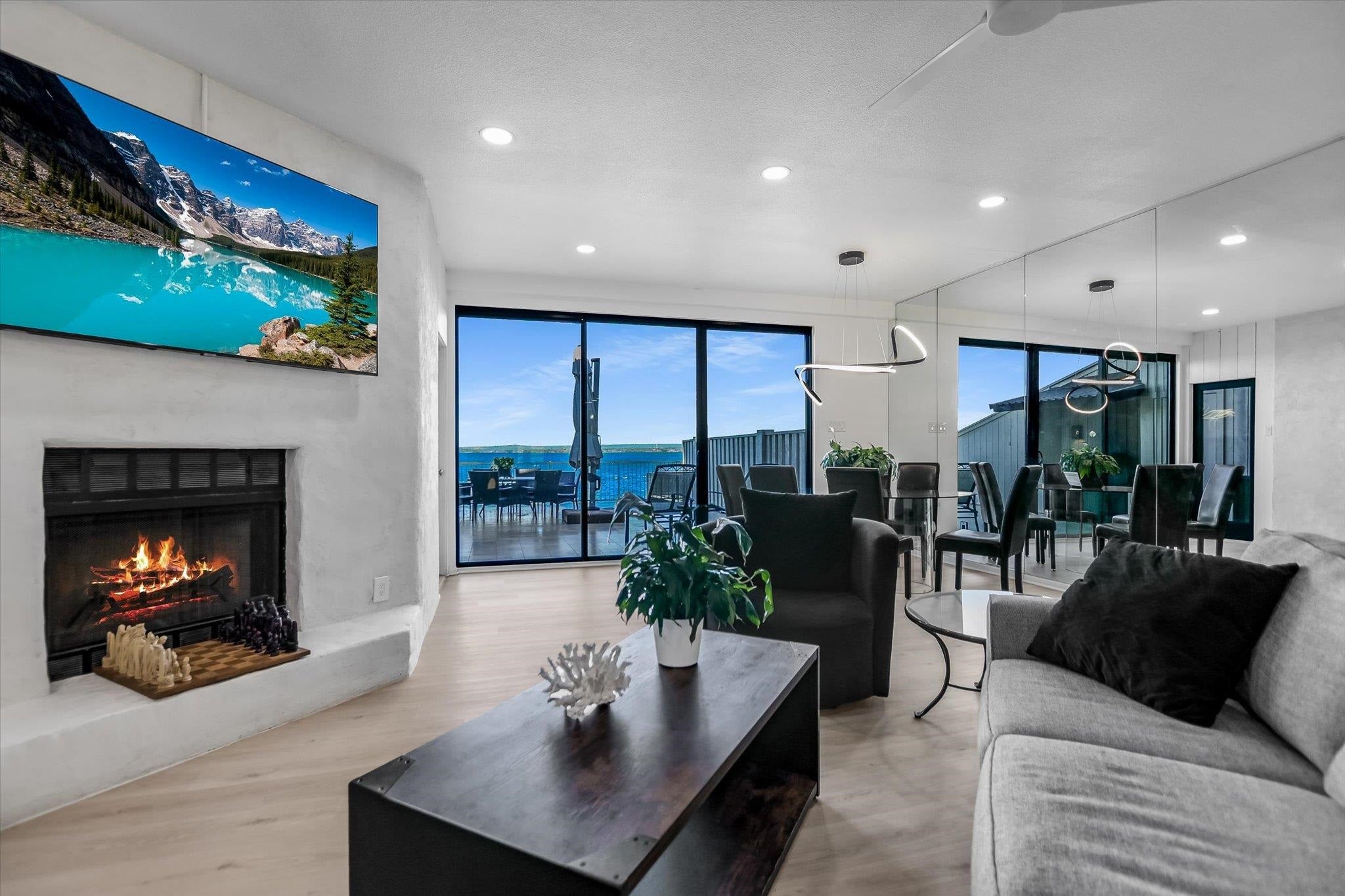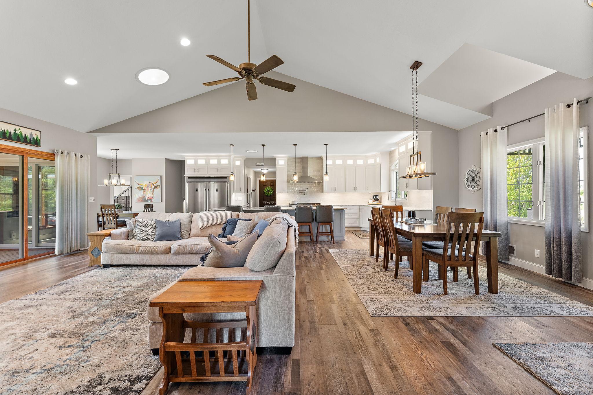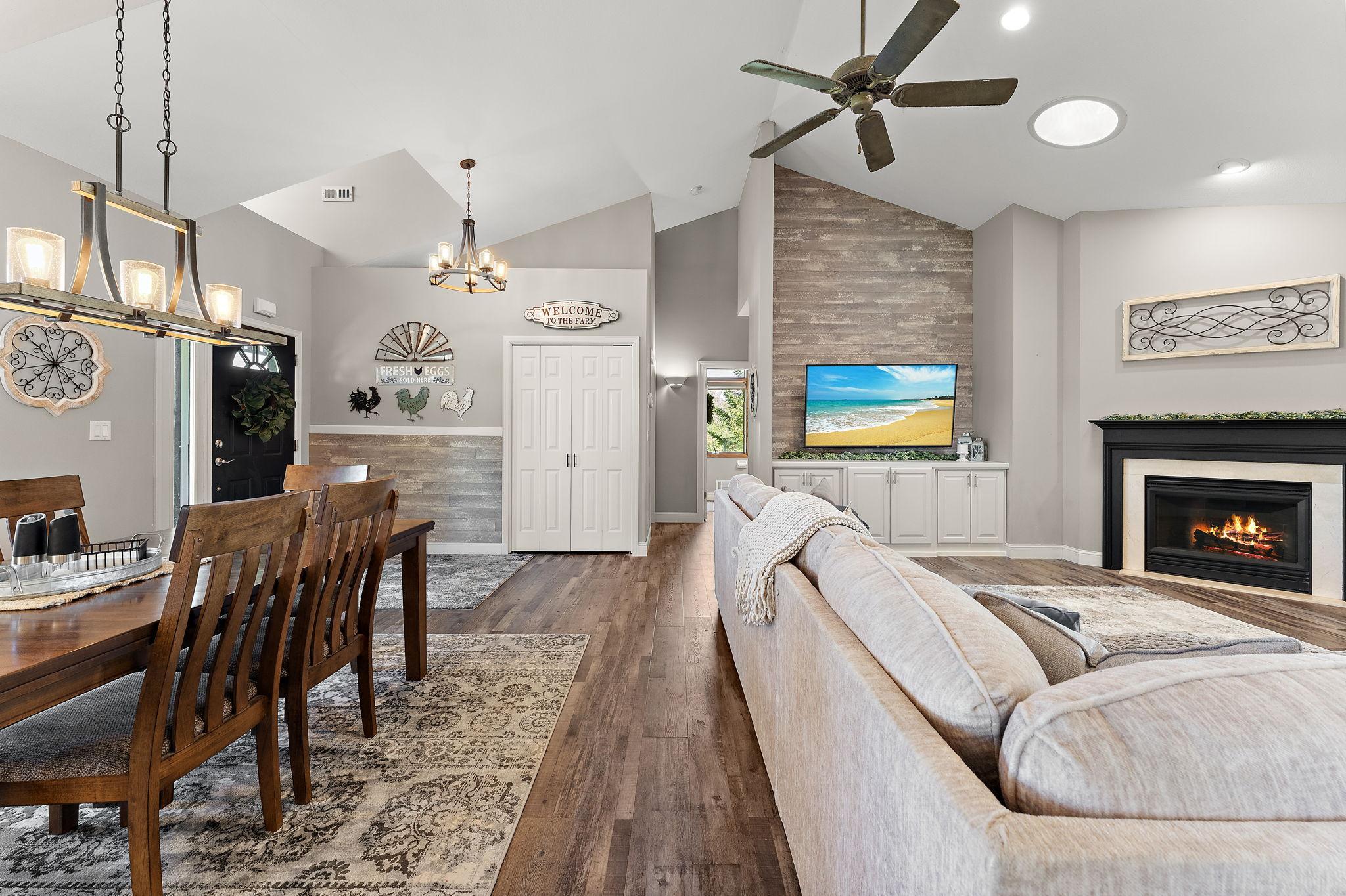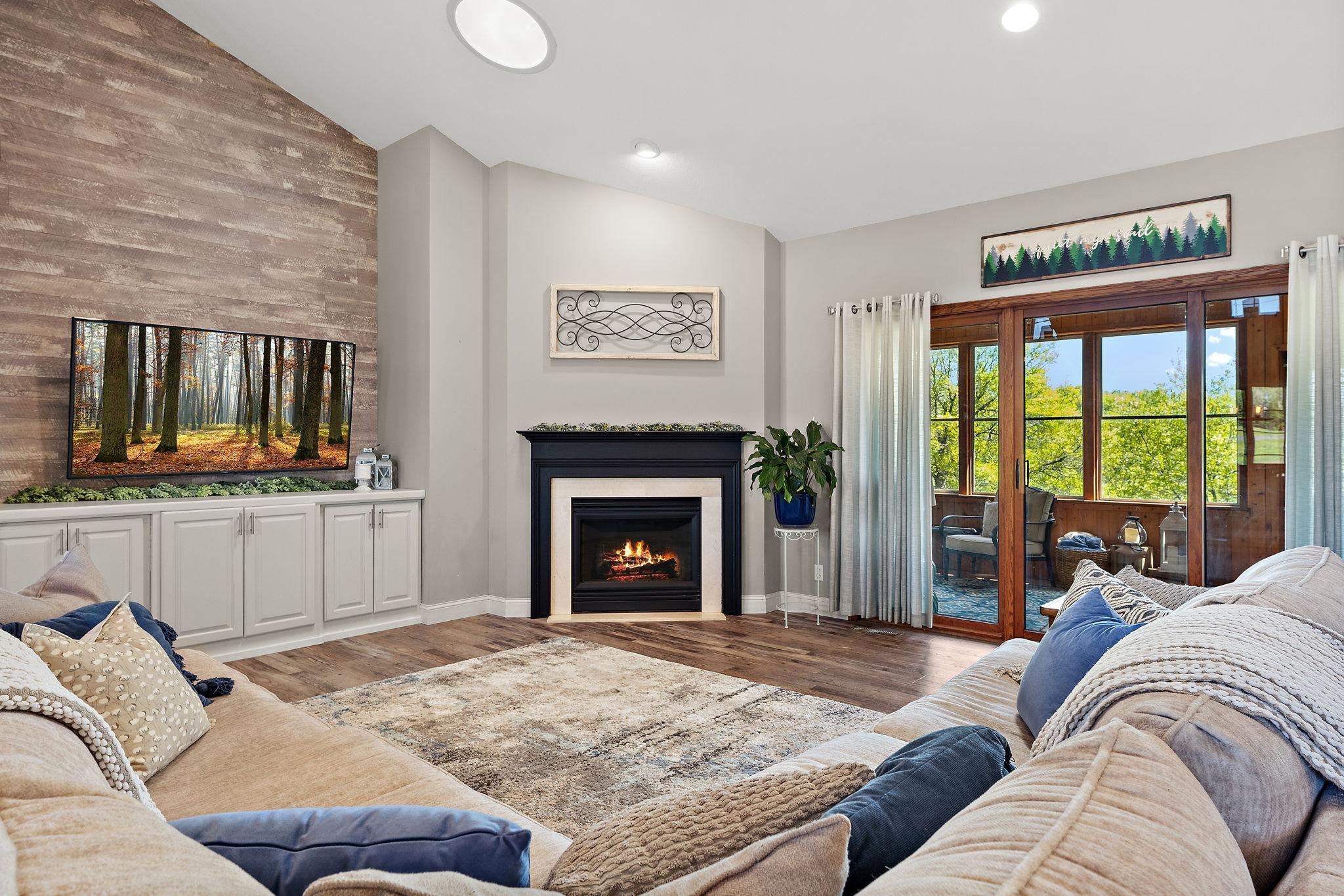 Remarkable turn-key lake home that truly checks every box! Recently updated with thoughtful design and luxury finishes, this home impresses with vaulted ceilings, walls of windows, and stunning lake views. The inviting hearth room flows into a gourmet kitchen featuring high-end appliances, extensive custom cabinetry, and a spacious dining area centered around a beautiful stone fireplace.
