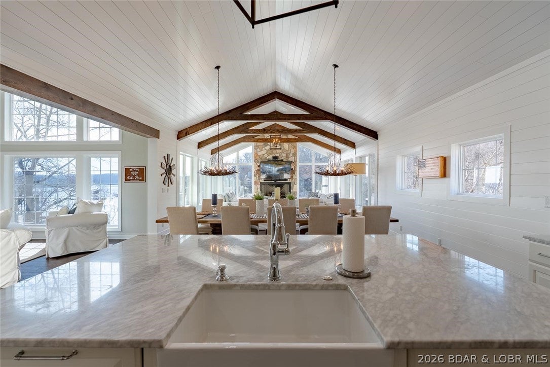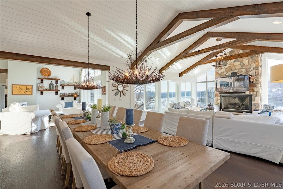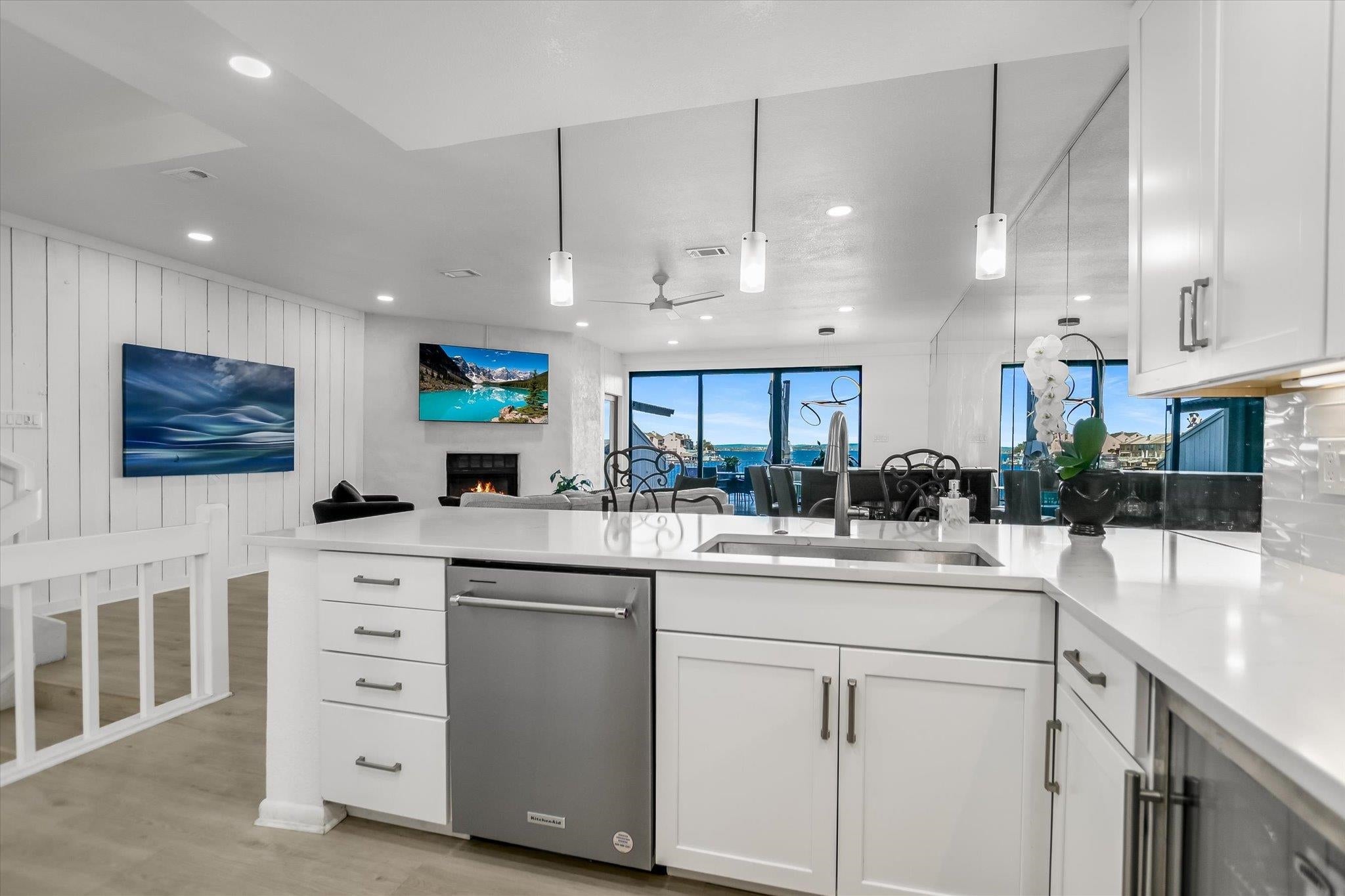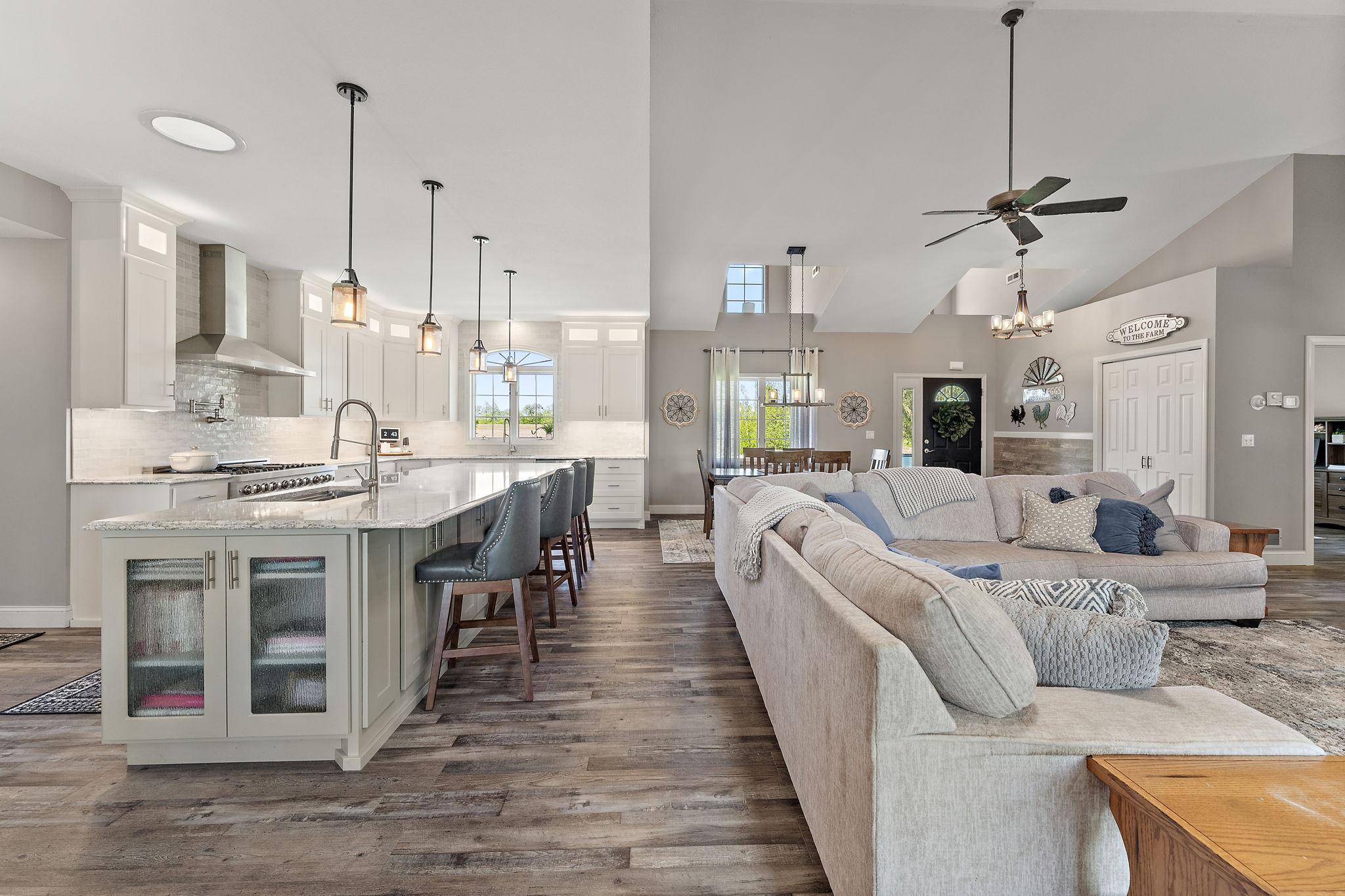Remarkable turn-key lake home that truly checks every box! Recently updated with thoughtful design and luxury finishes, this home impresses with vaulted ceilings, walls of windows, and stunning lake views. The inviting hearth room flows into a gourmet kitchen featuring high-end appliances, extensive custom cabinetry, and a spacious dining area centered around a beautiful stone fireplace.