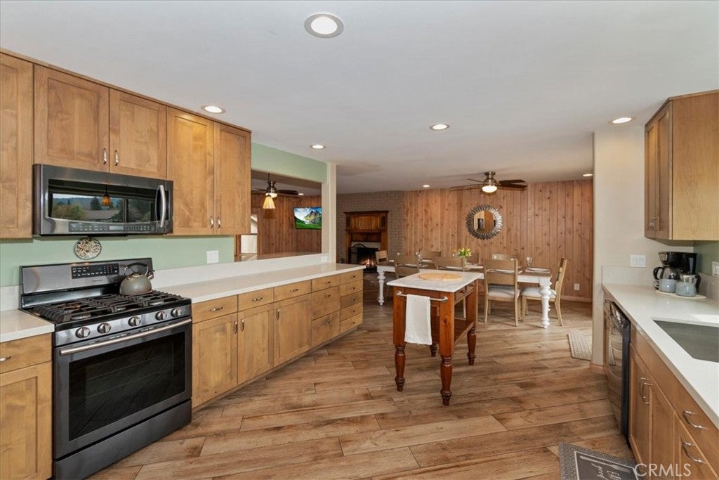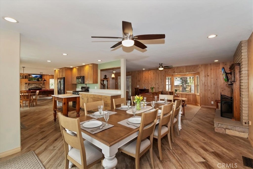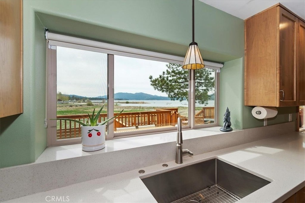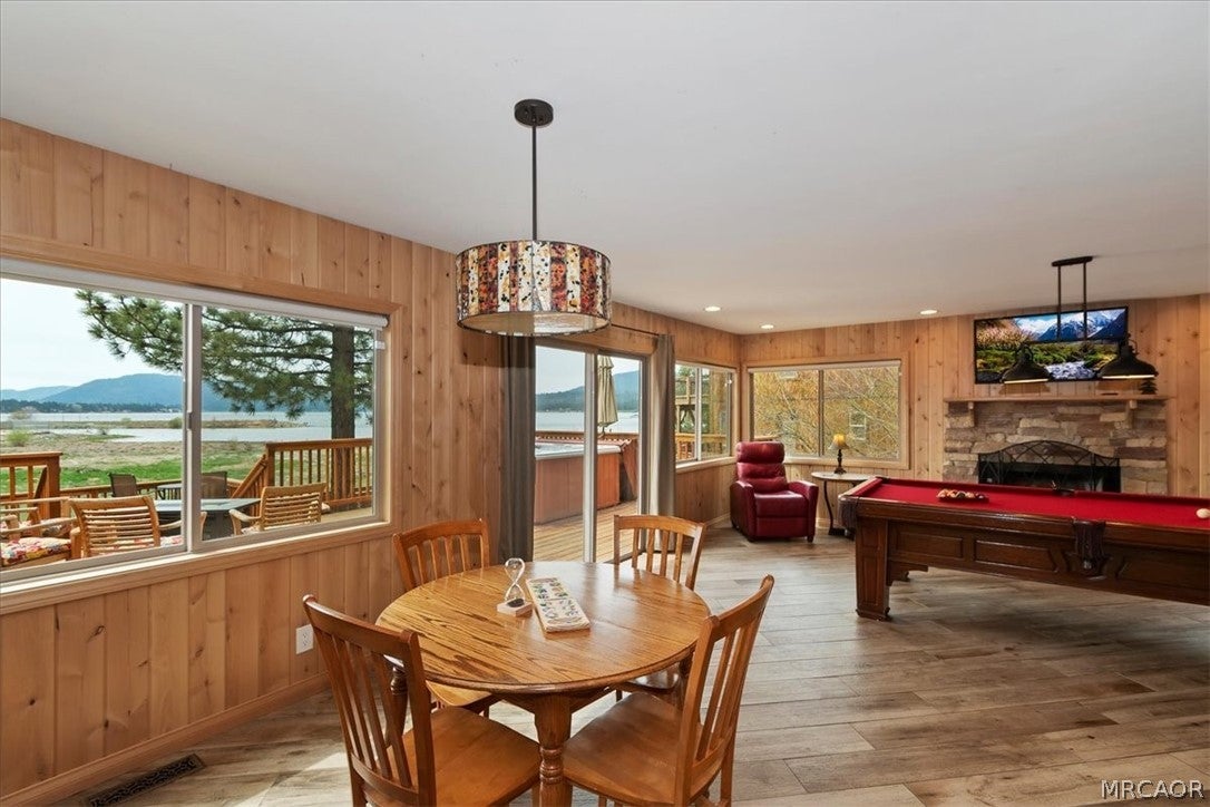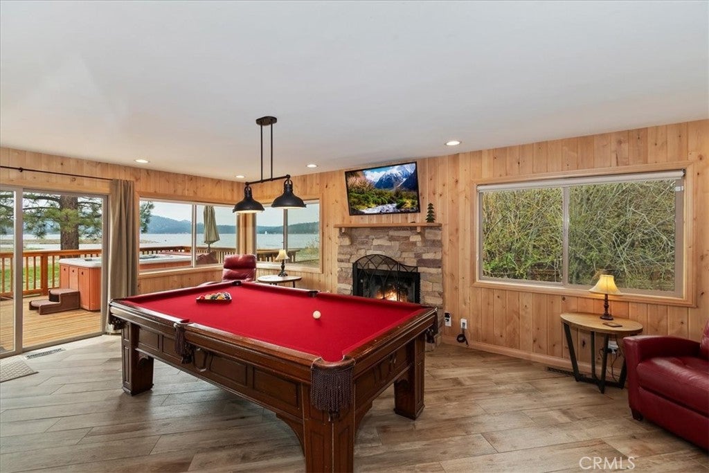Welcome to lakefront living at its finest in the highly sought-after Eagle Point. Perfectly positioned on a generous 14,168 sq ft lot, this beautifully updated 4-bedroom, 3-bathroom home offers 2,755 sq ft of thoughtfully designed space and an unbeatable front-row seat to Big Bear Lake. Step inside to an open-concept floor plan designed for both comfort and entertaining, featuring a spacious living area anchored by one of three fireplaces, creating the perfect mountain ambiance year-round. The expansive kitchen is ideal for hosting, complete with alder cabinetry, ample counter space, and seamless flow into the main living and dining areas. This home was made for gathering and unwinding, with a separate game room featuring a pool table and its own fireplaceperfect for aprs-ski evenings or summer nights after a day on the lake. The primary suite is a true retreat, offering its own fireplace, added soundproof insulation for privacy, and a cozy, elevated feel. Thoughtful upgrades are found throughout, including cedar-lined closets, porcelain flooring downstairs, waterproof vinyl flooring upstairs, and a striking oak staircase that ties the home together with warmth and style. Step outside onto the back deck and take in what may be some of the most breathtaking sunset views in Big Bear. With lakefront access and dock rights, this property offers the ultimate waterfront lifestyle. Enjoy front-row seats to the 4th of July fireworks over the lake and the magical torchlight parade on New Years Everight from your own backyard. Complete with an attached 2-car garage and located in one of Big Bear Lakes most desirable neighborhoods, this home is the perfect blend of luxury, comfort, and iconic mountain living.