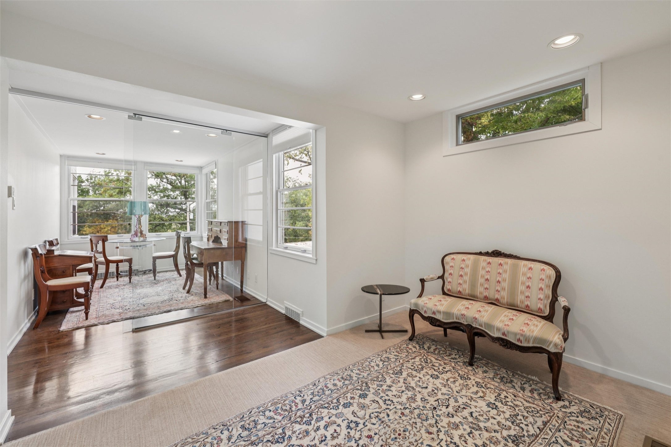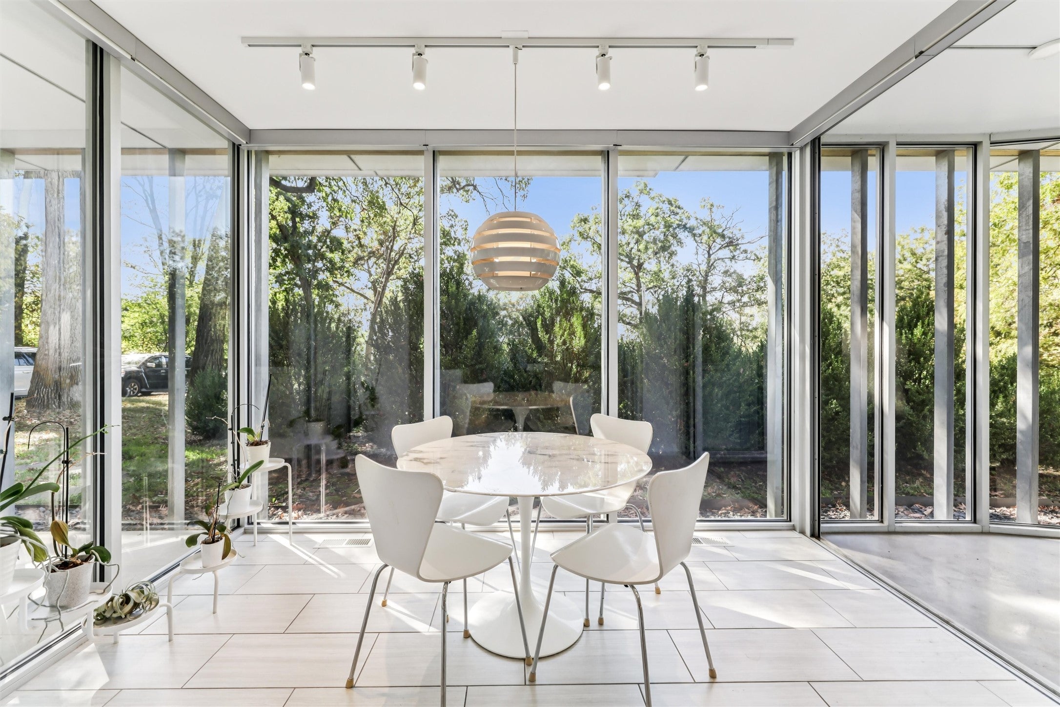 Rare find. International/Moderne architectural gem that was The Des Moines Register front page news in 1935. Spacious private lot, mature trees, picturesque views. Well-maintained gorgeous floor-to-ceiling glass, hardwood floors, modern amenities. Enter a glass door to a long foyer with views & storage or welcome guests to a central foyer.