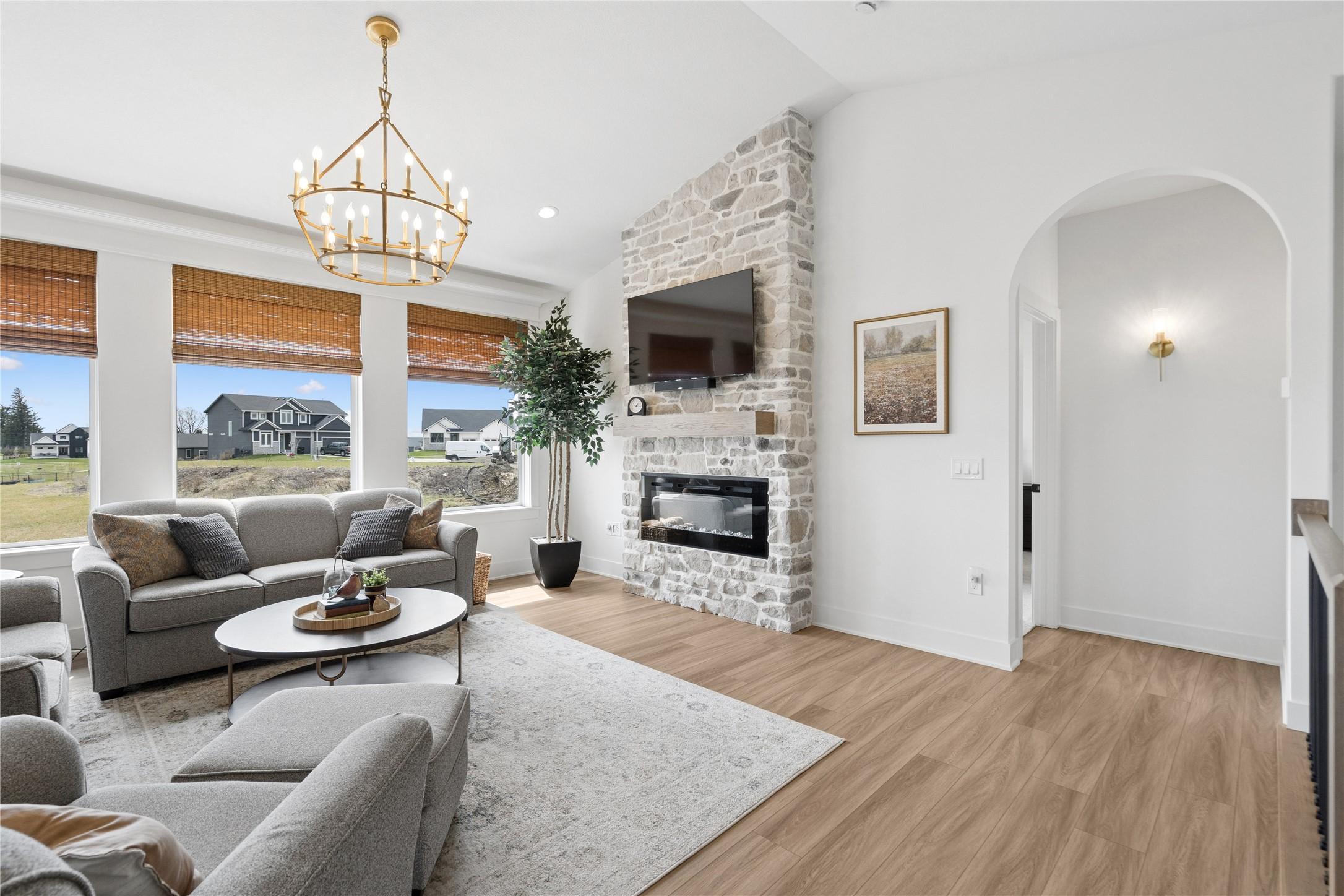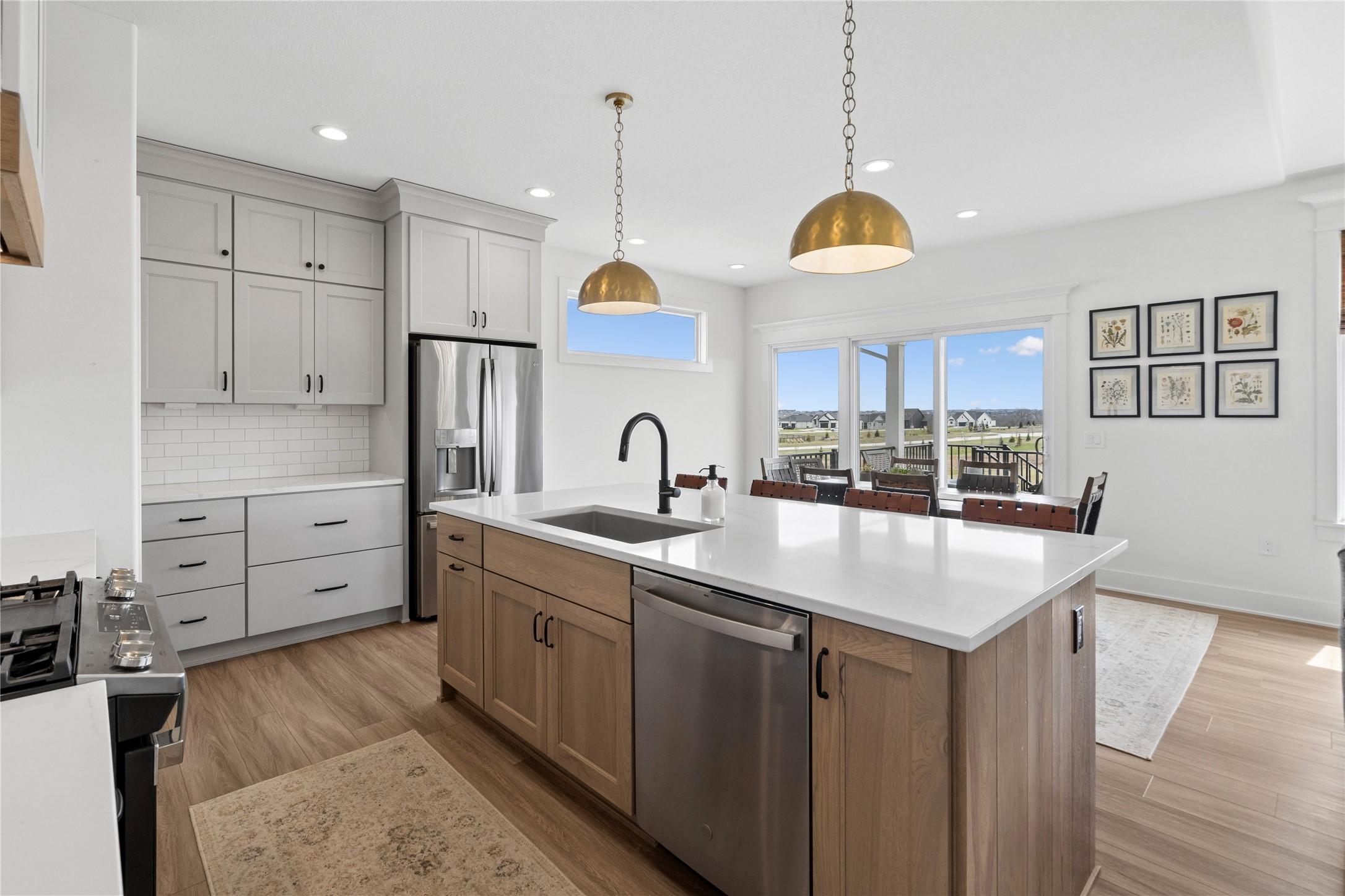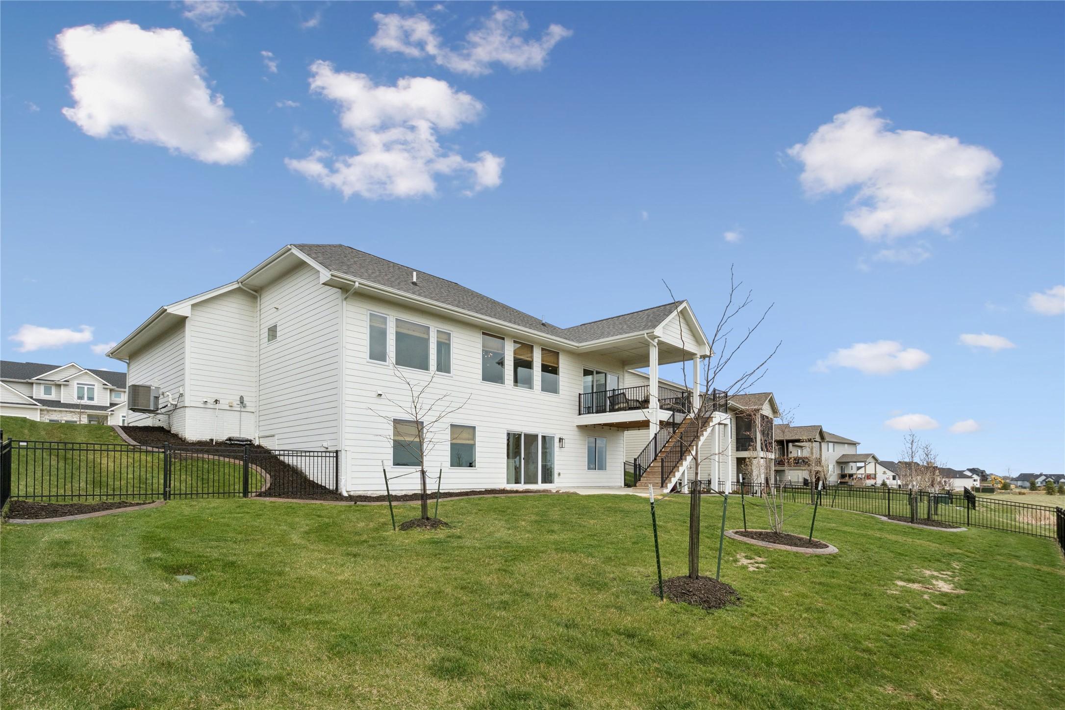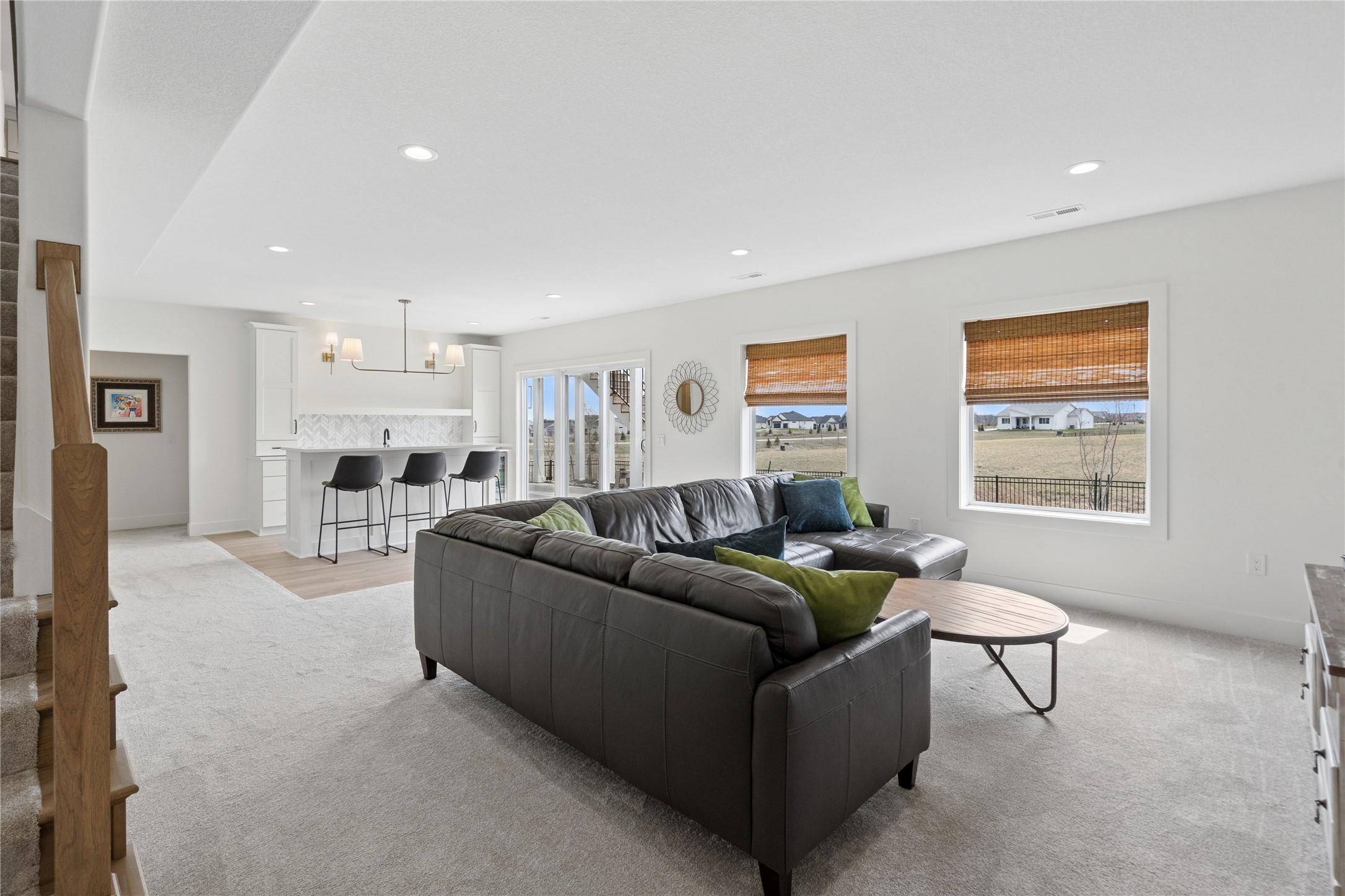 Better than new KRM resale with an open, functional layout, quality finishes, and thoughtful upgrades throughout. Bright and sunny with great views, this home offers a private, fully fenced backyard and standout curb appeal. The kitchen features abundant cabinetry, quartz countertops, stainless steel appliances, and a walk-in pantry, flowing into the dining area and covered deck. The great room includes a 48 linear fireplace and large windows for natural light. The primary suite offers dual vanities, tiled shower w/ glass shower door, and a custom walk-in closet with direct laundry access. The main level also has an additional bedroom and full bathroom w/ tile & glass shower door. The finished lower level adds a spacious family room, bar, two bedrooms, and 3/4 bath w/glass shower door. Plenty of storage throughout. Includes irrigation, passive radon system, and generator transfer panel. Great location near trails, parks, shopping, restaurants, and easy interstate access.