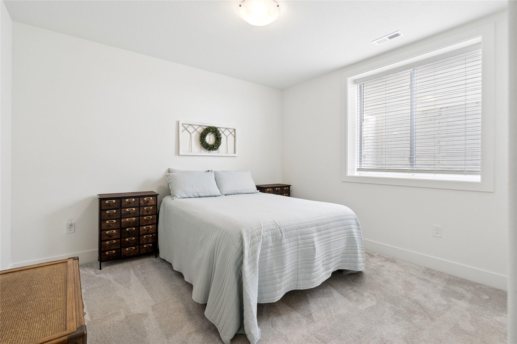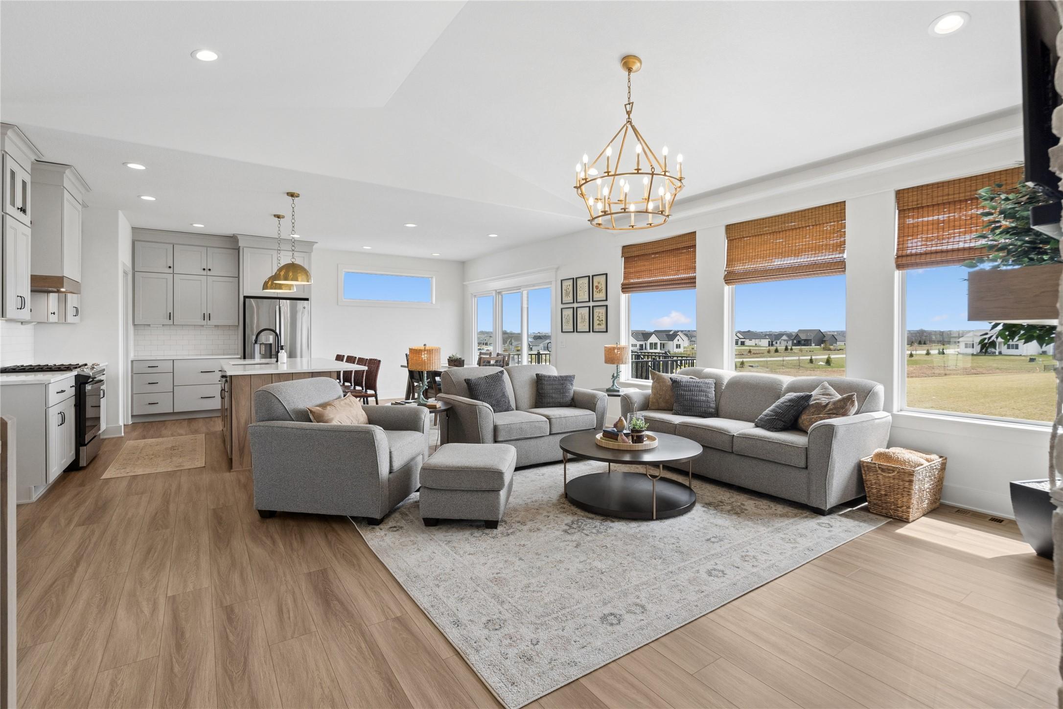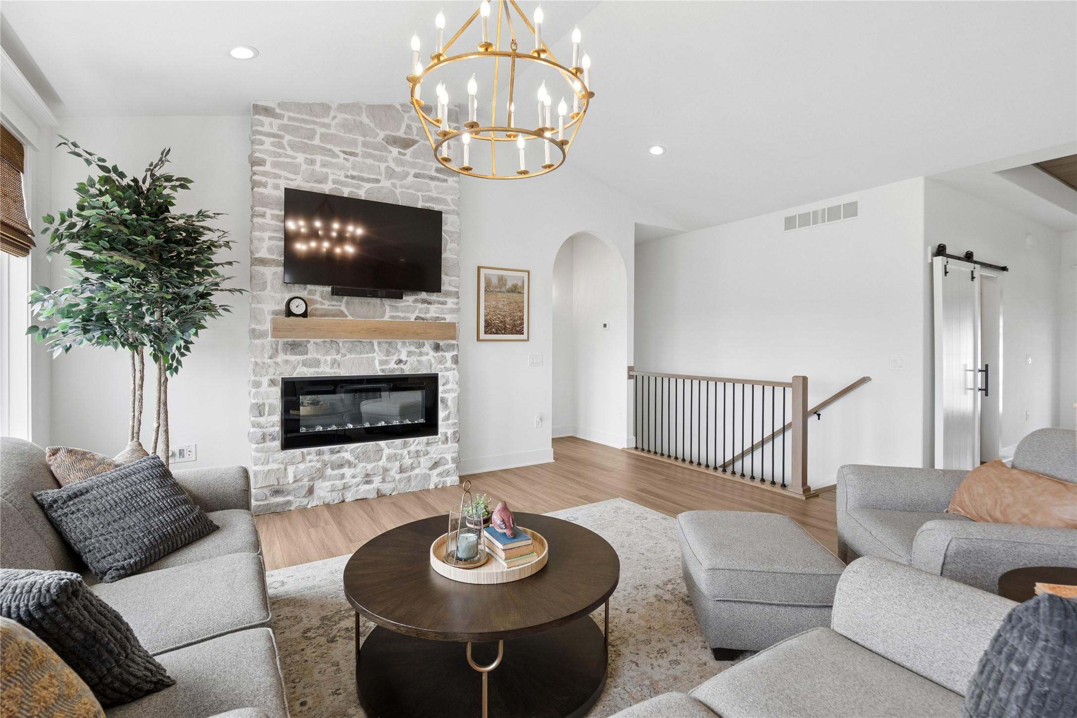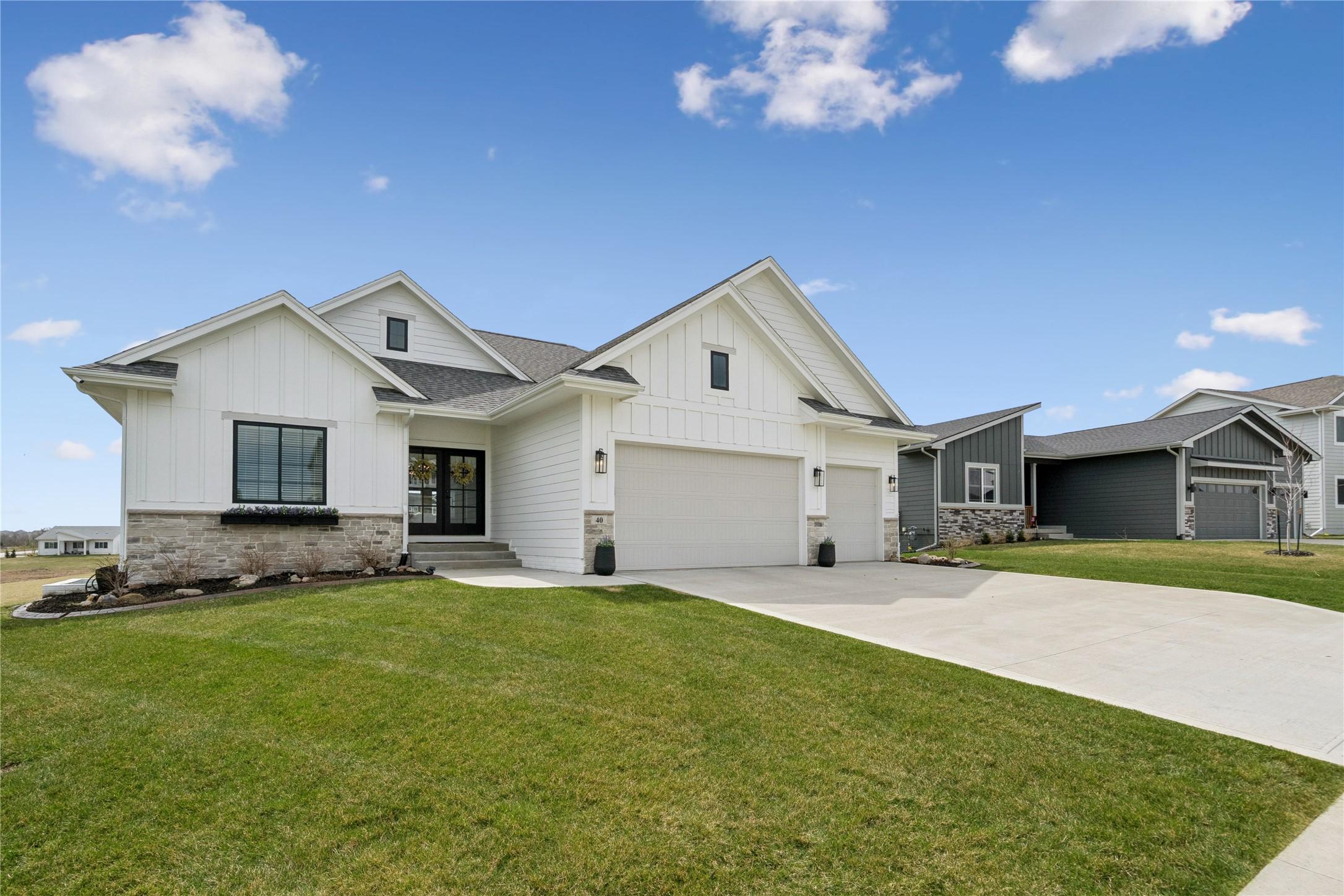 Better than new KRM resale with an open, functional layout, quality finishes, and thoughtful upgrades throughout. Bright and sunny with great views, this home offers a private, fully fenced backyard and standout curb appeal. The kitchen features abundant cabinetry, quartz countertops, stainless steel appliances, and a walk-in pantry, flowing into the dining area and covered deck. The great room includes a 48 linear fireplace and large windows for natural light. The primary suite offers dual vanities, tiled shower w/ glass shower door, and a custom walk-in closet with direct laundry access. The main level also has an additional bedroom and full bathroom w/ tile & glass shower door. The finished lower level adds a spacious family room, bar, two bedrooms, and 3/4 bath w/glass shower door. Plenty of storage throughout. Includes irrigation, passive radon system, and generator transfer panel. Great location near trails, parks, shopping, restaurants, and easy interstate access.