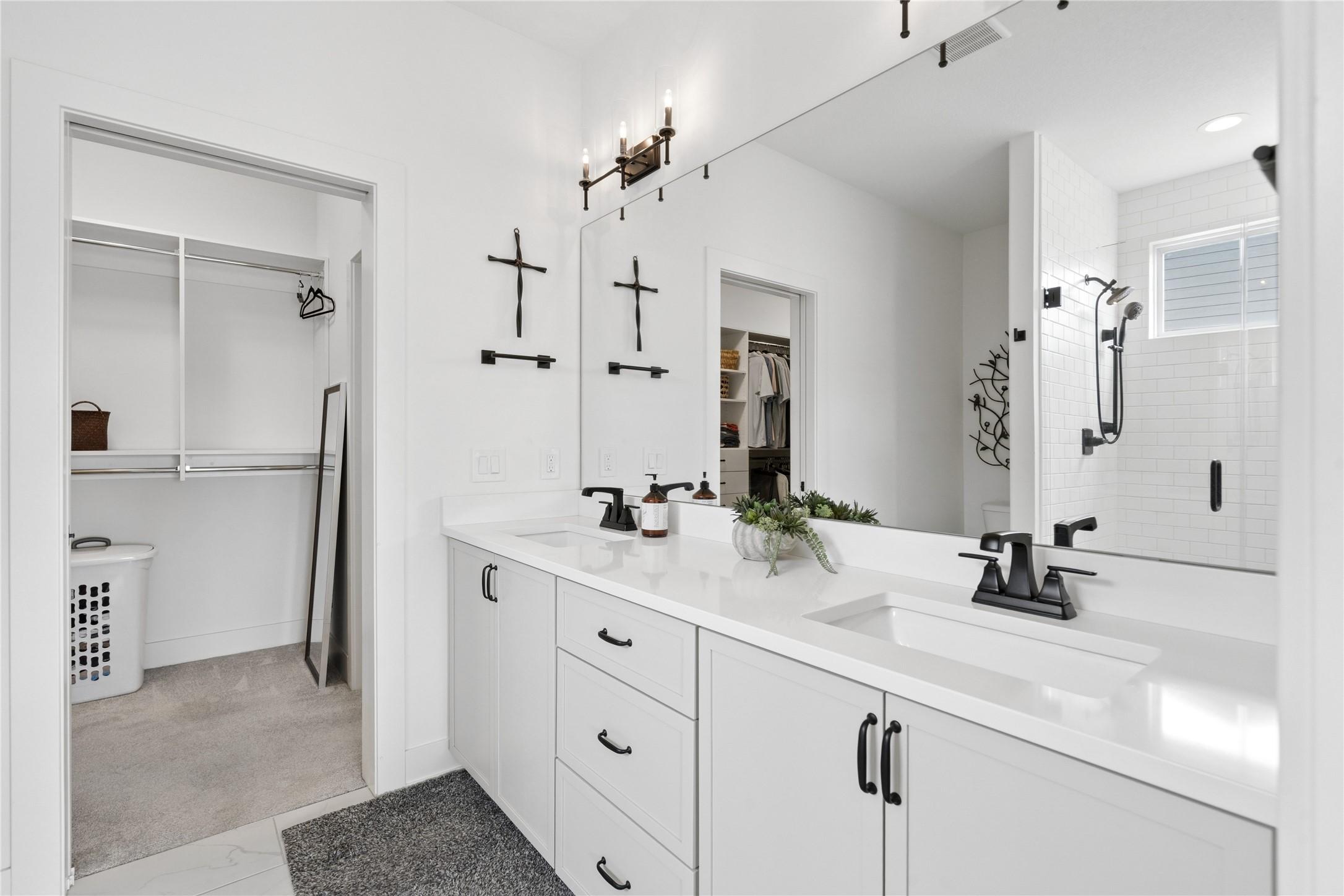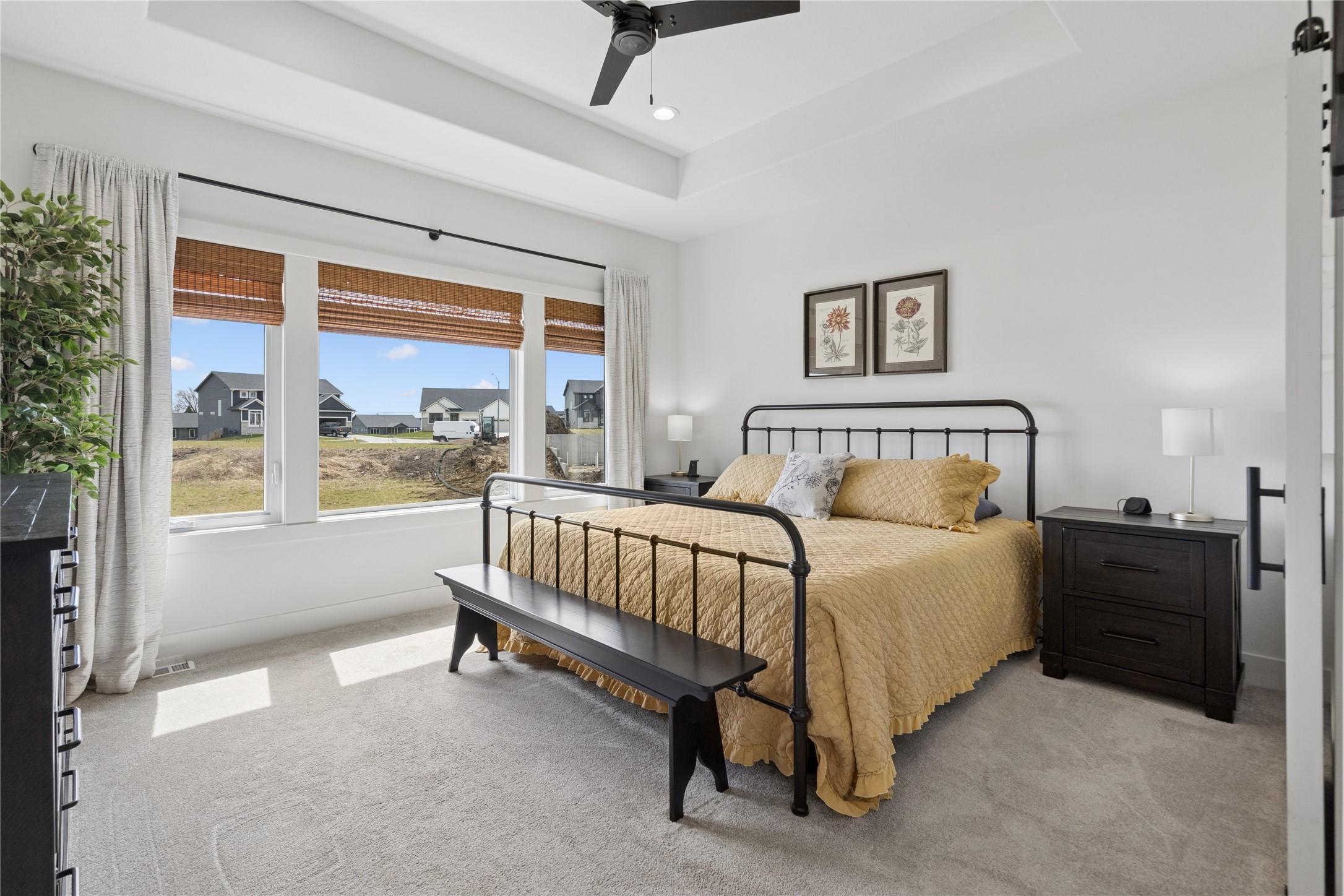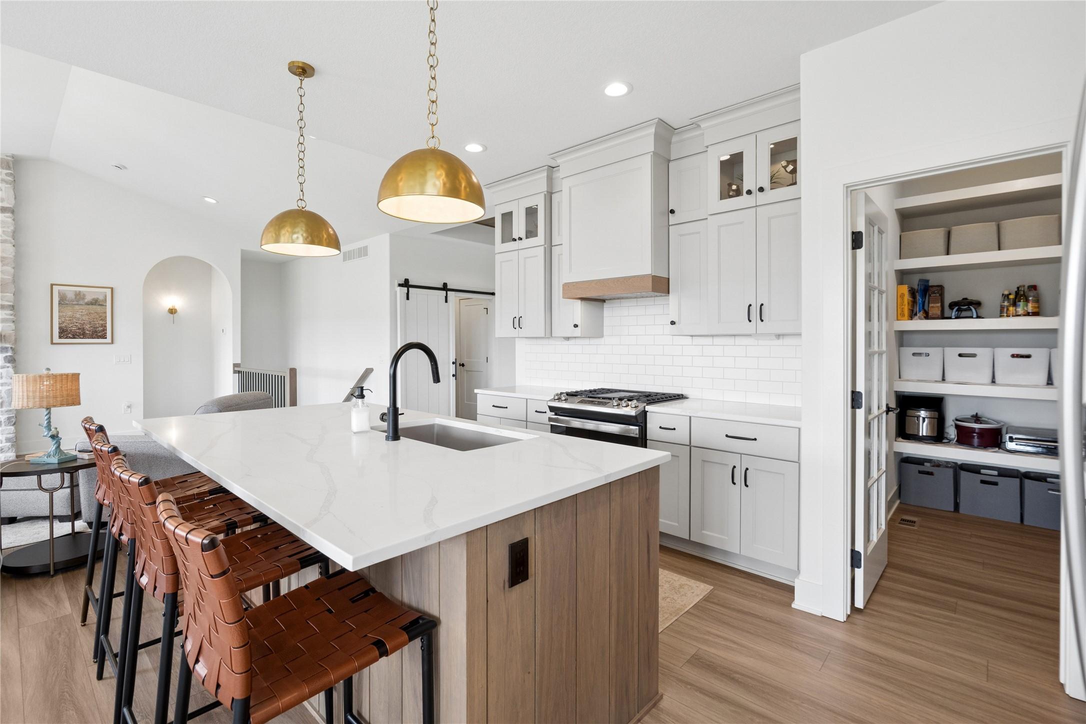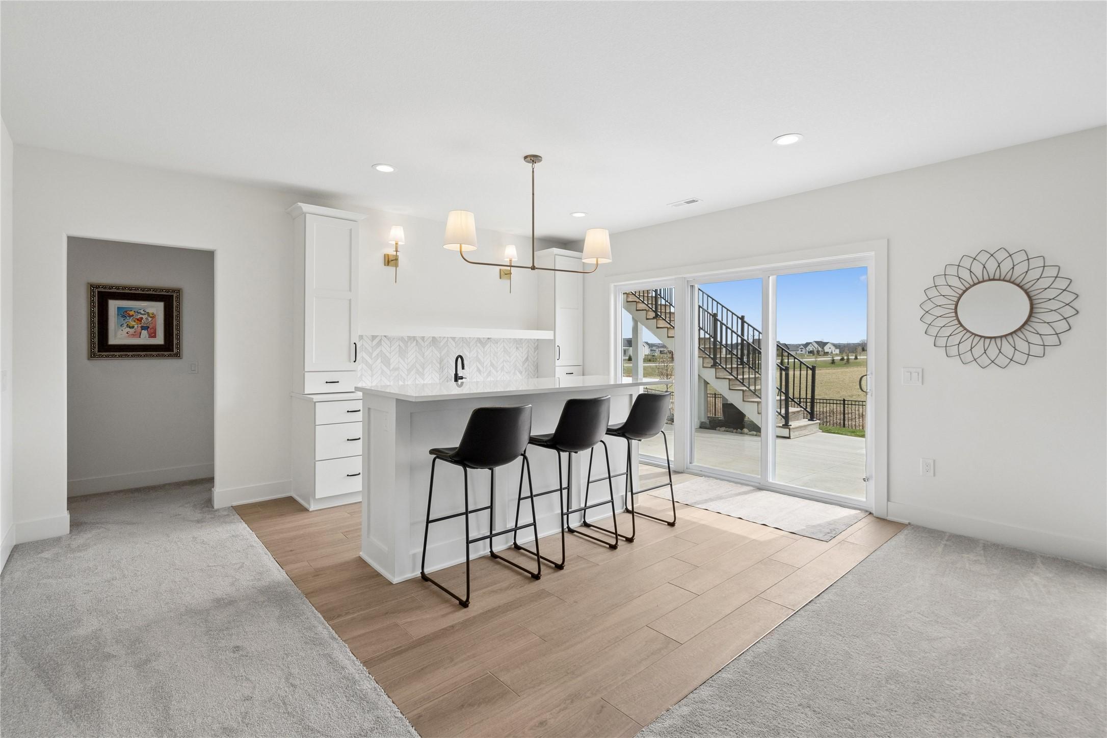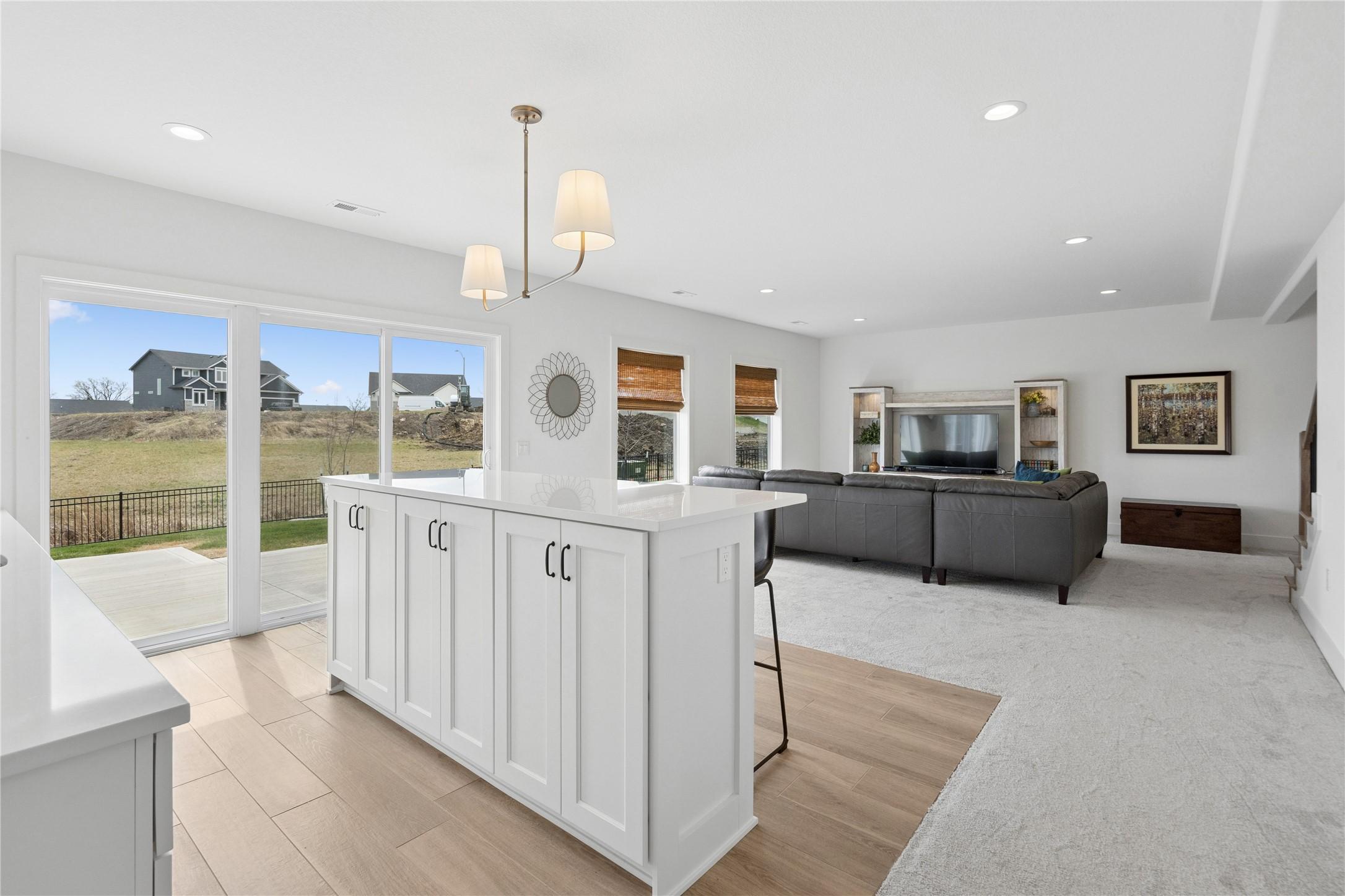 Better than new KRM resale with an open, functional layout, quality finishes, and thoughtful upgrades throughout. Bright and sunny with great views, this home offers a private, fully fenced backyard and standout curb appeal. The kitchen features abundant cabinetry, quartz countertops, stainless steel appliances, and a walk-in pantry, flowing into the dining area and covered deck. The great room includes a 48 linear fireplace and large windows for natural light. The primary suite offers dual vanities, tiled shower w/ glass shower door, and a custom walk-in closet with direct laundry access. The main level also has an additional bedroom and full bathroom w/ tile & glass shower door. The finished lower level adds a spacious family room, bar, two bedrooms, and 3/4 bath w/glass shower door. Plenty of storage throughout. Includes irrigation, passive radon system, and generator transfer panel. Great location near trails, parks, shopping, restaurants, and easy interstate access.