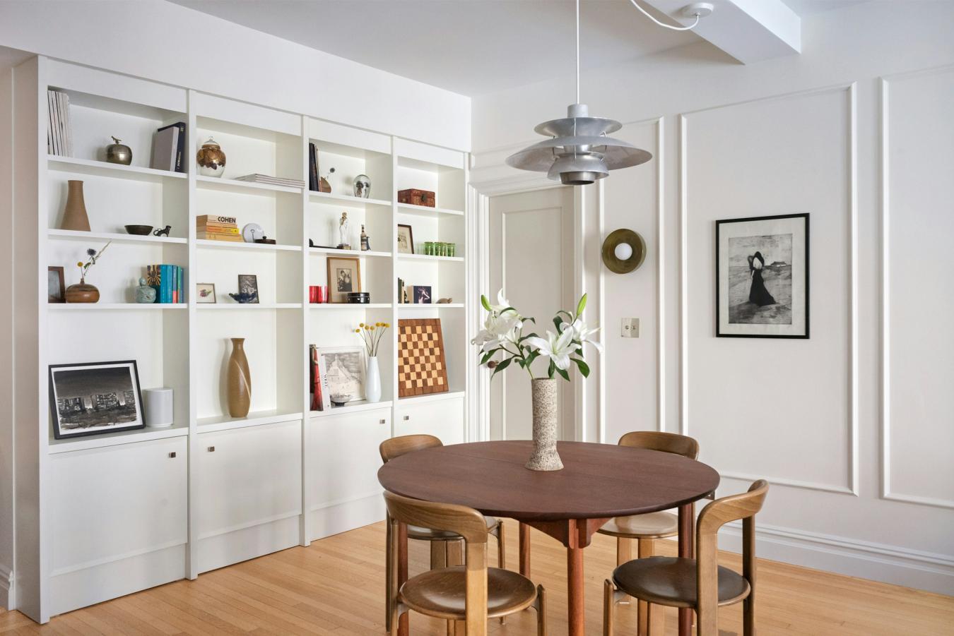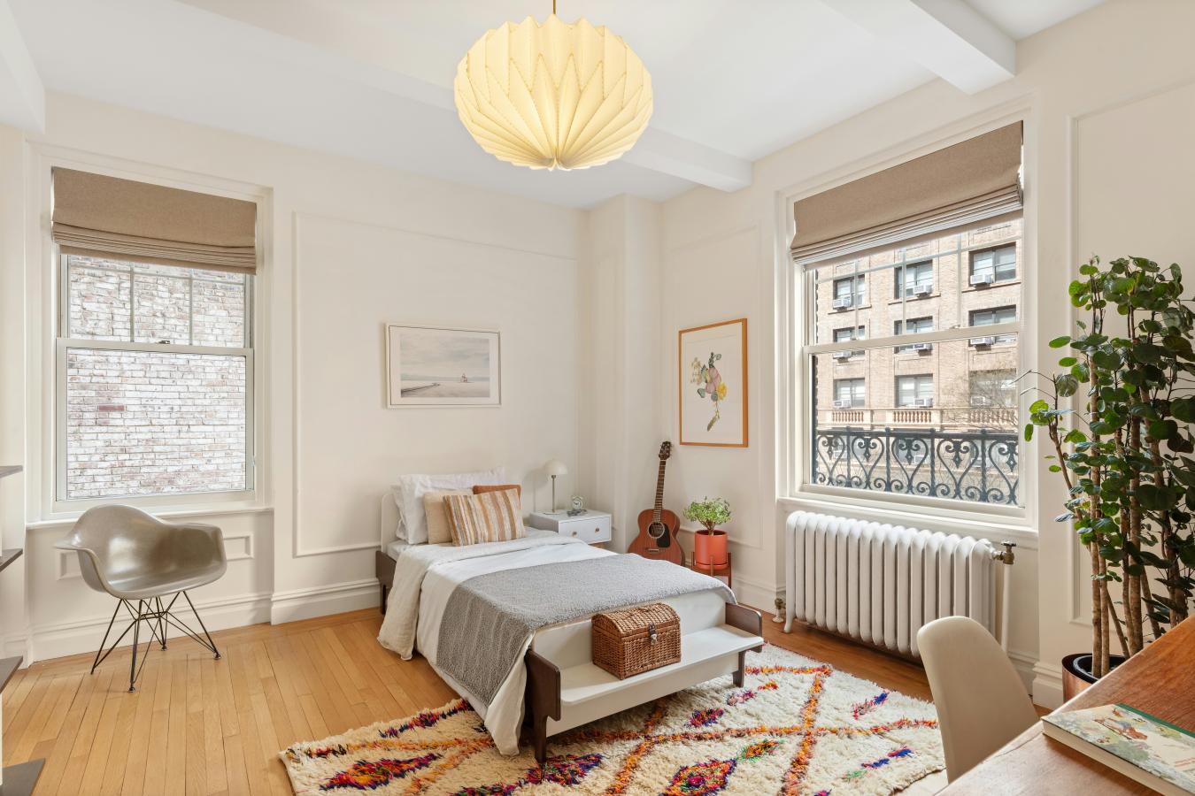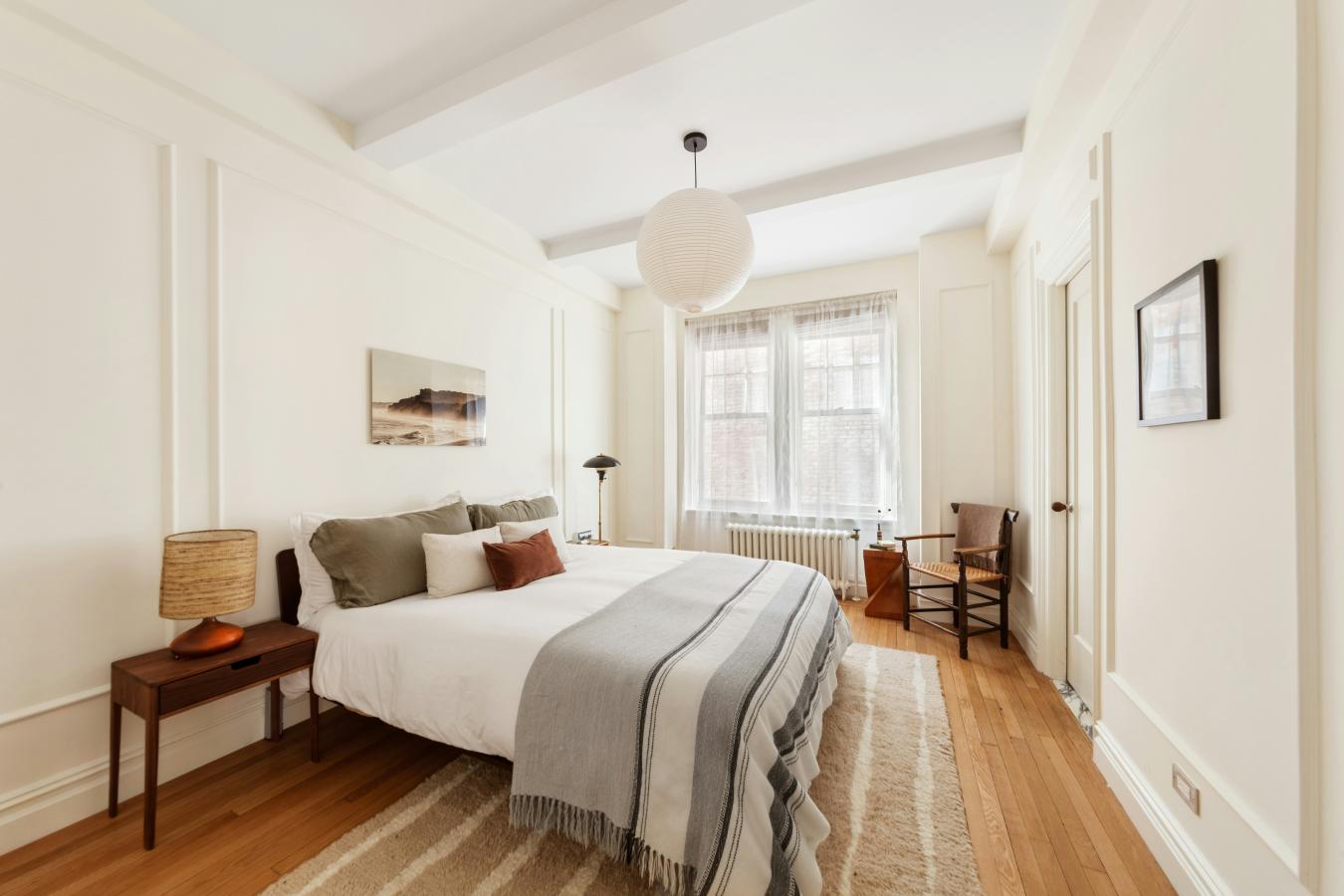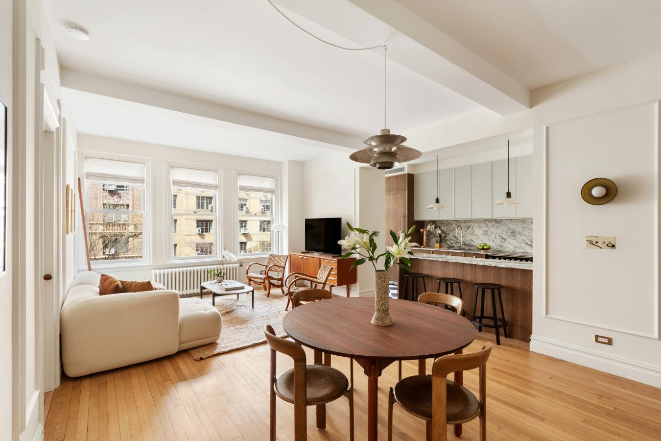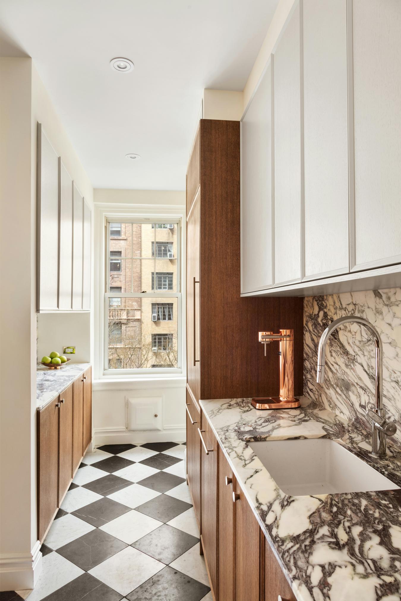 A corner two-bedroom of rare finish, tailored to the most discerning buyer. Residence 4C at 310 West End Avenue is a sun-drenched, meticulously detailed home with a distinctly European sensibility and the ease of modern city living. A gracious entry foyer sets the tone, with two closets and exquisite custom mosaic flooring with heritage detailing. Beyond, an expansive living and dining room unfolds, framed by large windows with picturesque views of tree-lined streets, high beamed ceilings, custom millwork, and intricate molding. A dedicated custom workstation adds both function and flexibility. The windowed kitchen is anchored by a generous island with seating for three, marble countertops and backsplash, custom cabinetry, and a full suite of premium appliances including a Bertazzoni refrigerator, Bosch dishwasher, and Fisher & Paykel induction range. The primary suite is a quiet retreat with excellent light, generous proportions, custom molding, and two walk-in closets. The corner second bedroom offers dual exposures, open city views, and equally generous proportions. Both bedrooms share a beautifully finished bathroom with mosaic tilework, a walnut vanity, Grohe fixtures, and a deep soaking tub with glass enclosure. A powder room serves the entertaining spaces with equal care. Additional features include wide-plank flooring, custom built-ins, and thoughtful storage. Built in 1927 by Emory Roth, 310 West End Avenue is a full-service co-op with a 24-hour doorman, live-in superintendent, private storage, bike room, and laundry facilities. Pet-friendly and located one block from Riverside Park, with convenient access to playgrounds, bike paths, dog runs, express transportation, neighborhood markets including Fairway and Citarella, and the Upper West Sides dining and retail corridors. Assessment: 462.29/month through 2030.