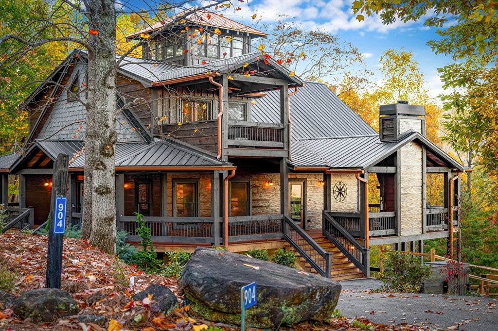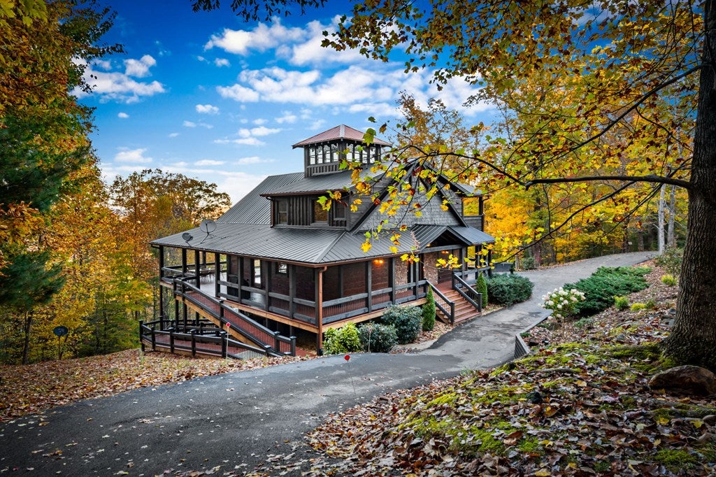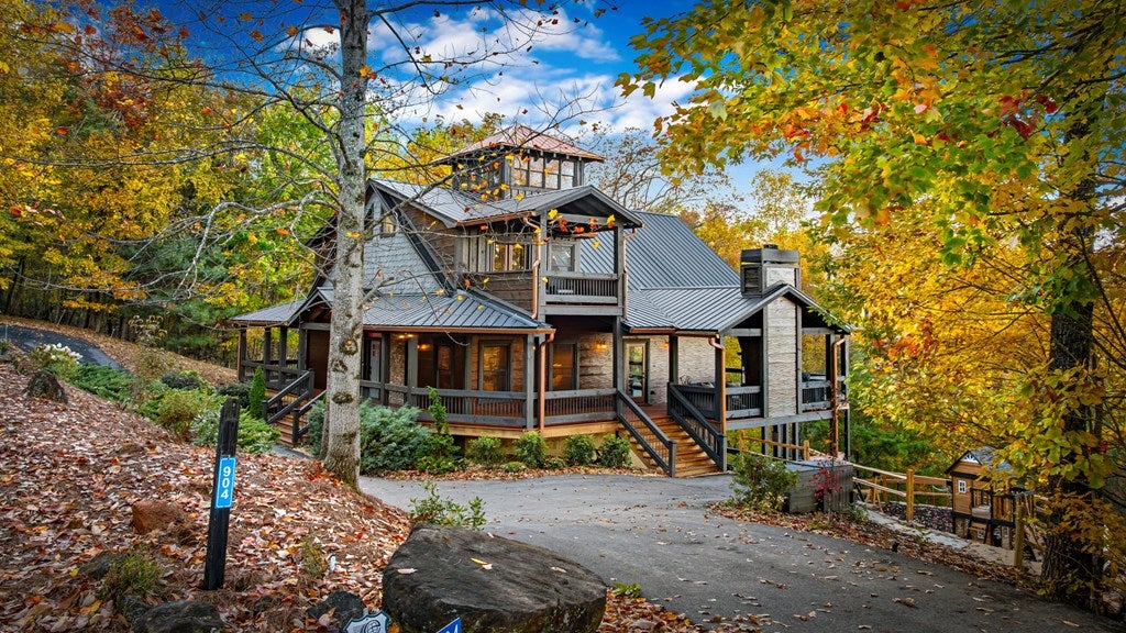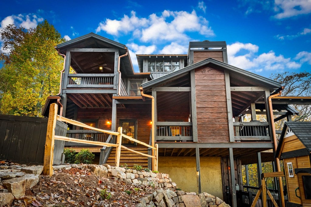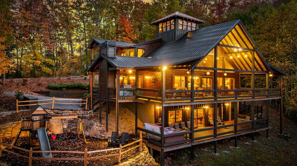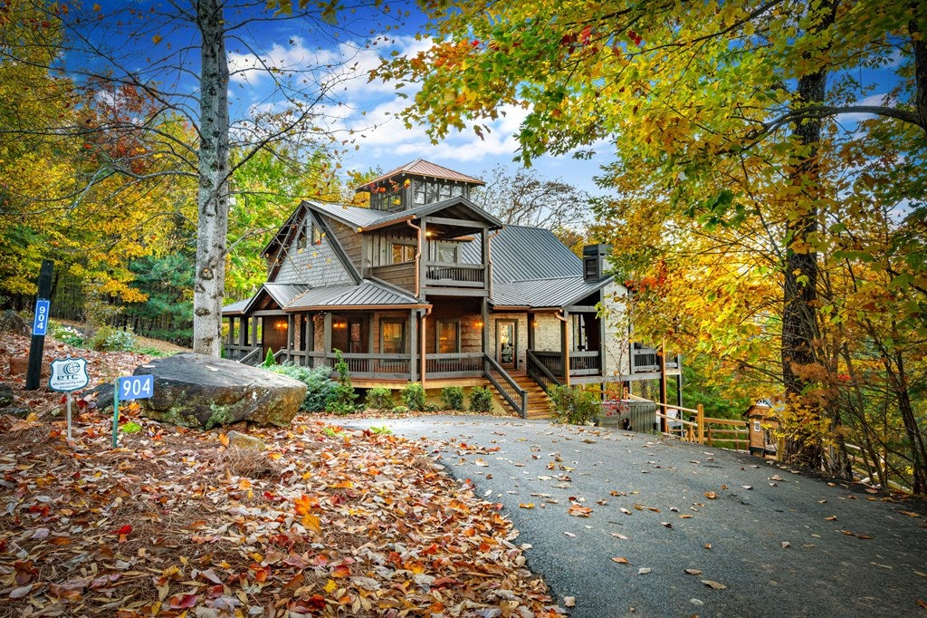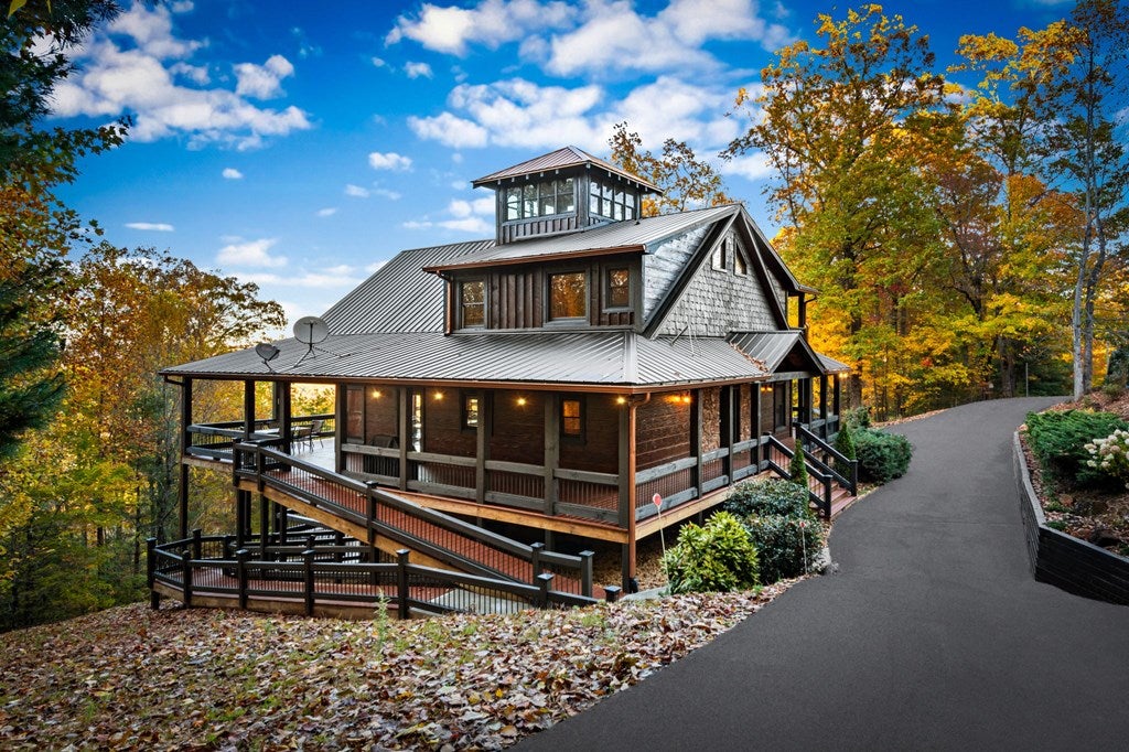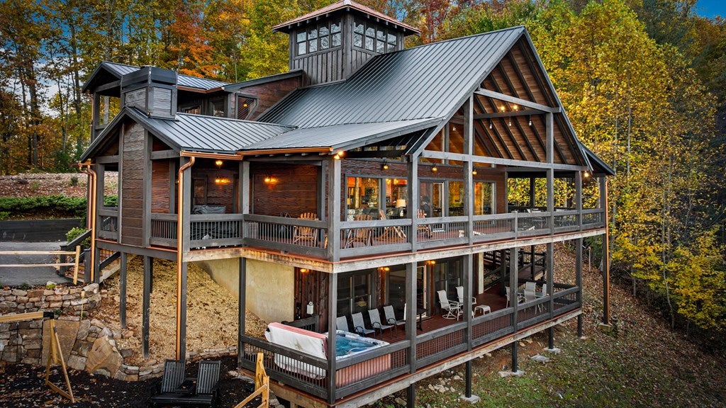 Live in luxury with this long range mountain view, Blue Ridge home, located in the heart of the Aska Adventure area! Just a stones throw from all the tubing, kayaking, fly fishing, gem mining, hiking and biking you could ask for! With 4 bedrooms, 3 baths, 4 stories of entertainment, escaping will not be the problem. The problem? Not wanting to leave. Lets begin with the lower level; 2nd living space, fireplace and TV, pool and poker table, mini wet bar, two bedrooms (one perfect for the kids with two queen double bunk beds), walk out covered deck with outdoor eating and a brand new hot tub. On this level you can also walk directly out to the kids playground then meander your way down the stone steps to the flagstone fire pit. On the main level, youve got a full kitchen with granite countertops, new backsplash, expansive kitchen island w/seating for 4, dining room table that seats 8, open concept w/floor to ceiling windows, living space with a propane fireplace, guest bedroom and bath. With 4 exterior exits onto the full wrap around deck, entertaining will be a breeze; loaded with seating, room for corn hole and an outdoor propane fireplace/grill. The upper level is equipped with a large bedroom and ensuite bathroom with a jetted tub and separate shower. The walk-in closet and additional storage room in the back is perfect to store everything you need or keep as an owners closet for rental purposes. Just outside the bedroom is a dedicated workspace, with a view. From there you can take the winding metal staircase up to the fourth level for a 360 degree view of the surrounding mountains. 2025 improvements; new metal roof, 4 bedroom septic tank, retaining wall and playground, flagstone fire pit with stone steps, paint and stain on every inch of the exterior, hot tub, landscaping and erosion control under the lower deck. This home has been turned into an immaculate property and income producing short term rental. Schedule and appointment today to see this beauty!