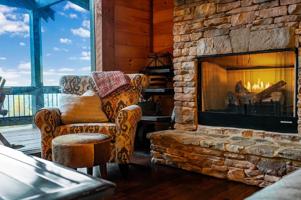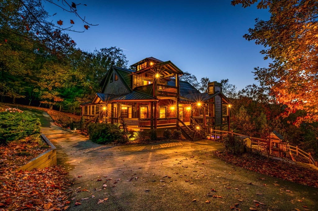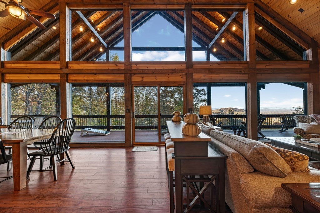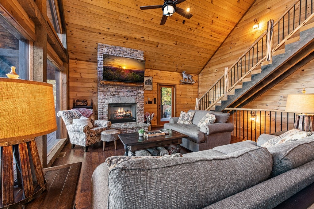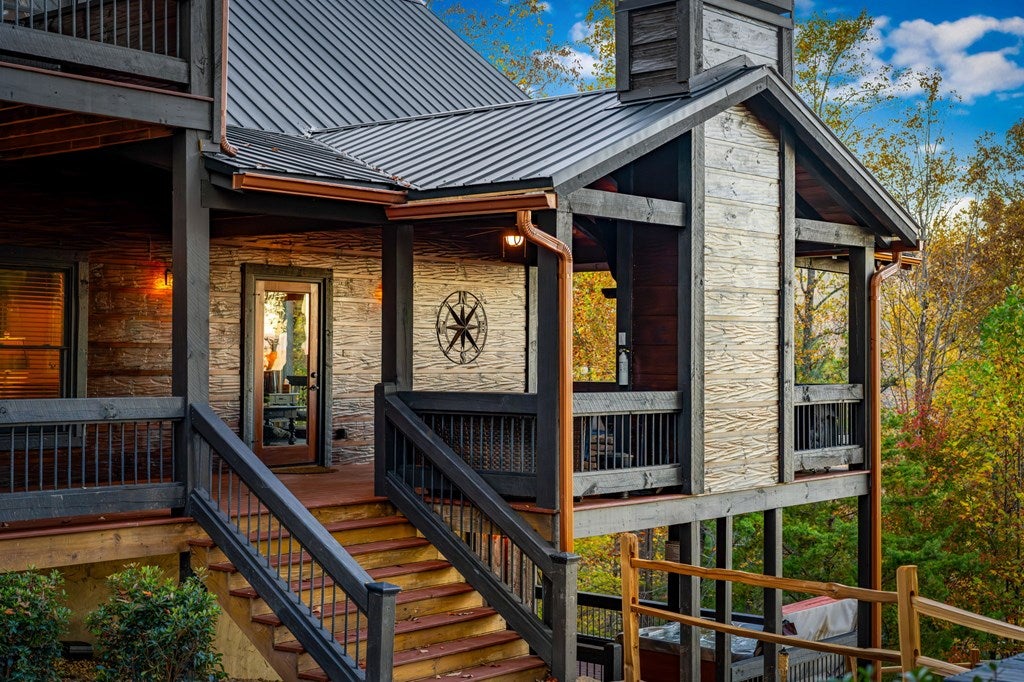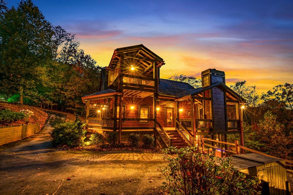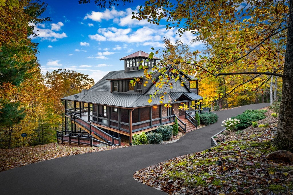Live in luxury with this long range mountain view, Blue Ridge home, located in the heart of the Aska Adventure area! Just a stones throw from all the tubing, kayaking, fly fishing, gem mining, hiking and biking you could ask for! With 4 bedrooms, 3 baths, 4 stories of entertainment, escaping will not be the problem. The problem? Not wanting to leave. Lets begin with the lower level; 2nd living space, fireplace and TV, pool and poker table, mini wet bar, two bedrooms (one perfect for the kids with two queen double bunk beds), walk out covered deck with outdoor eating and a brand new hot tub. On this level you can also walk directly out to the kids playground then meander your way down the stone steps to the flagstone fire pit. On the main level, youve got a full kitchen with granite countertops, new backsplash, expansive kitchen island w/seating for 4, dining room table that seats 8, open concept w/floor to ceiling windows, living space with a propane fireplace, guest bedroom and bath. With 4 exterior exits onto the full wrap around deck, entertaining will be a breeze; loaded with seating, room for corn hole and an outdoor propane fireplace/grill. The upper level is equipped with a large bedroom and ensuite bathroom with a jetted tub and separate shower. The walk-in closet and additional storage room in the back is perfect to store everything you need or keep as an owners closet for rental purposes. Just outside the bedroom is a dedicated workspace, with a view. From there you can take the winding metal staircase up to the fourth level for a 360 degree view of the surrounding mountains. 2025 improvements; new metal roof, 4 bedroom septic tank, retaining wall and playground, flagstone fire pit with stone steps, paint and stain on every inch of the exterior, hot tub, landscaping and erosion control under the lower deck. This home has been turned into an immaculate property and income producing short term rental. Schedule and appointment today to see this beauty!