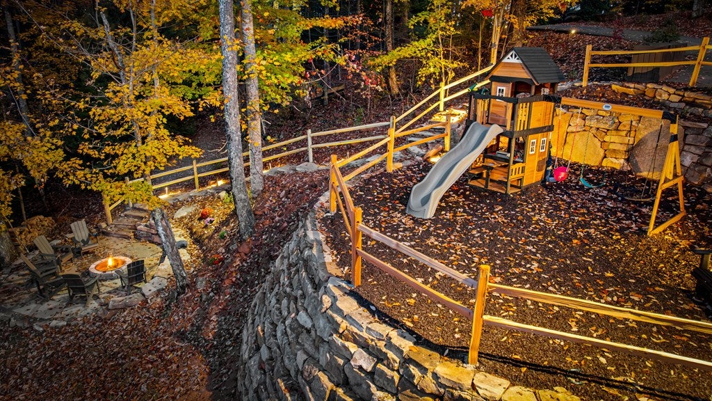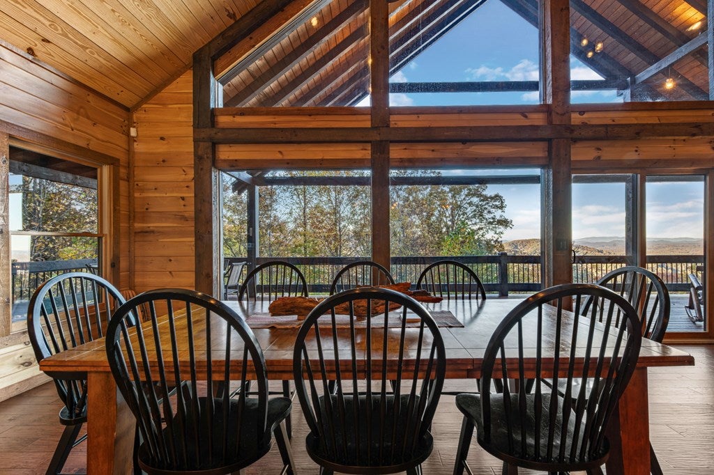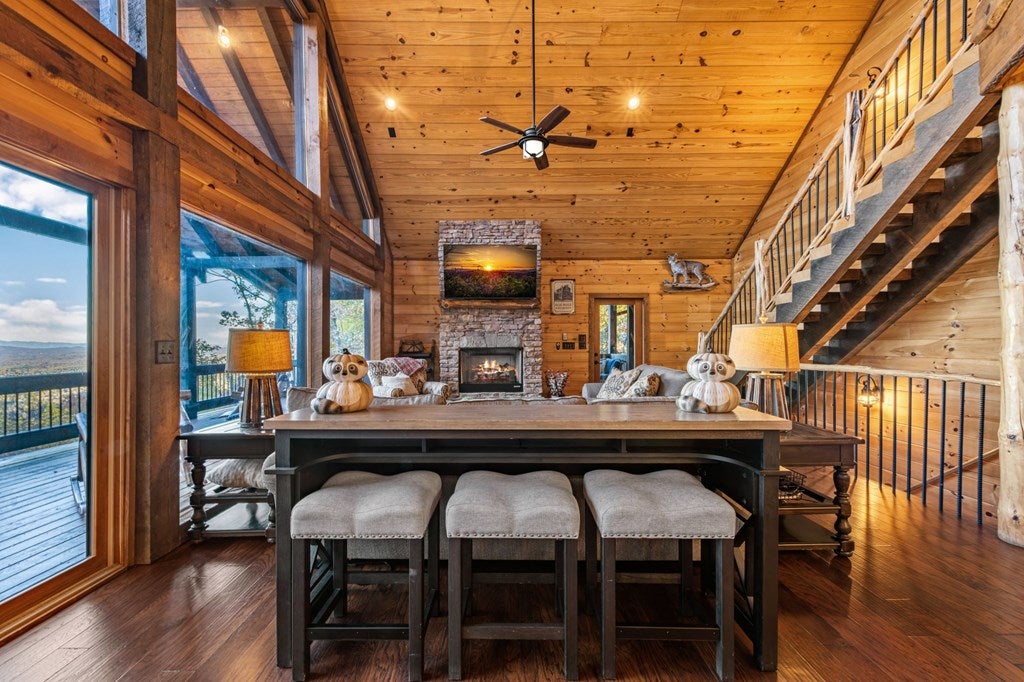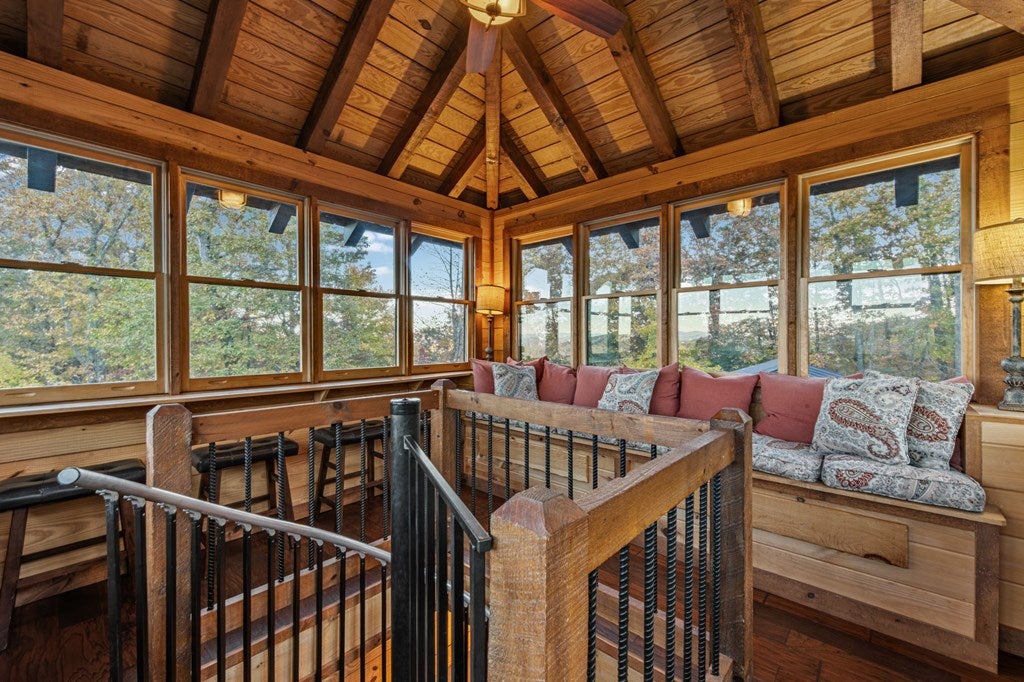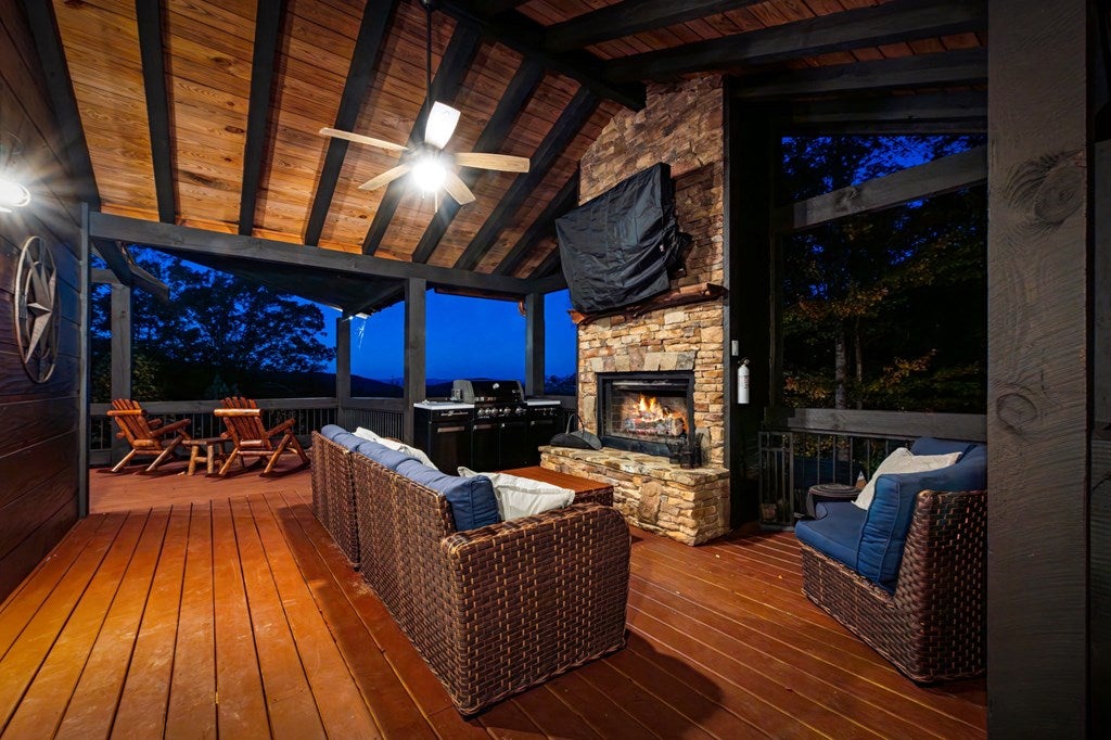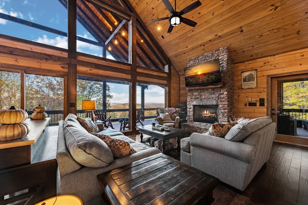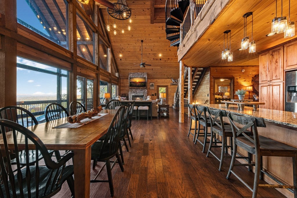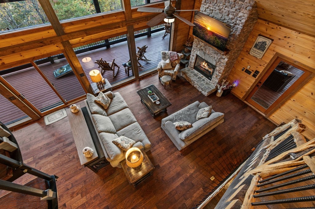 Live in luxury with this long range mountain view, Blue Ridge home, located in the heart of the Aska Adventure area! Just a stones throw from all the tubing, kayaking, fly fishing, gem mining, hiking and biking you could ask for! With 4 bedrooms, 3 baths, 4 stories of entertainment, escaping will not be the problem. The problem? Not wanting to leave. Lets begin with the lower level; 2nd living space, fireplace and TV, pool and poker table, mini wet bar, two bedrooms (one perfect for the kids with two queen double bunk beds), walk out covered deck with outdoor eating and a brand new hot tub. On this level you can also walk directly out to the kids playground then meander your way down the stone steps to the flagstone fire pit. On the main level, youve got a full kitchen with granite countertops, new backsplash, expansive kitchen island w/seating for 4, dining room table that seats 8, open concept w/floor to ceiling windows, living space with a propane fireplace, guest bedroom and bath. With 4 exterior exits onto the full wrap around deck, entertaining will be a breeze; loaded with seating, room for corn hole and an outdoor propane fireplace/grill. The upper level is equipped with a large bedroom and ensuite bathroom with a jetted tub and separate shower. The walk-in closet and additional storage room in the back is perfect to store everything you need or keep as an owners closet for rental purposes. Just outside the bedroom is a dedicated workspace, with a view. From there you can take the winding metal staircase up to the fourth level for a 360 degree view of the surrounding mountains. 2025 improvements; new metal roof, 4 bedroom septic tank, retaining wall and playground, flagstone fire pit with stone steps, paint and stain on every inch of the exterior, hot tub, landscaping and erosion control under the lower deck. This home has been turned into an immaculate property and income producing short term rental. Schedule and appointment today to see this beauty!
