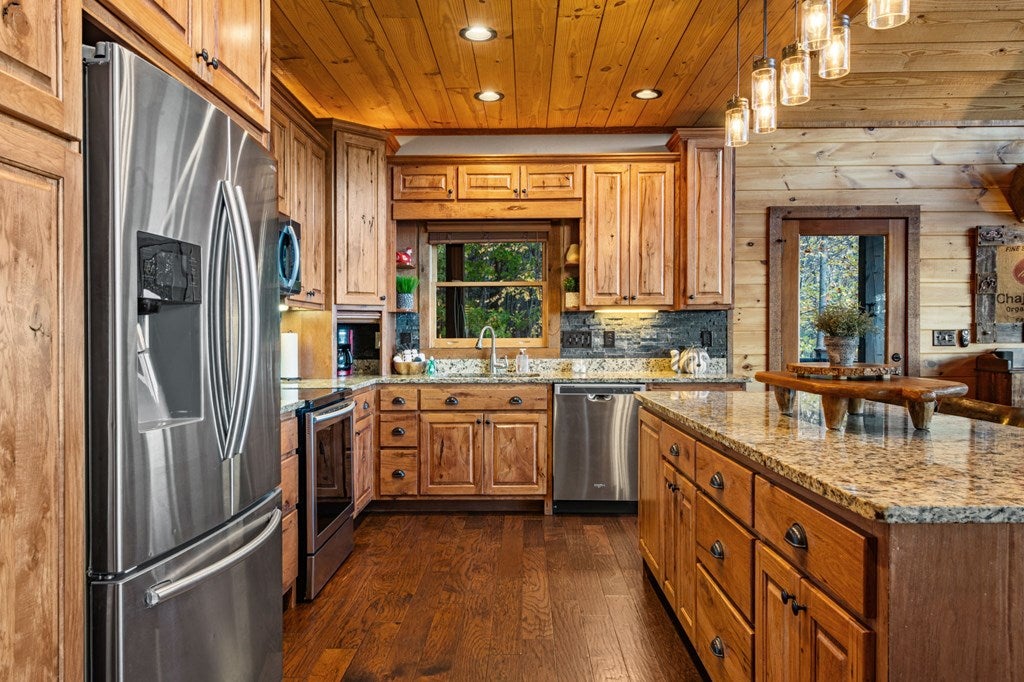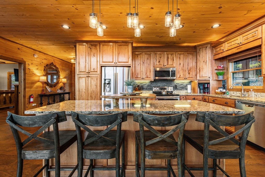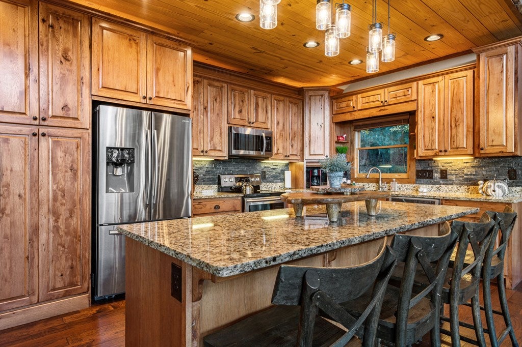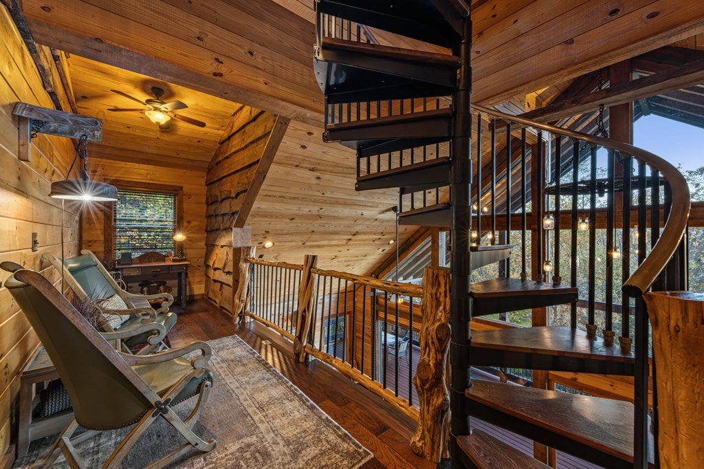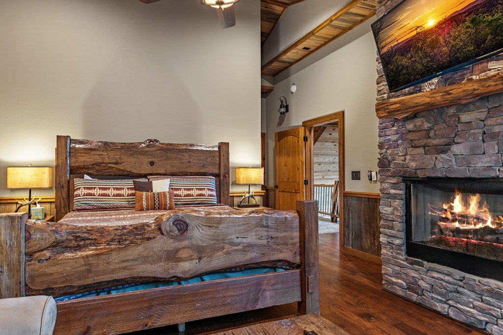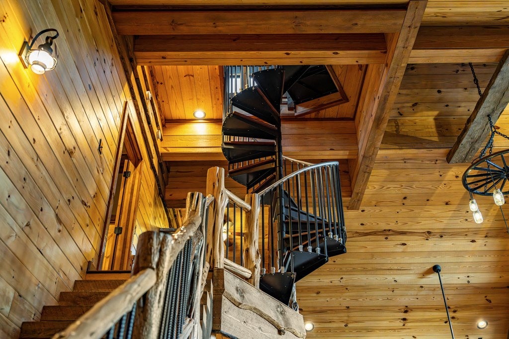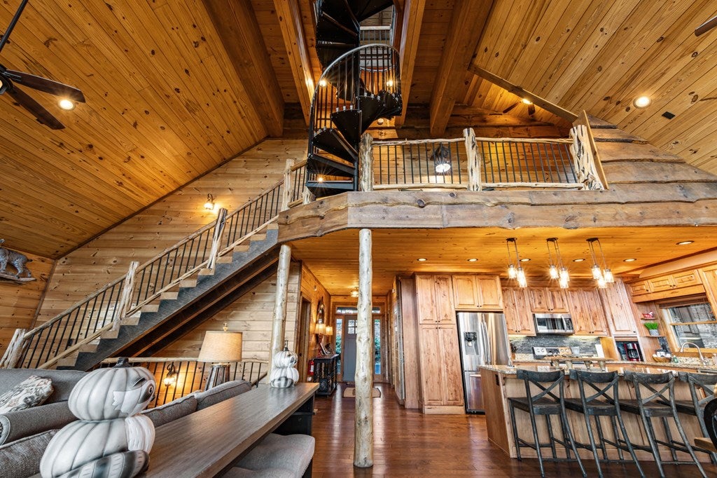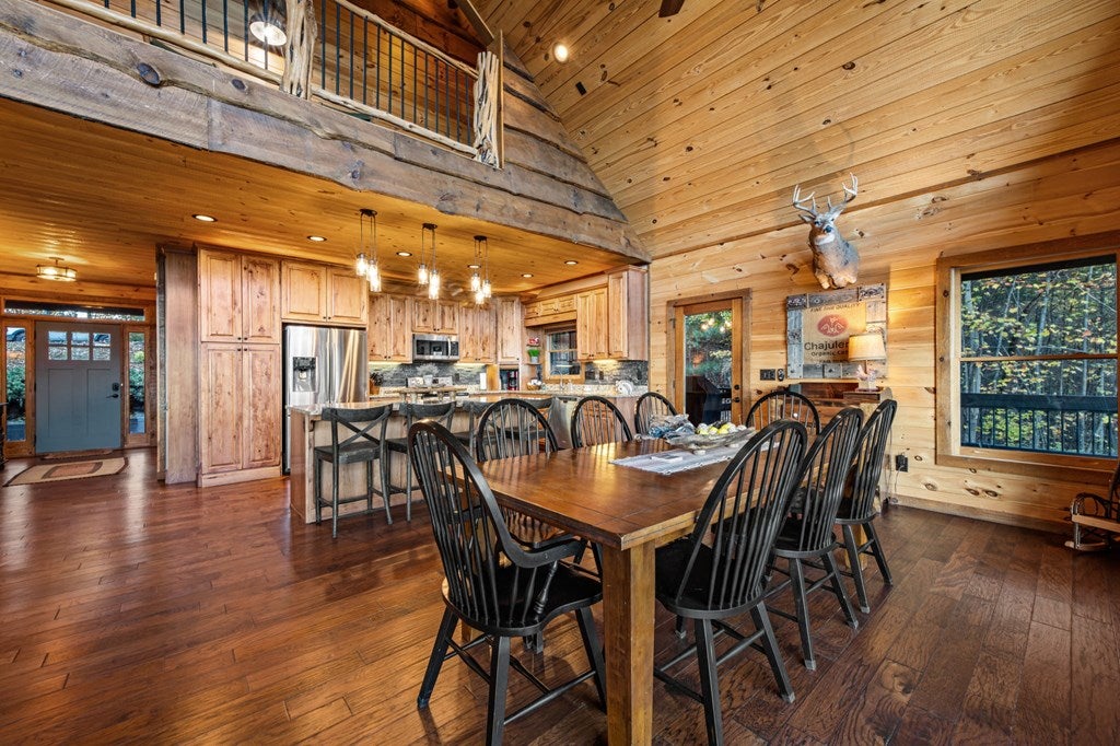 Live in luxury with this long range mountain view, Blue Ridge home, located in the heart of the Aska Adventure area! Just a stones throw from all the tubing, kayaking, fly fishing, gem mining, hiking and biking you could ask for! With 4 bedrooms, 3 baths, 4 stories of entertainment, escaping will not be the problem. The problem? Not wanting to leave. Lets begin with the lower level; 2nd living space, fireplace and TV, pool and poker table, mini wet bar, two bedrooms (one perfect for the kids with two queen double bunk beds), walk out covered deck with outdoor eating and a brand new hot tub. On this level you can also walk directly out to the kids playground then meander your way down the stone steps to the flagstone fire pit. On the main level, youve got a full kitchen with granite countertops, new backsplash, expansive kitchen island w/seating for 4, dining room table that seats 8, open concept w/floor to ceiling windows, living space with a propane fireplace, guest bedroom and bath. With 4 exterior exits onto the full wrap around deck, entertaining will be a breeze; loaded with seating, room for corn hole and an outdoor propane fireplace/grill. The upper level is equipped with a large bedroom and ensuite bathroom with a jetted tub and separate shower. The walk-in closet and additional storage room in the back is perfect to store everything you need or keep as an owners closet for rental purposes. Just outside the bedroom is a dedicated workspace, with a view. From there you can take the winding metal staircase up to the fourth level for a 360 degree view of the surrounding mountains. 2025 improvements; new metal roof, 4 bedroom septic tank, retaining wall and playground, flagstone fire pit with stone steps, paint and stain on every inch of the exterior, hot tub, landscaping and erosion control under the lower deck. This home has been turned into an immaculate property and income producing short term rental. Schedule and appointment today to see this beauty!