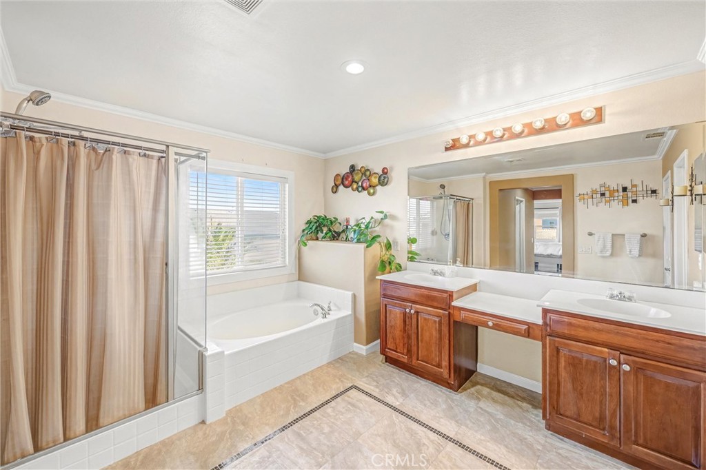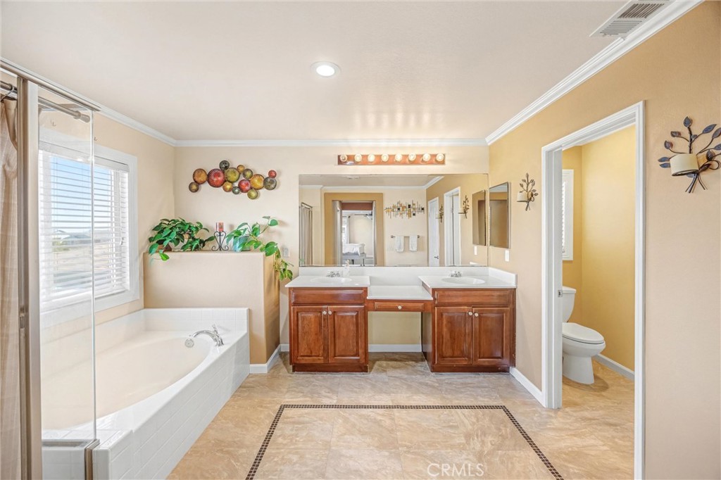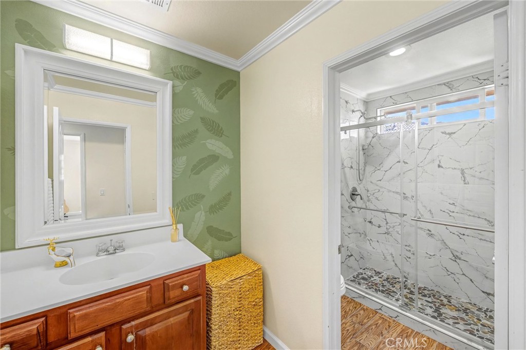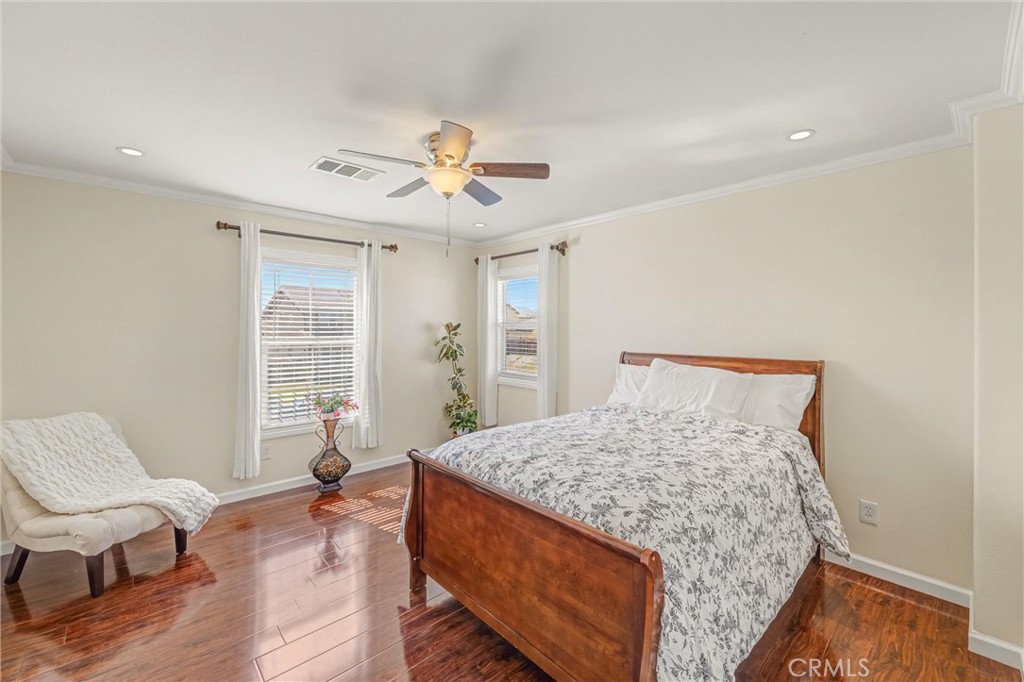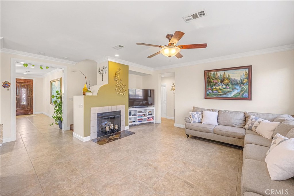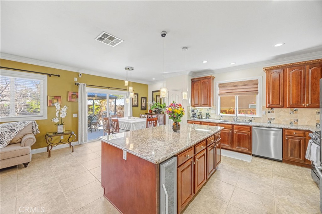 First time on the market! This lovingly maintained home shows true pride of ownership. Located in the heart of the growing city of Hesperia, this home features 4 bedrooms and 2 full bathrooms, including a downstairs bedroom with a 3/4 bathroom—perfect for guests or multi-generational living. There is also a den with potential to be a 5th bedroom, providing flexibility for your needs. The primary suite includes a separate walk-in closet and dual sinks in the primary bathroom. As you walk in, you're welcomed by formal dining and living areas, tile and laminate flooring throughout, and beautiful crown molding that adds a touch of elegance. The large kitchen features granite countertops, an oversized island, and opens into the family room—ideal for gatherings and entertaining. The home is equipped with solar panels that will be paid off at the close of escrow, providing energy efficiency and long-term savings for the future homeowner. Step outside to the backyard, where you'll find a mature lemon tree and a storage shed. The 2-car garage provides additional storage and convenience. The low-maintenance front yard features decorative rock landscaping for easy upkeep and water conservation. Centrally located near Interstate 15, schools, and shopping centers, this home offers both comfort and accessibility. Schedule your private showing today!