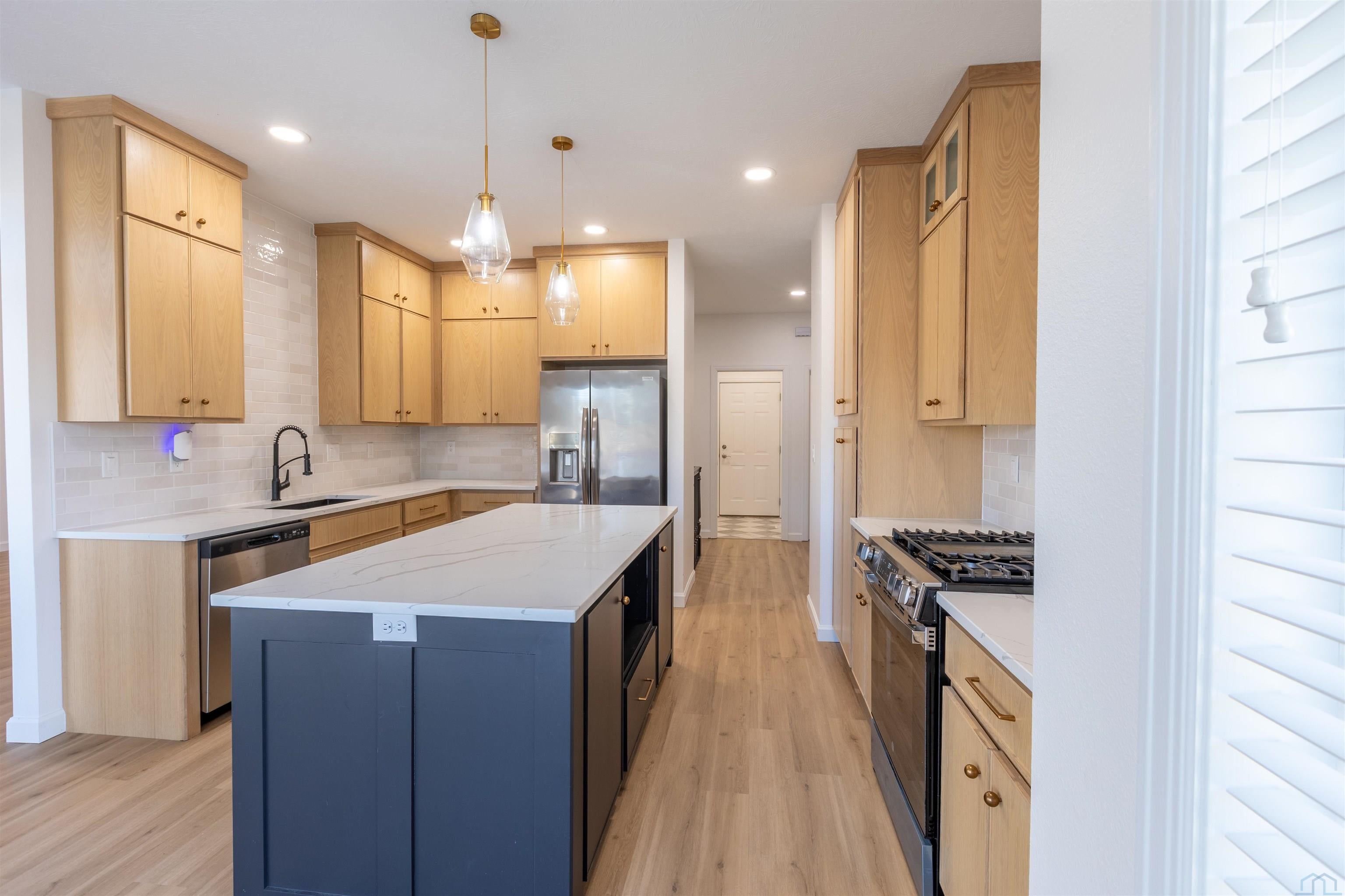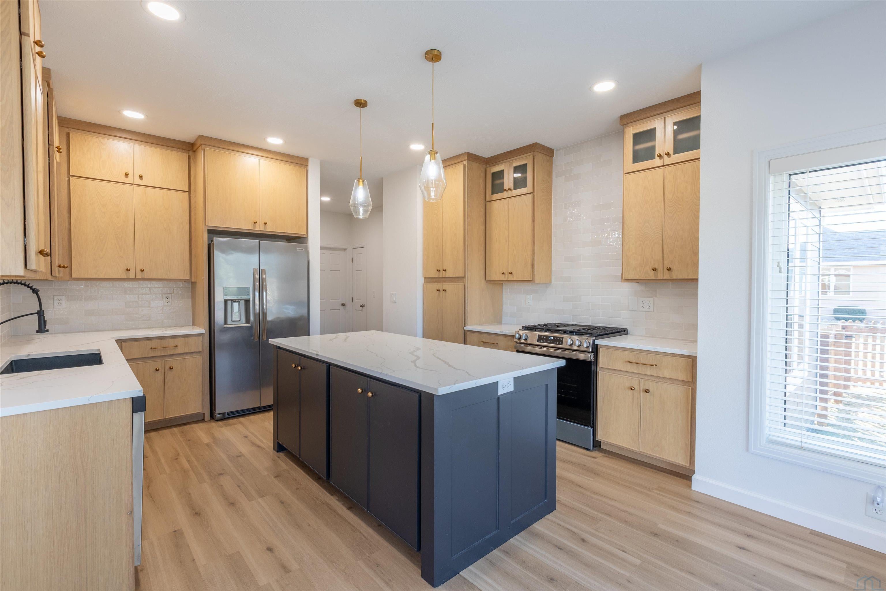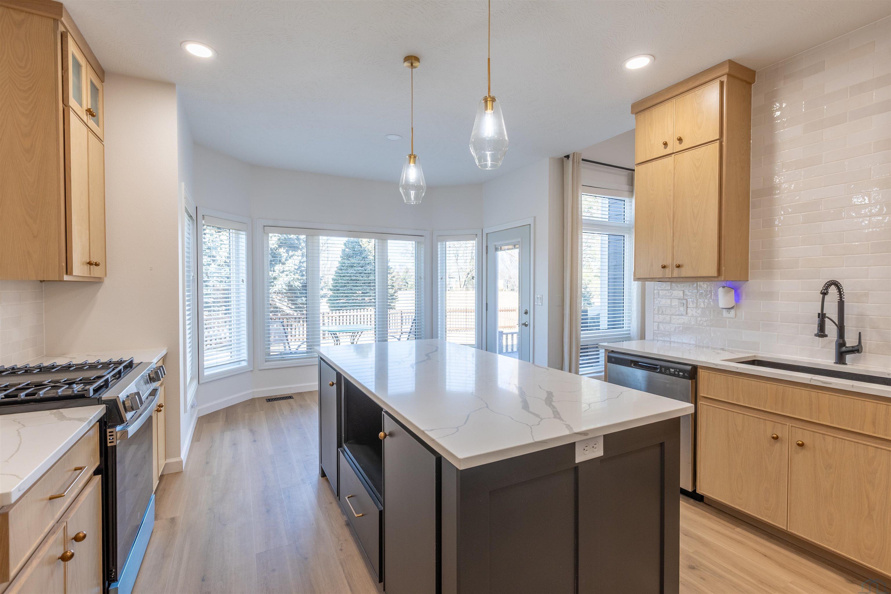 Located in a desirable master planned community within the Dakota Valley School District, this well maintained 2004 ranch offers over 3,400 finished square feet with 4 bedrooms, 3 bathrooms, and a 3-car garage. Situated on a great lot with no neighbors behind, the home provides added privacy and open views. The main level features extensive updates, including a brand new kitchen with custom cabinetry, luxury vinyl plank flooring throughout most of the main living areas, new carpet in the bedrooms, recessed lighting, updated light fixtures, and fresh interior paint. Enjoy the warmth of the gas fireplace and the convenience of an eat-in kitchen. The primary suite is privately positioned on its own side of the home and includes a spacious bathroom and large walk-in closet. The fully finished basement offers a generous family room, beautiful built-ins, an additional large bedroom (4th), a third full bathroom, and an ample storage area. Exterior updates include freshly painted siding, and a fully fenced yard with mature trees. Room sizes are approximate.