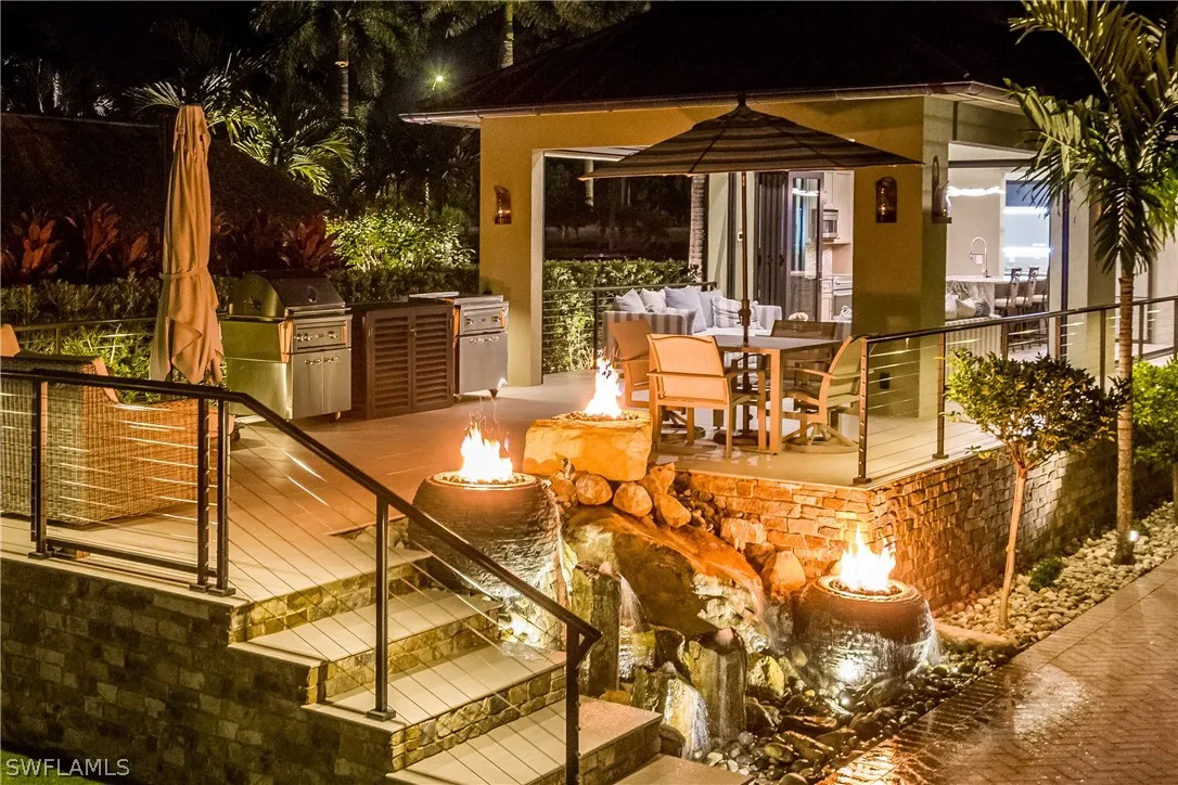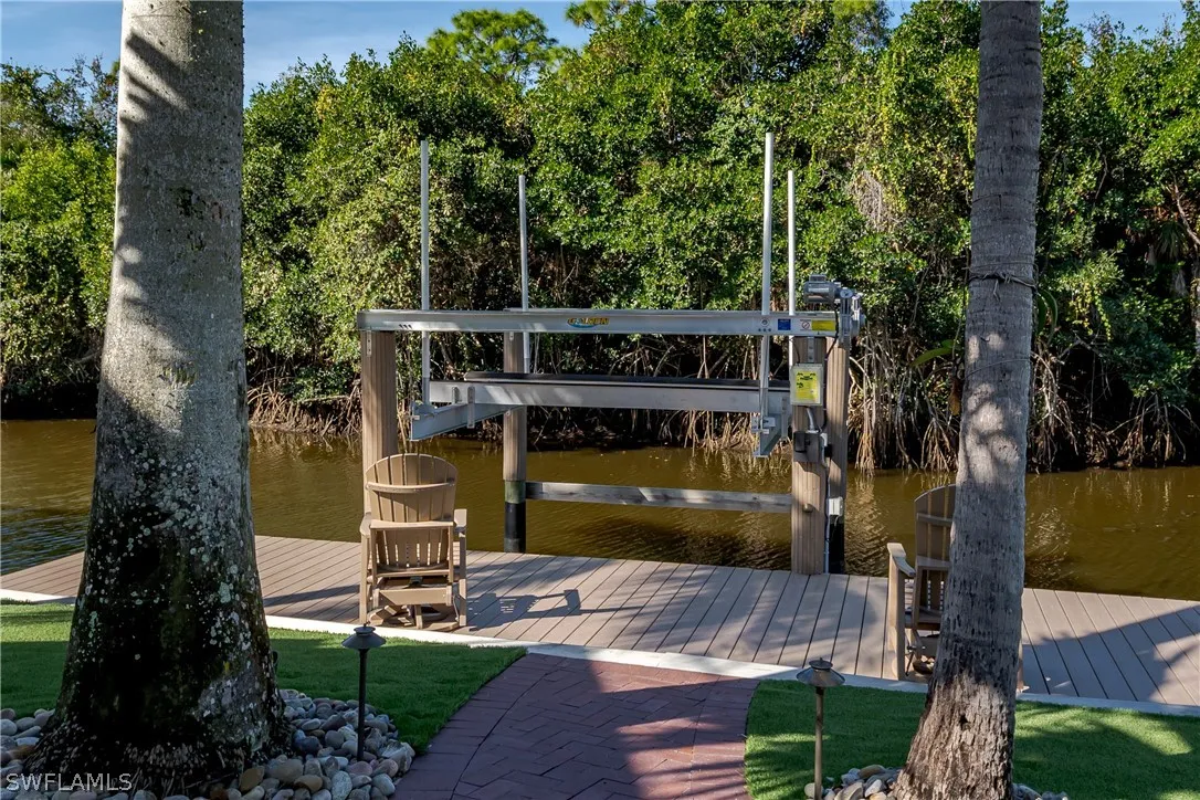 An Unparalleled Waterfront Casita Estate at Naples Motorcoach Resort on a Deeded 1.5-Lot. Presented is an extraordinary, Gulf-access waterfront estate within the prestigious gates of Naples Motorcoach Resort, a truly rare offering that sets a new standard for luxury motorcoach living. This one-of-a-kind compound seamlessly blends refined architecture, superior construction, and resort-level outdoor living with uninterrupted mangrove and water views, all with indirect access to the Gulf. At the heart of the property is a custom-designed, architecturally distinctive casita constructed with uncompromising quality and attention to detail. The structure is finished inside and out with a custom-color, 25-year Dryvit system, complemented by closed-cell spray foam insulation for superior energy efficiency, sound attenuation, and durability. The interior showcases matching porcelain tile and decking throughout, creating a cohesive, elevated aesthetic that flows effortlessly between indoor and outdoor spaces. Hurricane-rated folding glass doors and insect-free motorized screens allow the living areas to be fully opened or enclosed while preserving uninterrupted views of the natural mangrove backdrop. Dedicated climate control ensures year-round comfort. The designer kitchen and spa-inspired bath rival those found in luxury residences, featuring premium finishes, an oversized waterfall-style shower with thoughtfully positioned controls, a technology-enhanced illuminated mirror, and a top-tier automatic Toto toilet; delivering a true private spa experience. Exterior spaces are equally impressive and designed for both relaxation and entertaining. Custom powder-coated, lighted cable railings frame the property, enhancing both safety and ambiance after sunset. A separate open-air patio intentionally left uncovered provides the perfect setting for sunbathing, entertaining, and elegant outdoor dining in the open air with space for a grill, refrigerator, dining table, and lounge seating. The grounds are professionally landscaped with a curated selection of bamboo, gardenias, and palms, accented by automatic landscape lighting and app-controlled irrigation. Low-maintenance, high-end synthetic turf completes the outdoor environment with year-round beauty and ease of ownership. Features: In-Direct Gulf access via navigable waterways; Uninterrupted mangrove and water views; Largest dock in the resort, featuring a 15,000-lb boat lift; Hand-laid stone foundation and dramatic fire and water features; Underground propane system servicing multiple fire elements; Rooftop utilities including a 10-kW Generac generator; Options for additional covered carport parking. This is more than a property, it is a statement of distinction, craftsmanship, and Gulf-access waterfront luxury.