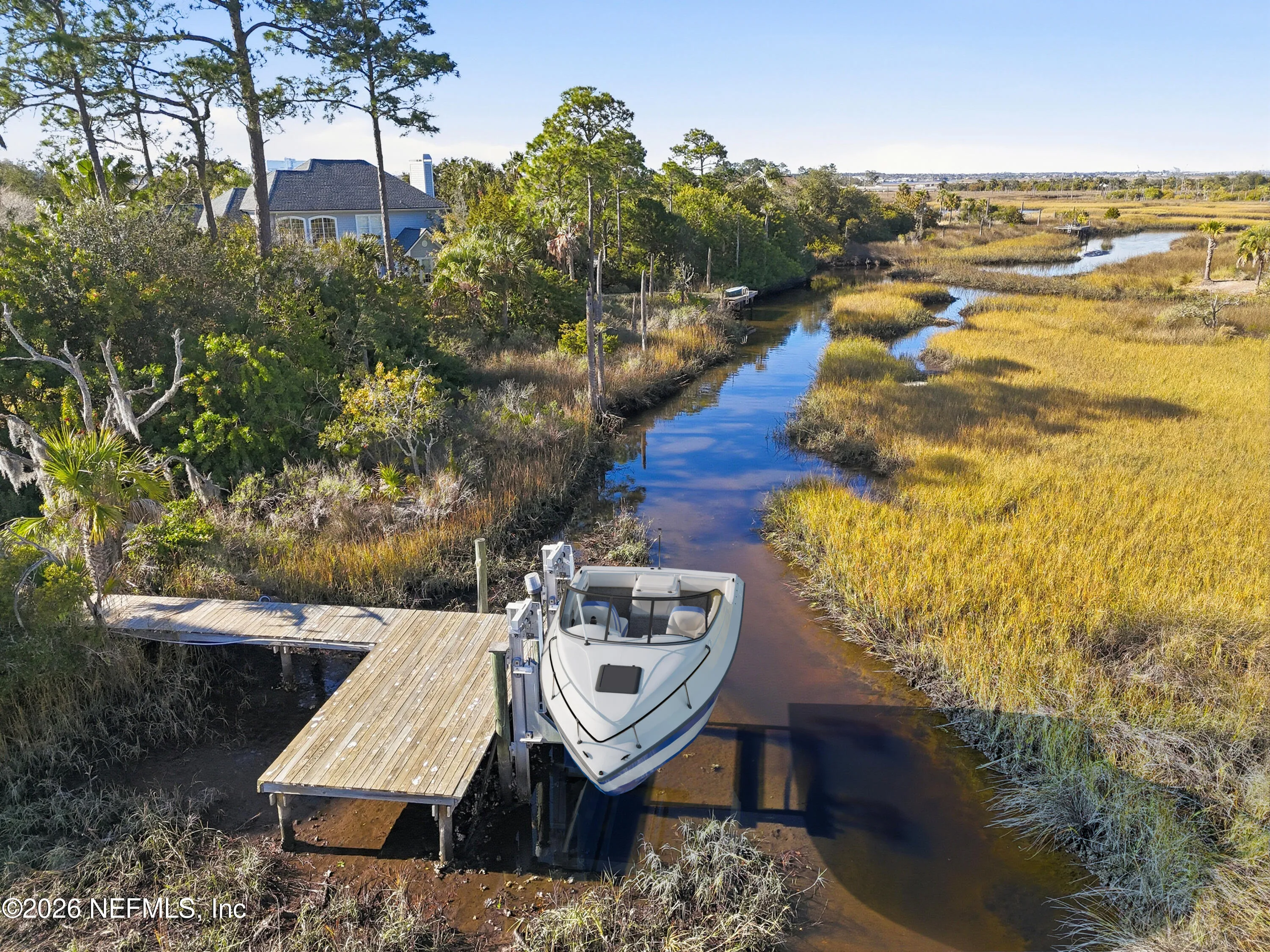 Tucked along a quiet tidal creek in the heart of Marsh Landing Country Club, this waterfront residence unfolds as a retreat where everyday life feels intentionally slowed. Sunlight pours through soaring windows, reflecting off the water beyond and setting the tone the moment you step inside. The home offers more than 4,400 square feet of thoughtfully designed living space, where open gathering areas flow seamlessly into intimate retreats. A dramatic two story family room anchors the main living space, creating a natural place for connection while framing tranquil views of the backyard and creek. The kitchen has been reimagined with a fresh coastal sensibility, blending crisp white cabinetry, updated surfaces, and statement appliances including SubZero and Viking, all designed to support both daily living and effortless entertaining. The primary suite is a true sanctuary, privately positioned and paired with a beautifully updated bath that feels more spa than residence. Additional bedrooms and baths are generously sized, offering flexibility for guests, family, or extended stays, while a dedicated office provides a quiet space to work or create. Outdoors, the home reveals its most compelling chapter. A screened lanai overlooks the pool and spa, with water views that shift with the tide and light throughout the day. A firepit invites evenings under the stars, while the creek side setting provides tidal access to the Intracoastal Waterway. The private dock includes a 4,000 lb boat lift, offering effortless access for boating and waterfront enjoyment. This is a home that balances scale with warmth, elegance with ease, and luxury with livability. A rare opportunity to experience waterfront living within one of Ponte Vedra Beachs most established gated communities.