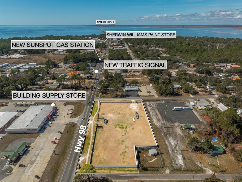 1.68 acres of prime commercial property with exceptional visibility and access on US Highway 98, centrally located in the heart of Eastpoint - the gateway to St. George Island. This highly visible corner-influenced parcel offers approximately 400 feet of frontage on Hwy 98 and an additional 200 feet of frontage on Franklin Street, providing excellent exposure and flexible site planning options. FLDOT-approved ingress and egress from Highway 98 is already in place, a significant advantage for future development. The property is cleared, level, and development-ready, with water and sewer taps already onsite. The location benefits from substantial recent and ongoing infrastructure investment, including new paving along Highway 98 and a newly installed traffic signal approximately 500 feet from the property, enhancing accessibility and traffic flow. The surrounding corridor continues to gain momentum with new commercial development underway, including a national paint store and a new gas station nearby, reinforcing the areas growing commercial appeal. The site is also conveniently located near a county park and boat ramp serving both year-round residents and the strong seasonal traffic headed to St. George Island and historic Apalachicola, just minutes away. With an AADT of approximately 5,800, strong frontage, approved access, and visible signs of growth, this property presents a compelling opportunity for investors, developers, or owner-users seeking an early position in an expanding coastal market.