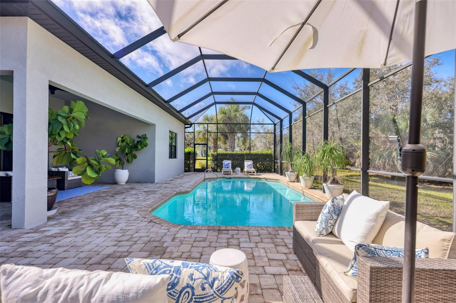 On a premium cul-de-sac lot, next to a large open lot of greenspace, this upgraded Pinnacle shows true pride of ownership! Loaded with features including zero-corner glass sliders, hurricane impact windows, high ceilings, crown moldings, tray and coffered ceilings, bump-out bay window, plantation shutters, custom California Closet built-ins and more. The gourmet kitchen with a natural gas cooktop has an oversized quartz island and stainless steel KitchenAid appliances. Elegant exterior living space with a totally private custom pool is enclosed in an oversized screen cage with expansive dining and sunbathing spaces. An extended three-car garage could accommodate all your toys. Hammock Preserve sits on 80 acres of beautiful land in Palmer Ranch. Residents enjoy an active lifestyle in the expansive Clubhouse with a Community Room for scheduled events, Library and Meeting Rooms, Fitness Center, Catering Kitchen and Bahama Bar, Heated Lap Pool and Spa, Fire Pit and 2 Poolside Grills. The furry members of your family will love meeting friends at the Dog Park; youll make your own friends playing Bocce, Tennis or Pickle Ball!
