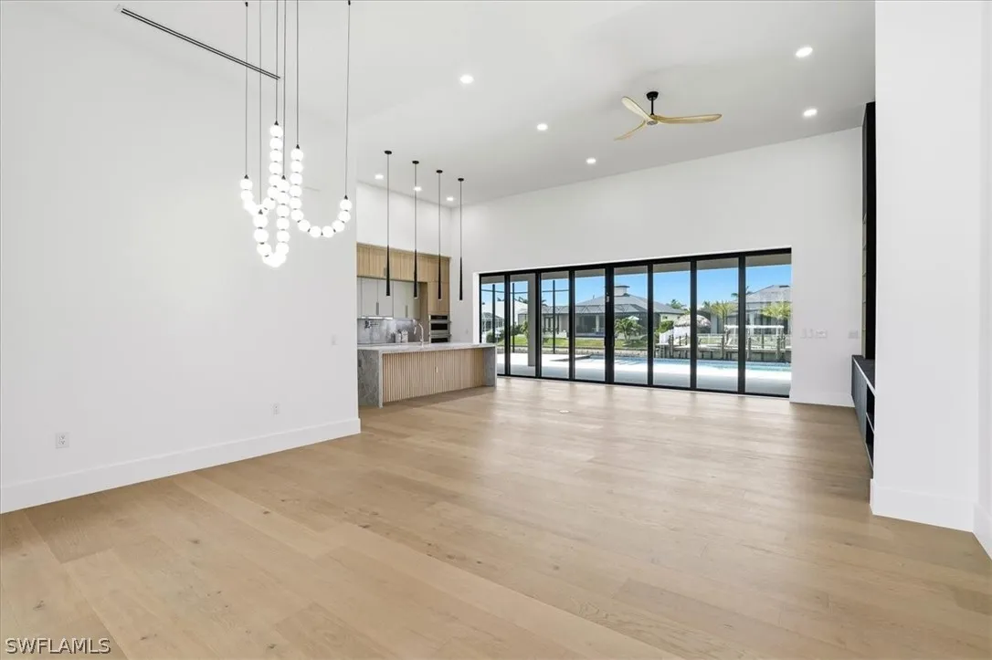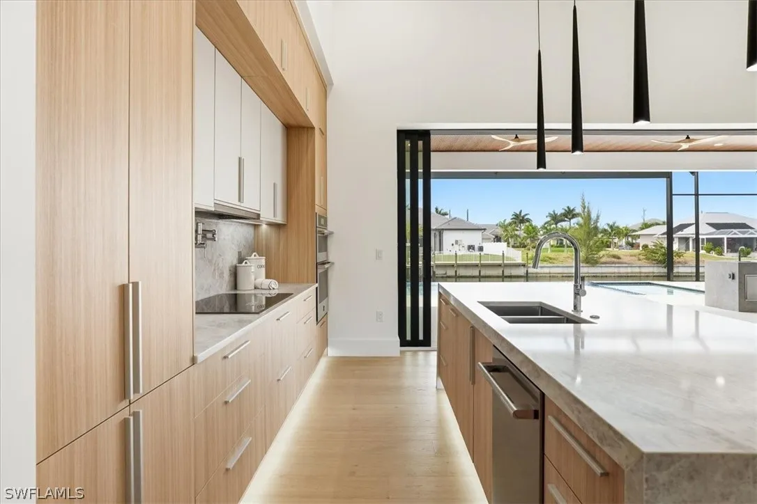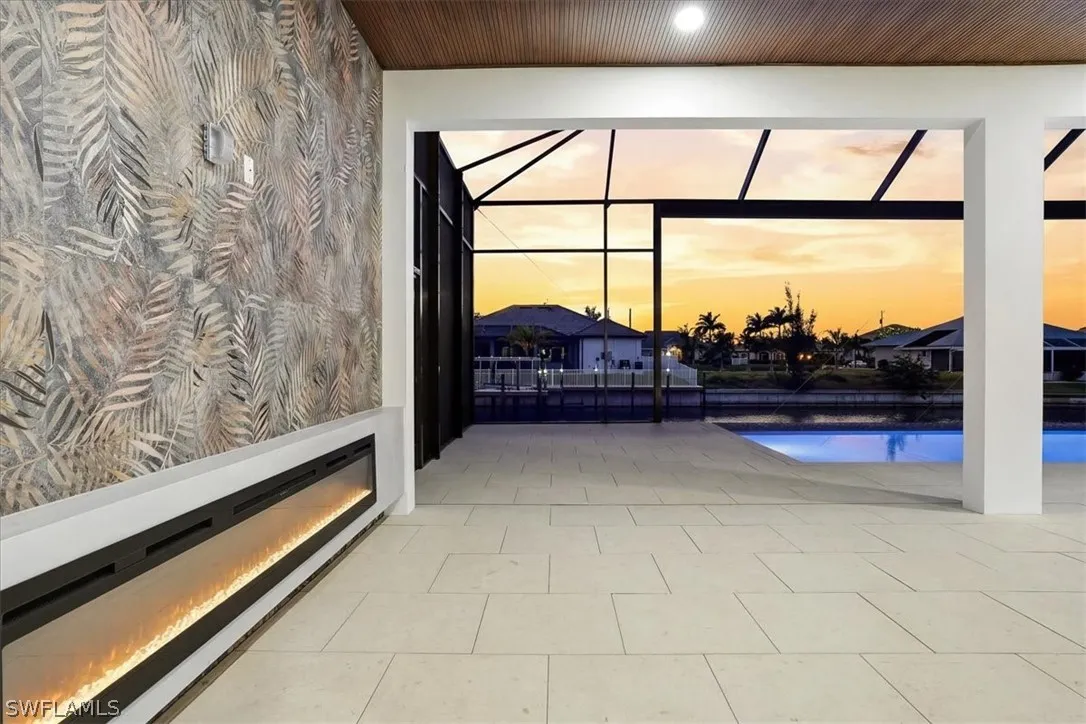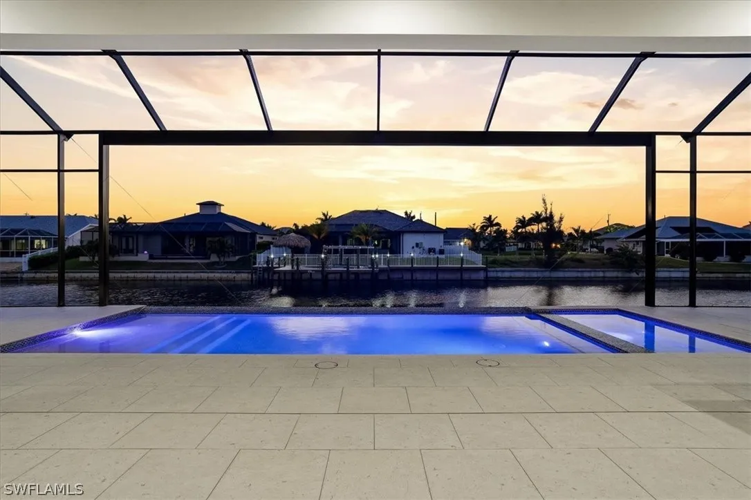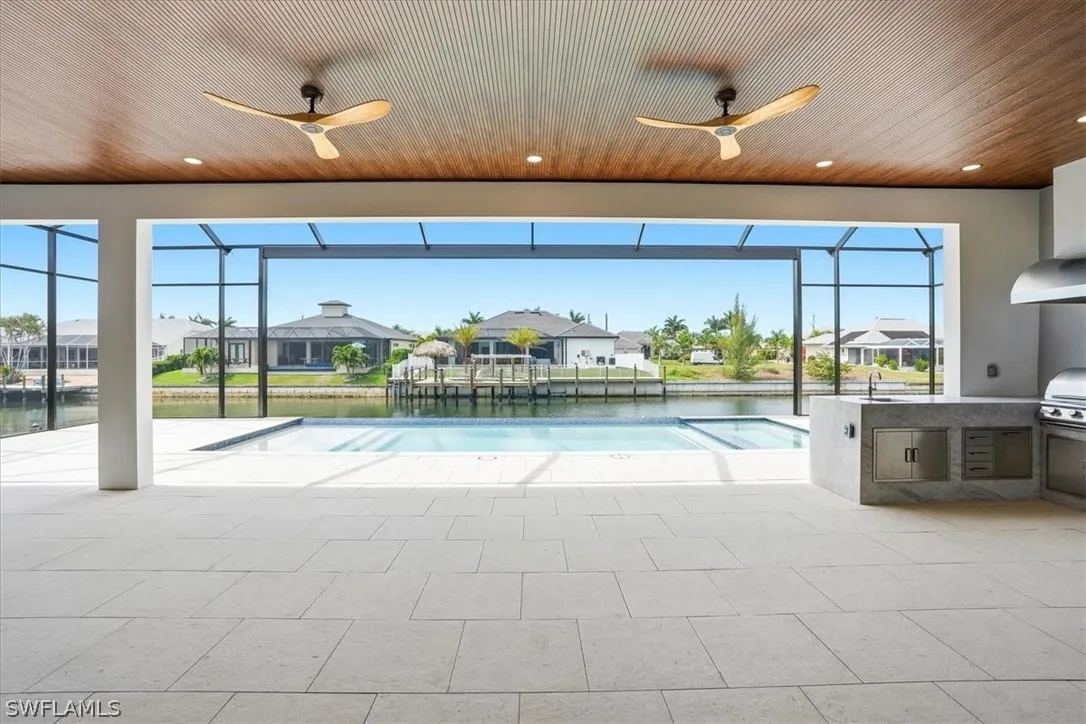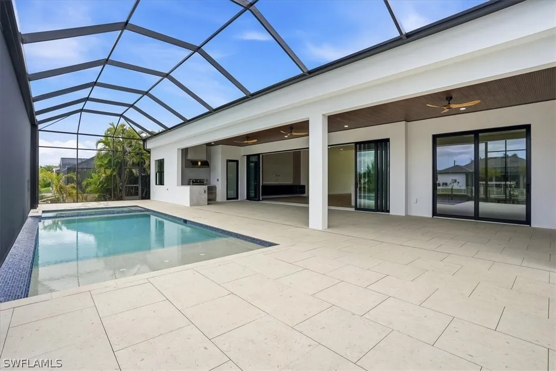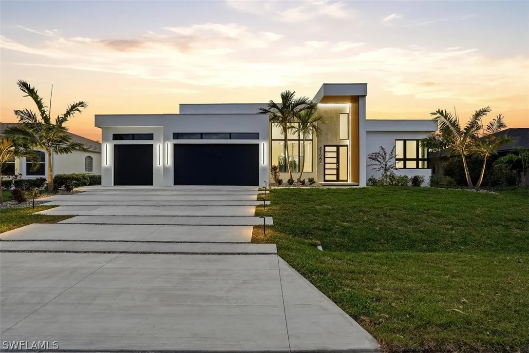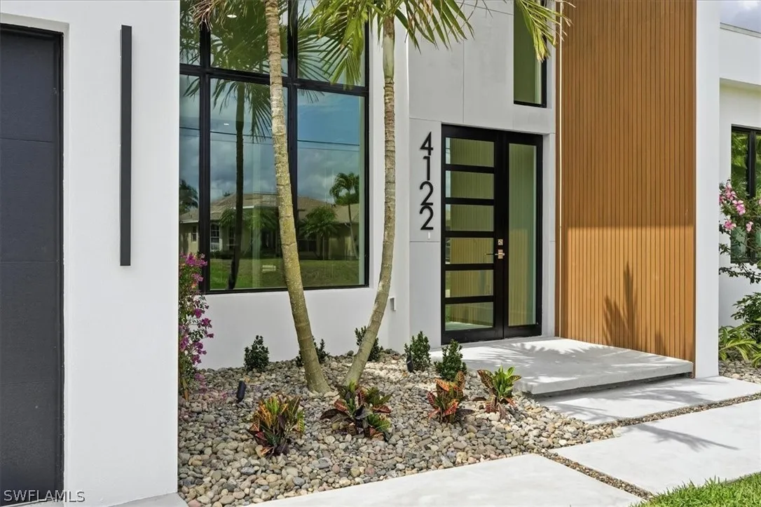 Welcome to 4122 SW 27th Place, an exceptional ultra modern waterfront residence that blends striking contemporary architecture with refined coastal living. Positioned on a 100 foot wide canal with desirable western exposure, this custom home offers beautiful sunset views and a peaceful waterfront setting in one of Southwest Cape Corals most quiet and desirable neighborhoods. The home immediately impresses with its bold architectural presence, featuring a dramatic modern facade, flat roof design, expansive glass, and a grand two story entry that fills the interior with natural light. Inside, the open concept layout showcases impressive ceiling heights ranging from 14 to 16 feet in the main living areas, creating a bright and airy atmosphere designed for both comfort and entertaining. At the heart of the home is a beautifully designed chefs kitchen anchored by a large statement island with waterfall edges, custom cabinetry, and high end finishes. The space flows seamlessly into the dining and living areas, where a striking custom entertainment wall with polished concrete finishes, built in cabinetry, and integrated design elements creates a dramatic focal point. Just off the main living space, a stunning glass wine display with an adjacent beverage bar adds a sophisticated architectural feature perfect for hosting and entertaining. The residence offers four spacious bedrooms and three full bathrooms. The primary suite is designed as a private retreat, featuring serene views, a generous walk in closet, and a spa inspired bathroom complete with a freestanding soaking tub, oversized glass shower, and elegant modern finishes. One of the homes most impressive elements is its seamless indoor/outdoor living experience. Large sliding glass doors open to an expansive covered lanai, creating a natural extension of the interior living space. The outdoor area features a resort style pool and spa, a fully equipped outdoor kitchen, and a dramatic linear fireplace feature wall that adds warmth and ambiance to the lanai while overlooking the tranquil canal. The property sits on a 100 foot wide canal with one bridge and approximately 45 minutes to open water, offering enjoyable boating access while maintaining a calm and protected waterfront environment. The backyard currently provides a clean waterfront canvas, allowing future owners the opportunity to design and build a custom dock tailored to their boating lifestyle. Additional highlights include hurricane impact insulated windows and doors, extensive LED lighting throughout the home, modern architectural finishes, and thoughtful design details that enhance both comfort and visual appeal. Situated on a quiet street that ends in a cul-de-sac with only a few neighboring homes, the property offers privacy and minimal traffic while remaining conveniently positioned near shopping, dining, marinas, and entertainment throughout Cape Coral.