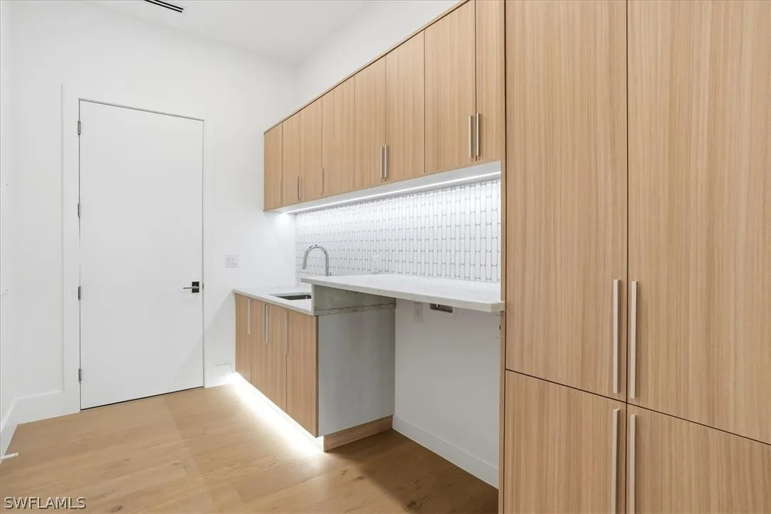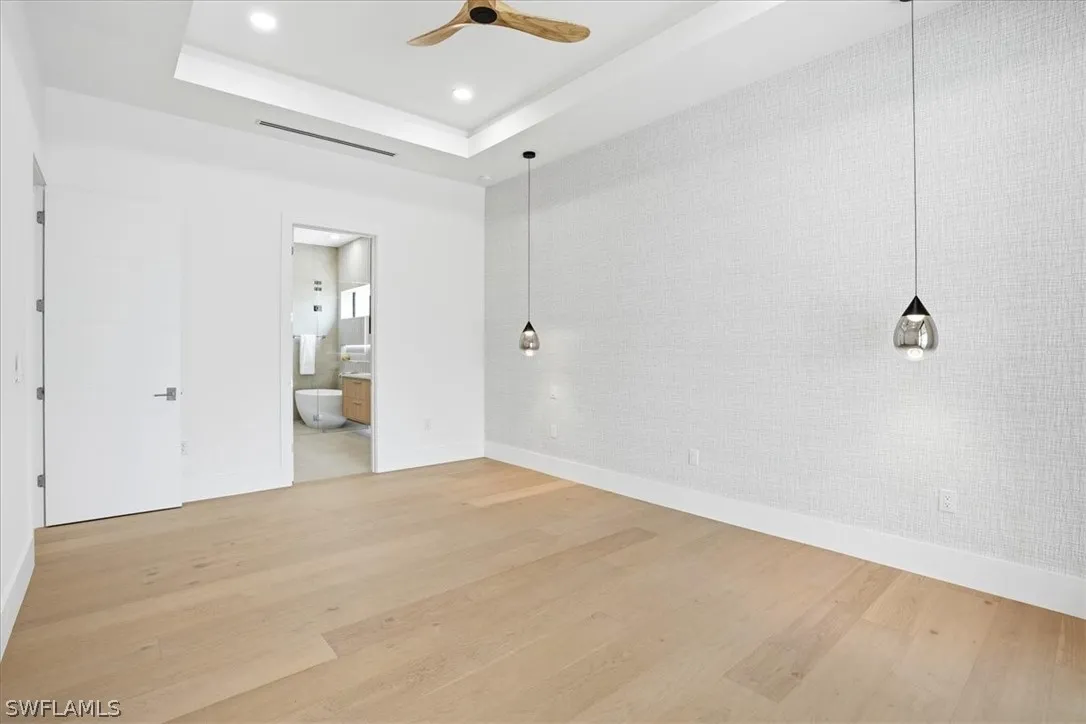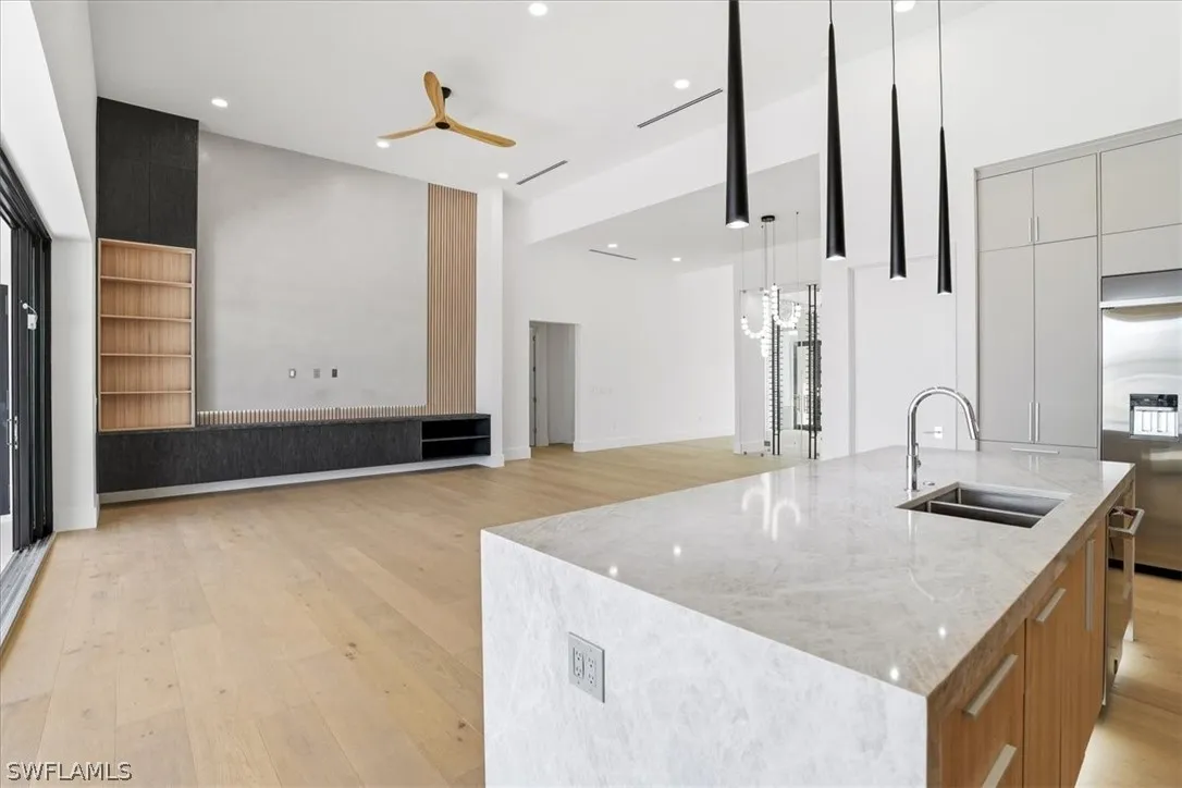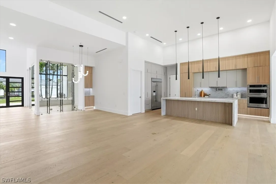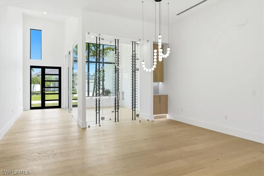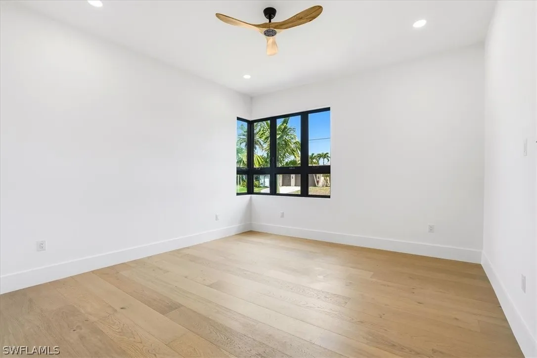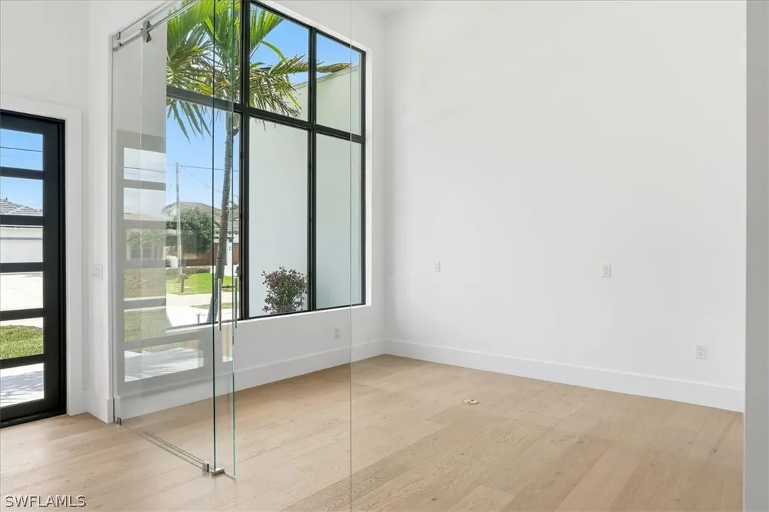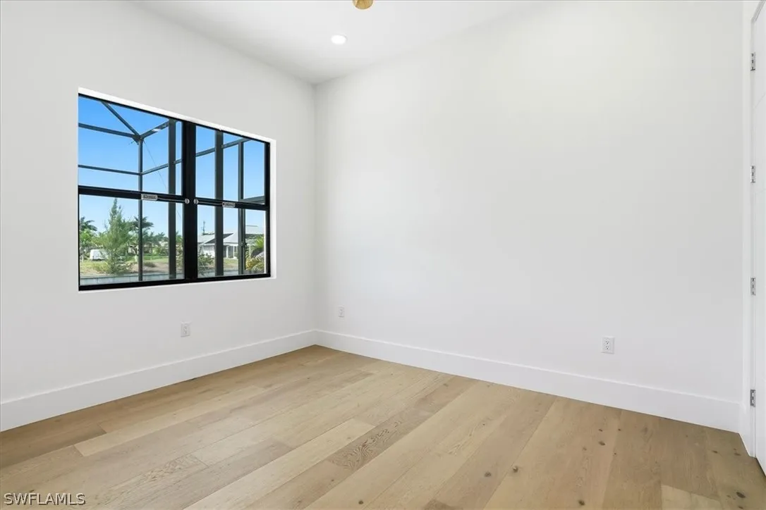 Welcome to 4122 SW 27th Place, an exceptional ultra modern waterfront residence that blends striking contemporary architecture with refined coastal living. Positioned on a 100 foot wide canal with desirable western exposure, this custom home offers beautiful sunset views and a peaceful waterfront setting in one of Southwest Cape Corals most quiet and desirable neighborhoods. The home immediately impresses with its bold architectural presence, featuring a dramatic modern facade, flat roof design, expansive glass, and a grand two story entry that fills the interior with natural light. Inside, the open concept layout showcases impressive ceiling heights ranging from 14 to 16 feet in the main living areas, creating a bright and airy atmosphere designed for both comfort and entertaining. At the heart of the home is a beautifully designed chefs kitchen anchored by a large statement island with waterfall edges, custom cabinetry, and high end finishes. The space flows seamlessly into the dining and living areas, where a striking custom entertainment wall with polished concrete finishes, built in cabinetry, and integrated design elements creates a dramatic focal point. Just off the main living space, a stunning glass wine display with an adjacent beverage bar adds a sophisticated architectural feature perfect for hosting and entertaining. The residence offers four spacious bedrooms and three full bathrooms. The primary suite is designed as a private retreat, featuring serene views, a generous walk in closet, and a spa inspired bathroom complete with a freestanding soaking tub, oversized glass shower, and elegant modern finishes. One of the homes most impressive elements is its seamless indoor/outdoor living experience. Large sliding glass doors open to an expansive covered lanai, creating a natural extension of the interior living space. The outdoor area features a resort style pool and spa, a fully equipped outdoor kitchen, and a dramatic linear fireplace feature wall that adds warmth and ambiance to the lanai while overlooking the tranquil canal. The property sits on a 100 foot wide canal with one bridge and approximately 45 minutes to open water, offering enjoyable boating access while maintaining a calm and protected waterfront environment. The backyard currently provides a clean waterfront canvas, allowing future owners the opportunity to design and build a custom dock tailored to their boating lifestyle. Additional highlights include hurricane impact insulated windows and doors, extensive LED lighting throughout the home, modern architectural finishes, and thoughtful design details that enhance both comfort and visual appeal. Situated on a quiet street that ends in a cul-de-sac with only a few neighboring homes, the property offers privacy and minimal traffic while remaining conveniently positioned near shopping, dining, marinas, and entertainment throughout Cape Coral.