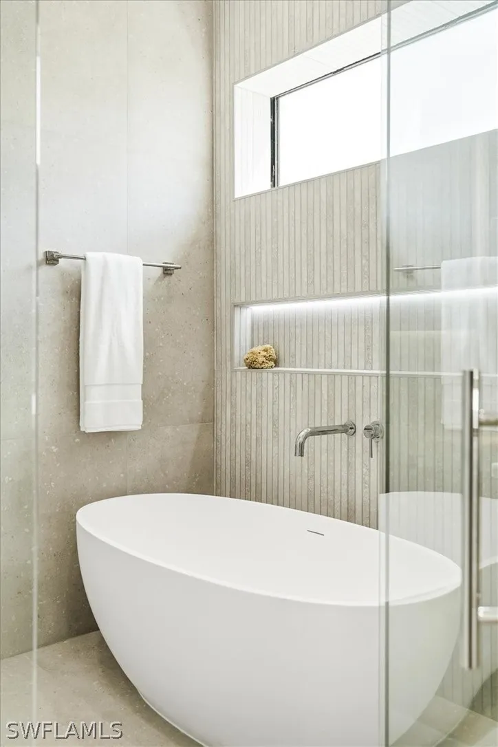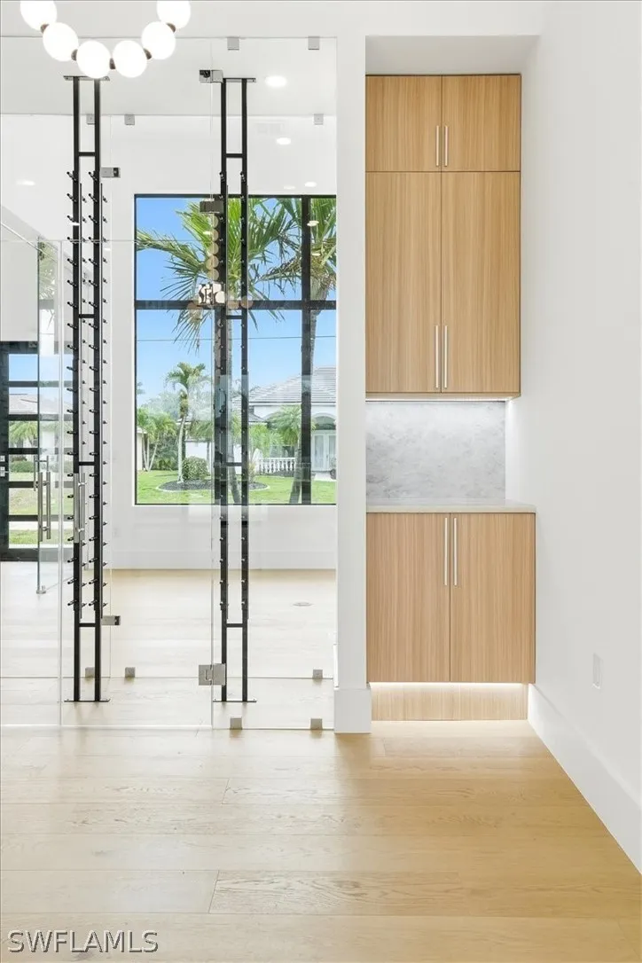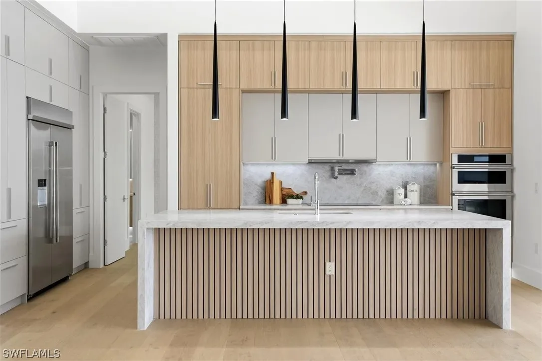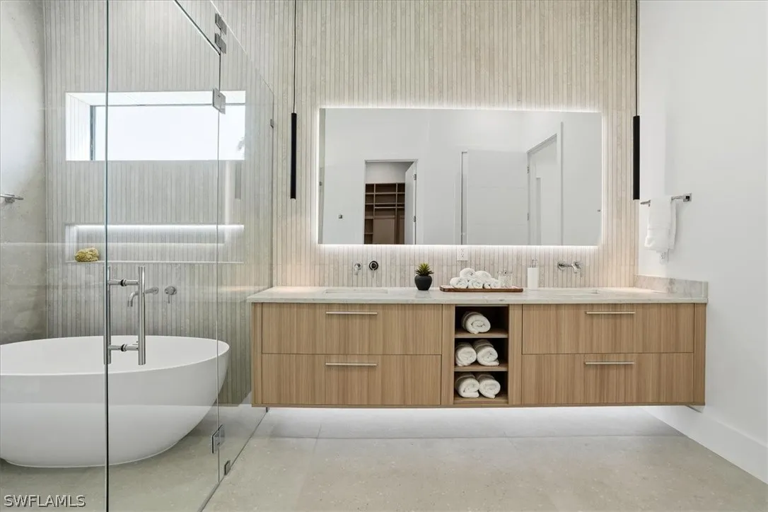 Elegant simplicity meets refined lakefront luxury; this impeccably crafted three-bedroom residence with a private study, three baths, and a three-car garage is gracefully set along a rare, boatable 220 acre-sized lake, offering opportunities for boating and fishing, right from your own backyard. The eastern exposure bathes the home in soft morning light, delivering stunning sunrises and creating the ideal backdrop for entertaining in the expansive outdoor living area, where a resort-style pool, spa, and fully appointed outdoor kitchen invite year-round enjoyment. Inside, sophisticated design meets thoughtful detail. Custom wood beams and designer lighting accentuate the homes soaring volume ceilings, while wood-look tile flooring flows seamlessly throughout, providing both elegance and continuity. The chefs kitchen is a statement in both form and function, featuring Monogram appliances, a gas cooktop, quartz countertops and backsplash, a beautifully integrated butlers pantry plus wine and beverage bar, ensuring effortless entertaining and everyday ease. Every space reflects a commitment to quality and timeless style. Beyond the home, residents enjoy exceptional resort-caliber amenities, including a lakefront beach, waterfront dining, state-of-the-art fitness center, marina, pickleball and tennis courts, and more. Perfectly located minutes from premier shopping, fine dining, FGCU, and Southwest Florida International Airport, this residence offers both privacy and convenience in equal measure. An exceptional offering for the discerning buyer - experience it in person.