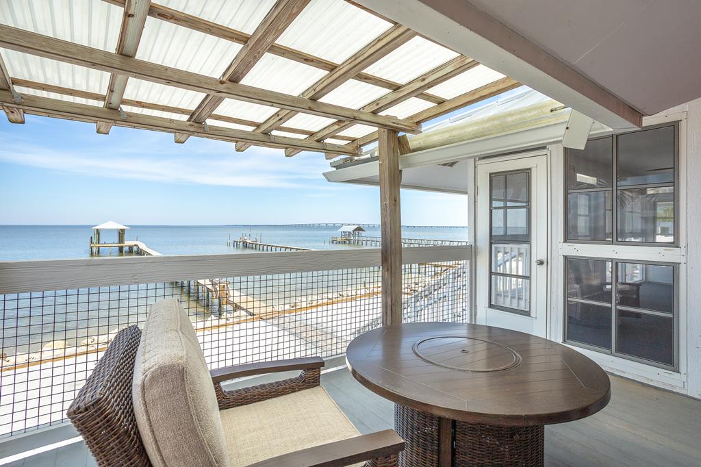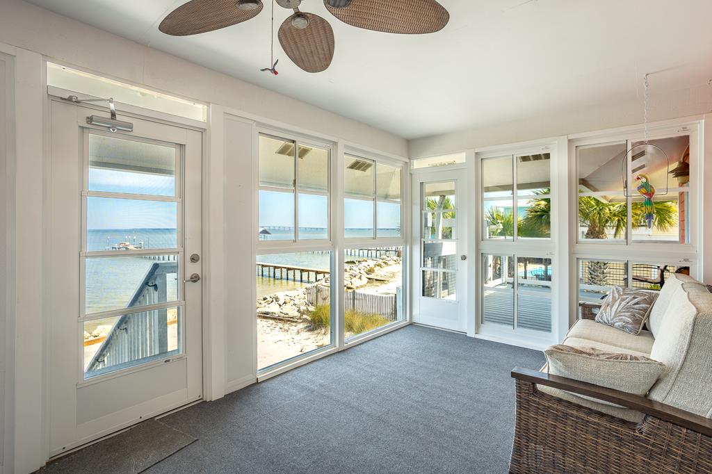 Enjoy breathtaking sunsets over the Bay from this well- maintained waterfront home located in a quiet, golf-cart-friendly neighborhood on St. George Island. Perfect for a family fishing retreat, full-time residence, or investment property, this home features a private dock with covered 15,000lb boat lift and and a fish cleaning station, making it ideal for anglers and boaters alike. A durable vinyl seawall with rip rap protects the shoreline, while your own sandy beach area offers the perfect place to relax and enjoy the water. Multiple outdoor living spaces - including two sun decks, and a large enclosed porch with window AC overlooking the bay. Inside, the home offers comfortable single-level living with granite countertops, tile flooring in the main living areas, and beautifully refinished pine floors in the bedrooms. The split-bedroom floor plan provides privacy, and the spacious primary suite features an en-suite bath and cedar-lined walk-in closet. The master and one guest bedroom open to sun porches with water views. Additional features include cedar-lined closets, a handy cargo lift, and two large storage areas underneath the home as parking space for a golf cart or small boat. Located just a short walk to beach access at 7th Street, this well-cared-for property has never been a rental but offers excellent potential as a vacation rental investment.