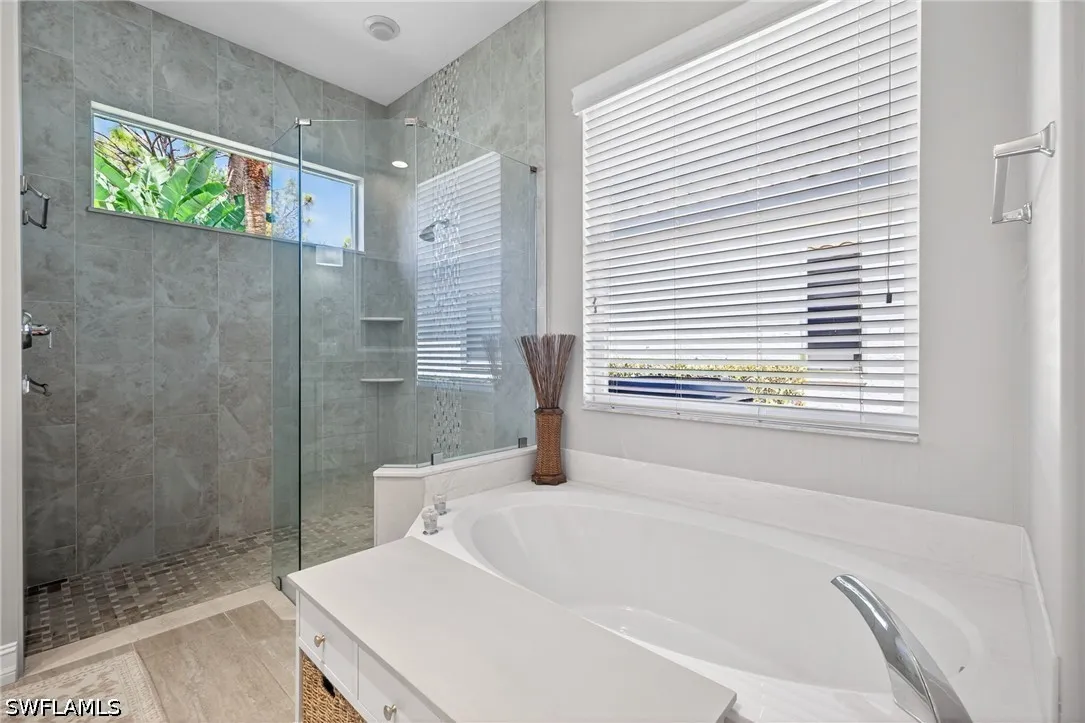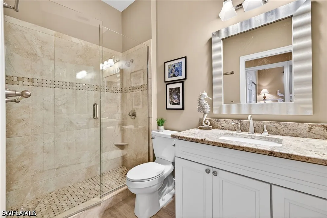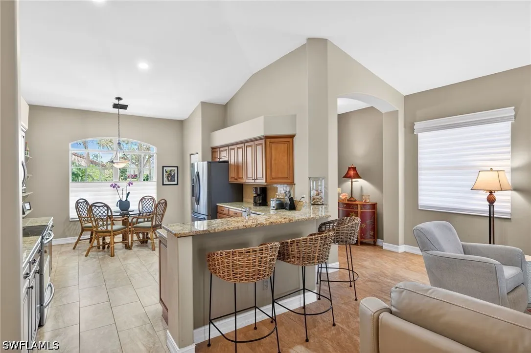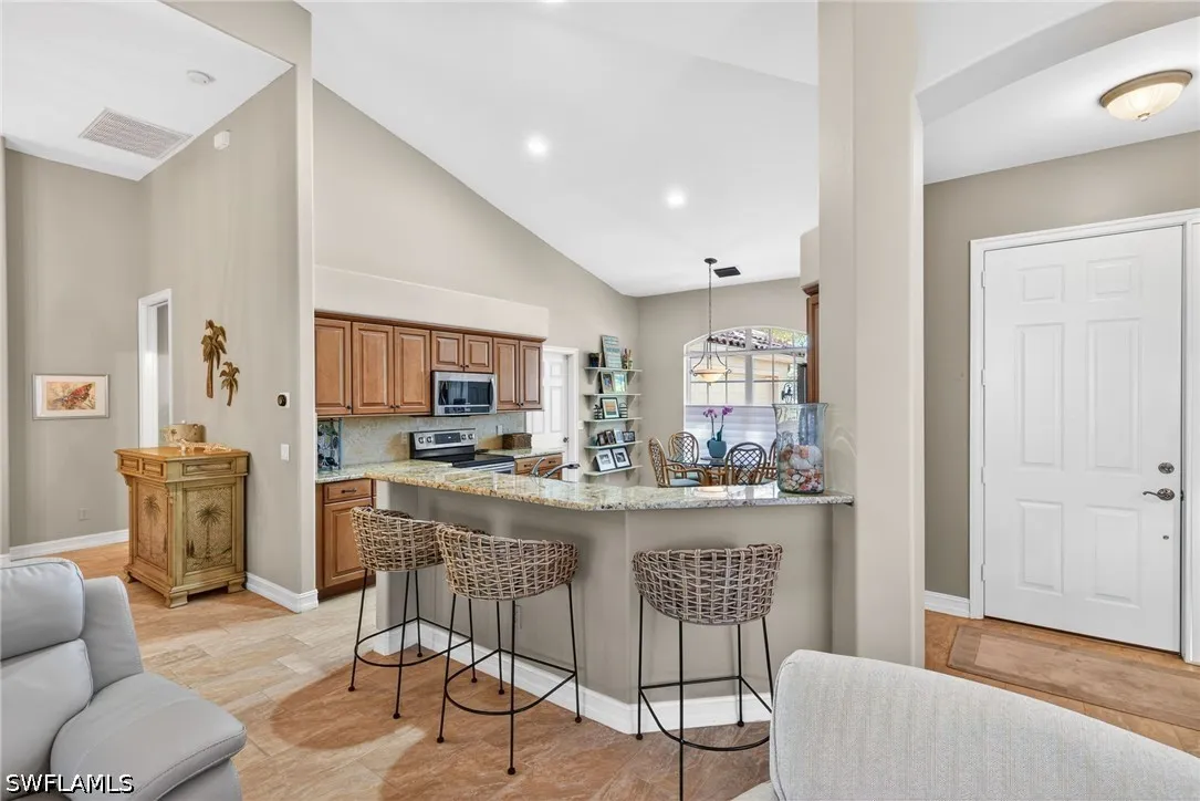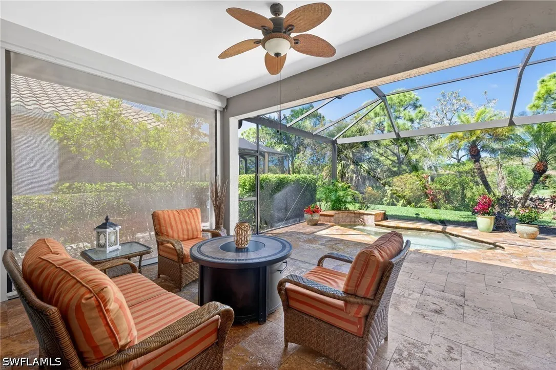 Welcome to this beautifully updated single-family home in the sought after Glen Eagles neighborhood in Pelican Sound, the areas finest bundled golf community. This elegant and tastefully updated home features an open great room floor plan designed for easy Florida living and entertaining. The chefs kitchen showcases granite countertops, Samsung stainless steel appliances, soft-close cabinetry, and a marble tile backsplash. The primary suite offers private lanai access, a walk-in closet, and a fully renovated en-suite bath with dual sinks, a walk-in shower with seamless glass, and a relaxing soaking tub. A separate guest wing provides two guest bedrooms and an updated bath with granite countertop and frameless shower door, ensuring comfort and privacy for visitors. Outdoor living shines with an expansive travertine-tiled lanai - perfect for alfresco dining or morning coffee - complete with an oversized in-ground spa and picture-frame screened enclosure overlooking the golf course and a stunning bougainvillea bush. Additional upgrades include wood-look ceramic tile throughout the living areas, hurricane screens, newer A/C and water heater, a new roof (2019), and a two-car garage with epoxy flooring and built-in storage cabinets. This home blends style, quality upgrades, and exceptional indoor-outdoor living. This home is being sold turnkey furnished, ready for its new owner to move in and start living a dream lifestyle! If you are looking for an active lifestyle look no further: 27 holes of Championship golf, 14 pickleball, 8 tennis and 6 bocce courts. State of the art fitness center that is professionally staffed. Pelican Sound is nestled up to the Estero River with access to the Gulf. The community offers dry boat storage, kayaks, canoes and paddle boarding, along with a shuttle boat to Lovers Key State Beach Park. Minutes from RSW International airport and surrounded by fabulous shopping and restaurants. Start living the dream!