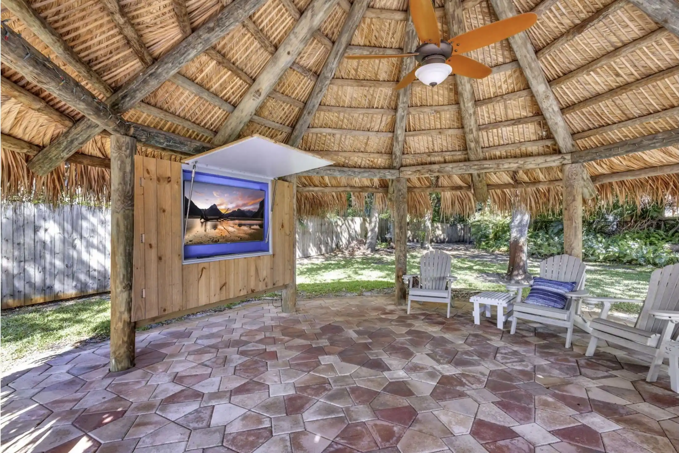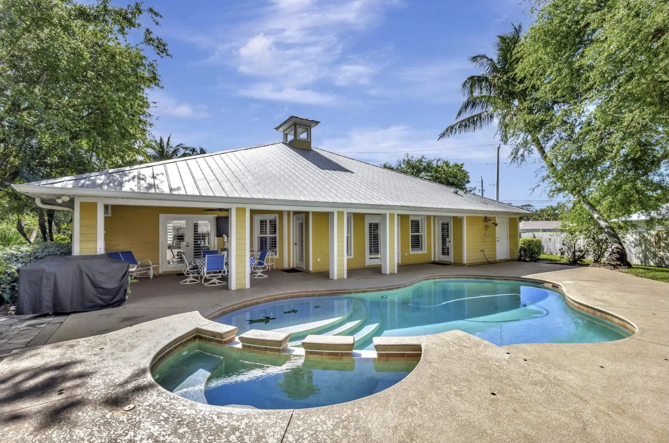 Discover Key West charm in the heart of Stuart! This stunning 4-bedroom, 2.5-bath home is perfectly nestled along picturesque, tree-lined St. Lucie Boulevard, and built with concrete block construction, a metal roof, and impact glass for ultimate peace of mind. Enjoy the additional convenience of being generator-ready and a gas connection available for the range. The owner's suite features two walk-in closets, the versatile fourth bedroom is configured as an office, and the open living space flows seamlessly to a covered lanai, heated pool & spa, and a tiki hut with TV--perfect for entertaining! The fully fenced, lushly landscaped .67-acre property features a gated, circular driveway, dedicated space for a trailer and RV with a 30-amp hookup, and a 10' wide side-gate for boat and trailer