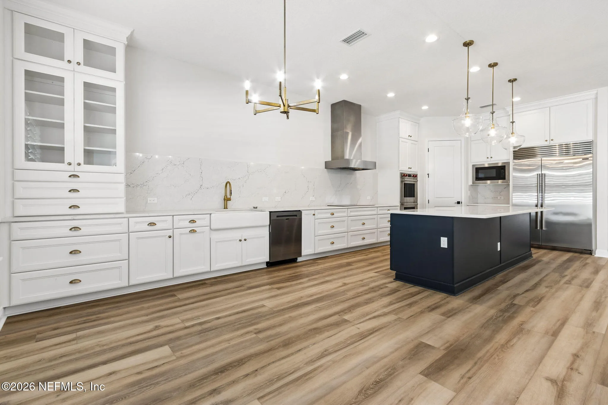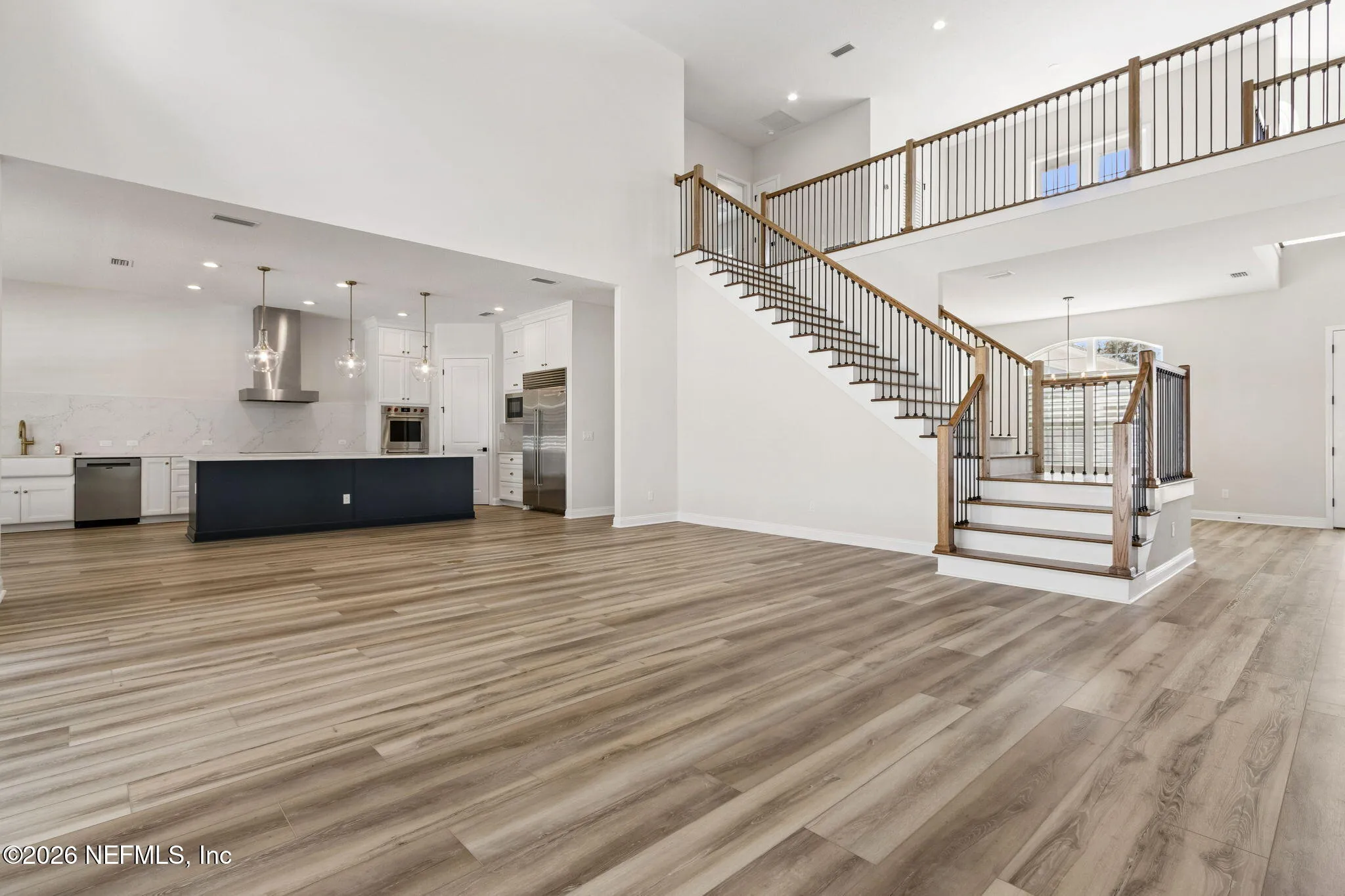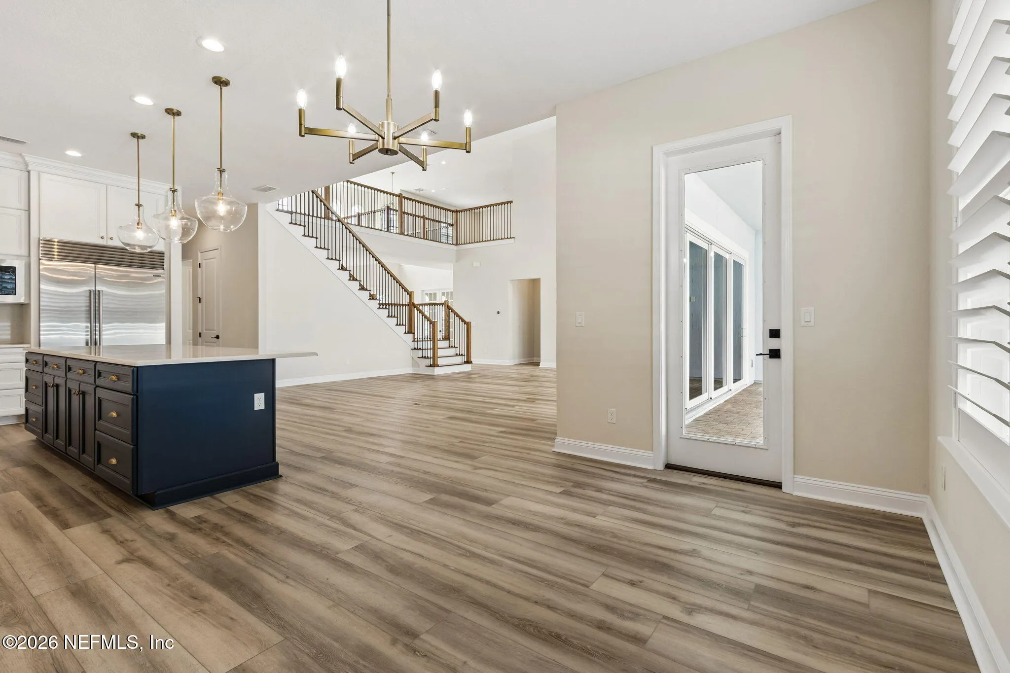 Welcome to this stunning luxury residence located in the highly sought-after gated community of Plantation Estates within Julington Creek Plantation. From the moment you step inside, you are greeted by soaring 22-foot ceilings in the grand foyer and expansive great room, creating a light-filled and impressive first impression. The open-concept floor plan features a beautifully designed living space highlighted by a floor-to-ceiling shiplap fireplace and triple sliding glass doors that seamlessly connect indoor and outdoor living. A private flex space with glass French doors offers the perfect setting for a home office or study. The chefs kitchen is a true showpiece, featuring a massive 10-foot island, Cambria quartz countertops, double-stacked Diamond Vibe cabinetry with soft-close drawers, and premium Wolf appliances. Elegant finishes and thoughtful design continue throughout, including Coretec luxury vinyl plank flooring with a 30 mil wear layer extending through the main living areas, upstairs loft, media room, and hallways. The first-floor primary suite provides a private retreat with a spa-like bathroom showcasing quartz countertops, a jetted soaking tub, and a spacious sit-in shower, complemented by Kohler fixtures. An additional bedroom and full bath on the first floor offer flexibility for guests or multi-generational living. Upstairs, youll find additional bedrooms, a media space, and loft area, all designed with comfort and functionality in mind. Additional upgrades include 10-foot ceilings, plantation shutters, upgraded carpet padding in bedrooms, a fully equipped laundry room with new cabinetry, countertops, and sink, as well as a water softener system. Step outside to enjoy the generously sized 0.32-acre lot featuring a variety of mature fruit and nut trees including pecan, satsuma orange, navel orange, fig, and Joey avocado--creating a private and inviting backyard retreat. Residents of Julington Creek Plantation enjoy resort-style living with access to exceptional amenities including multiple aquatic facilities, a fitness center, tennis courts, sports fields, parks, playgrounds, and miles of walking and biking trails. The community also features a championship golf course, recreation center, and year-round events for all ages. Excitingly, a brand-new state-of-the-art aquatic center on Davis Pond Road is underway, featuring a resort-style family pool with slide tower, separate adult pool, competition pool, clubhouse, and gathering spaces--further elevating the lifestyle this community offers. This exceptional home combines luxury, space, and top-tier community amenities in one of St. Johns Countys most desirable locations.