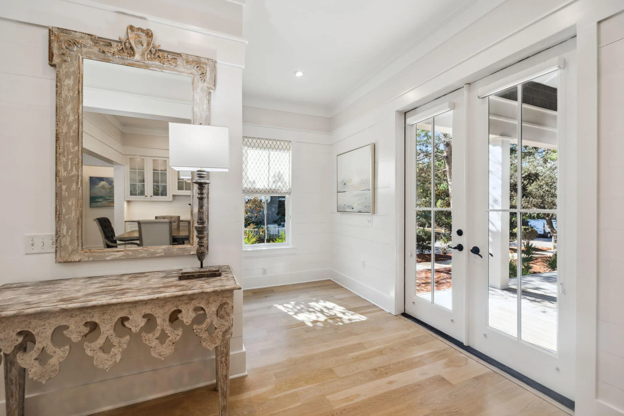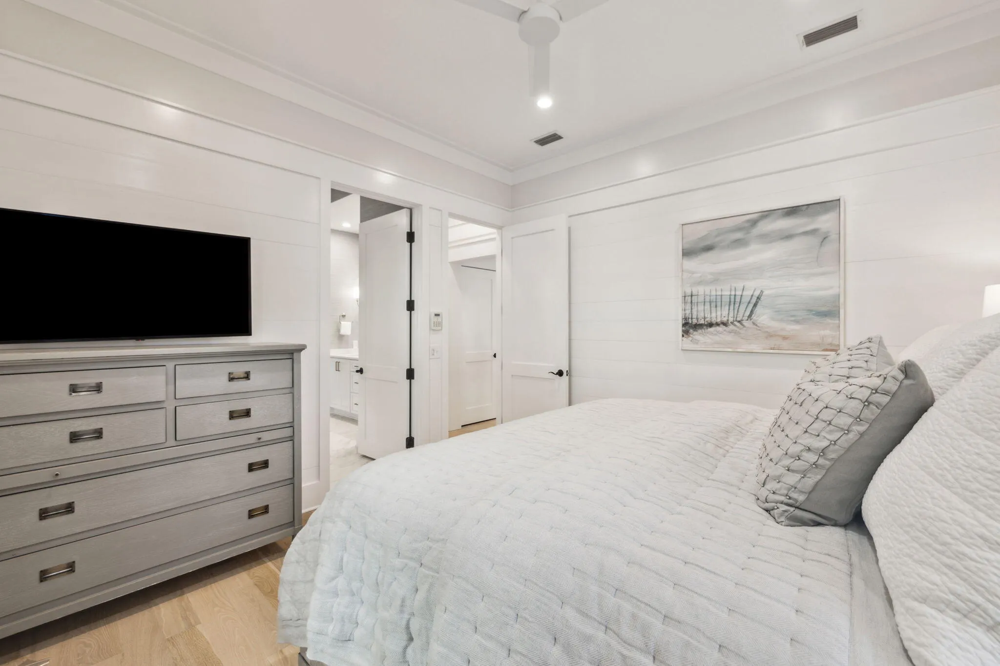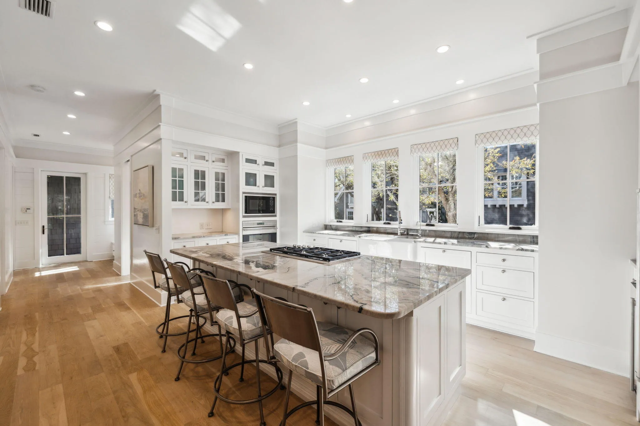Totally remodeled Watersound Beach home with room for all your family and friends has 6 BRS in the main house, 2 on the main floor including the primary suite with 4 Ensuite Bedrooms Upstairs is ready to call your own! You will find an additional king bed in the carriage house which has a full kitchen. The home boasts high-end finishes, quartz and quartzite countertops, and a brick fireplace.