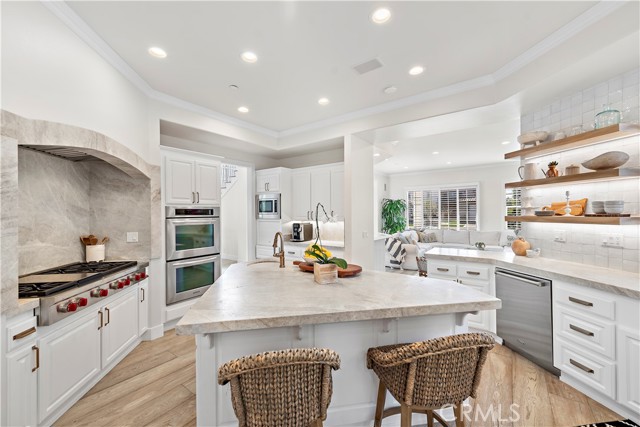 Tucked away on a premier oceanfront cul-de-sac in the guard-gated Cyprus Cove, this stunning coastal craftsman blends timeless elegance with relaxed beachside charm. Classic Eastern Seaboard architecture, rustic brick detailing, and lush landscaping create striking curb appeal, while a covered front lanai offers the perfect place to unwind. Inside, dual steel-framed Dutch doors open to a bright, airy layout with soaring ceilings, exposed wood beams, and wide-plank whitewashed flooring throughout. The sunken living room features a cozy fireplace, flowing into a generous family room with a wet bar and lime-washed brick fireplace. The chef's kitchen is a showstopper, boasting lacquered cabinetry, leathered quartzite countertops, farmhouse and prep sinks, a Sub-Zero fridge, a new Wolf range, double ovens, a walk-in pantry, and a charming shiplap breakfast nook. The main level also includes a formal dining room, stylish laundry, powder bath, and a spacious guest suite. Upstairs, the luxurious primary suite offers peek-a-boo ocean views, a private deck, fireplace, sitting area, spa-like bath, and dual walk-in closets. Two additional suites and a staircase lead to the rooftop deck—an entertainer's dream with panoramic views of Catalina, Dana Headlands, and stunning sunsets. Just one home from the oceanfront, this remodeled residence is in a vibrant, family-friendly community offering a private beach with access to Trestles surf break, sport courts, a clubhouse, pool/spa, 24-hour security, and a nearby park. A rare opportunity in one of San Clemente's most coveted locations!