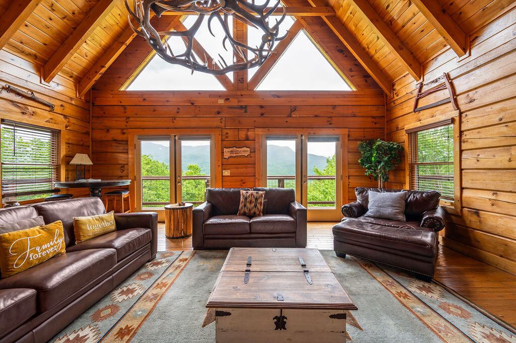 Projection of 140,000! Bring an offer, Seller is motivated! Active STR permit with Pittman Center sleeping 18 occupants! Updates, updates, updates and VIEWS!! New stain, new Trex decking on all three decks, new metal roof, new outdoor furniture, new living room set, games, refrigerator, septic riser, and stairs to hvac room, the list goes on and on! This rare gem is nestled amidst the majestic Smokies! This luxurious 5BD/5.5BA, 4,500 sq ft log cabin offers unparalleled mountain living, where breathtaking vistas of Greenbrier Pinnacle and the iconic Smoky Mountains greet you from the expansive rear decks and balconies. Ideally situated, it's a scenic drive to downtown Gatlinburg, the Great Smoky Mountains National Park, and countless attractions. Step inside, and you'll be greeted by the warm ambiance of vaulted ceilings and a majestic stone fireplace in the spacious living room. The open-concept design seamlessly integrates the gourmet kitchen and dining area. The primary suite boasts a private bath and walk-in closet, offering a serene retreat. Ascend to the second loft level, where two bedrooms with ensuite bathrooms and a recreation room with a pool table await. The lower level features a media room, two additional bedrooms with private baths, and ample space for your desired lifestyle. Located in desirable Pinnacle Vista subdivision, which has large lots with beautiful views. You're only minutes to Bent Creek Golf Course and numerous hiking trails. Also convenient to I40 at the Newport exit, which avoids tourist traffic. Seize this opportunity to own a piece of Smoky Mountain paradise before it's gone.