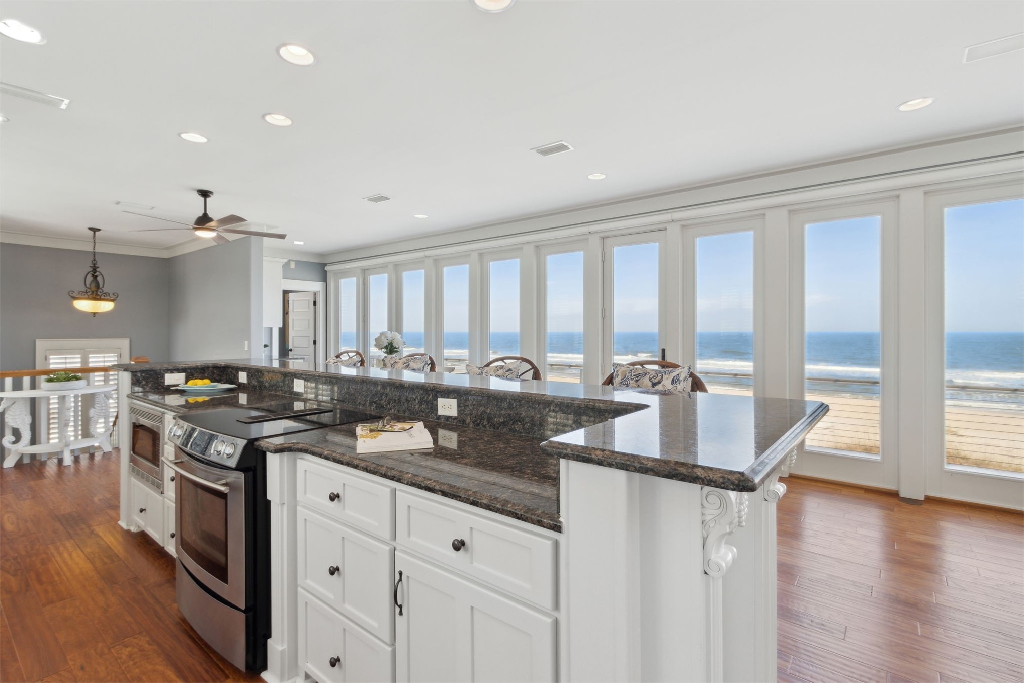Impeccably maintained, this OCEANFRONT MASTERPIECE boasts 75 FEET OF DIRECT OCEAN FRONTAGE and a GENEROUSLY SIZED LAYOUT WITH BEDROOMS THAT SLEEPS 10. Built with a CEMENT BLOCK, HARDYBOARD EXTERIOR and NEWER HVACs & GALVANIZED METAL ROOF, it boasts both a majestic presence and incredible durability against the elements. No long boardwalks, no hauling beach gear, this is true oceanfront living. Unlike many oceanfront areas further down the road, THIS HOME IS POSITIONED ON A NON-DRIVABLE SECTION OF BEACH, OFFERING UNINTERRUPTED VIEWS, NATURAL DUNES, AND A FAR MORE PRIVATE COASTAL EXPERIENCE. Spanning a well-designed layout, IT MAXIMIZES OCEAN VIEWS AT EVERY LEVEL effortlessly connecting all living space by a PRIVATE ELEVATOR for convenient access. The top floor main living area is designed for relaxed coastal living, with a WALL OF FLOOR-TO-CEILING GLASS DOORS THAT FRAME JAW-DROPPING OCEAN VIEWS AND OPEN ONTO A SPRAWLING DECK, perfect for sunrises and stargazing. The airy OPEN-CONCEPT layout flows beautifully from kitchen to dining to living, with all spaces oriented toward the ocean. The CHEF'S KITCHEN features a large eat-in island, premium white cabinetry, granite counters, and a wet bar for easy entertaining. All BEDROOMS ARE OVERSIZED AND FEATURE AN ENSUITE BATH, ALONG WITH PANORAMIC OCEAN AND BEACH VISTAS. STYLISH FURNISHINGS ARE NEGOTIABLE and create a fun beachy vibe, while premium finishes add touches of luxury and indulgence. ENJOY 10 FOOT CEILINGS, GAS FIREPLACE AND NO CARPET—ONLY WARM CHERRY-HUED PLANK FLOORING for low-maintenance beachside living. LOCATED JUST ONE WALKABLE MILE FROM DINING AND ENTERTAINMENT, this turn-key coastal retreat is designed for joy, relaxation, and lifelong memories.