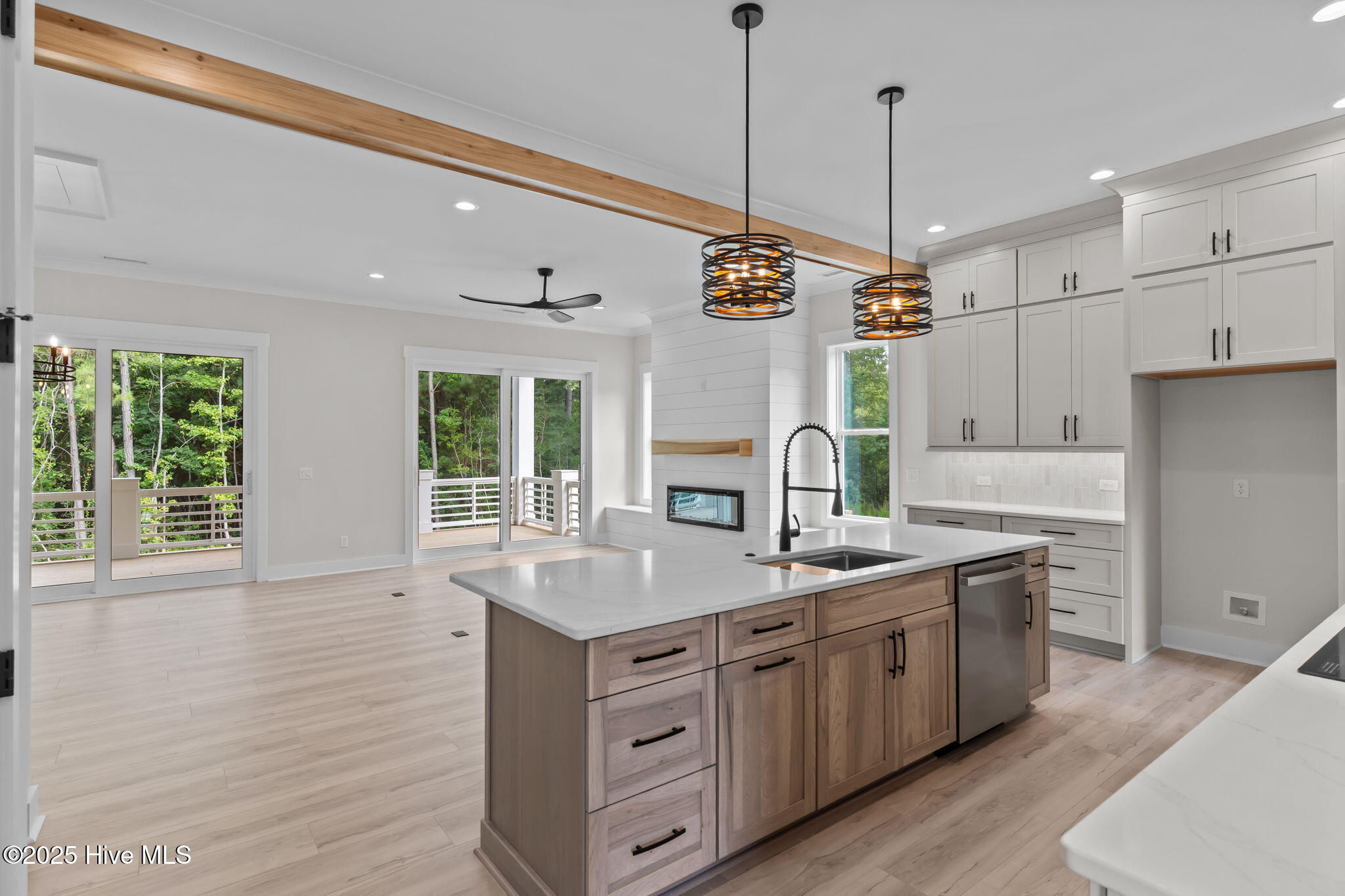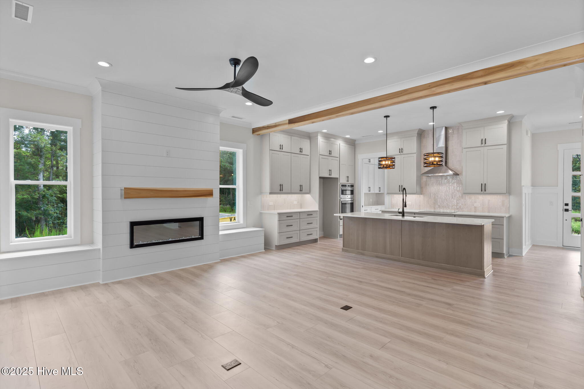 Welcome to luxury living in the coveted Marsh Landing Place! Situated on a beautiful .21-acre lot, this new construction home offers 3,251 sqft of stunning space. Step inside to enjoy an open floor plan, gorgeous luxury vinyl plank floors, and a sleek linear electric fireplace that frames picturesque views of your private, wooded backyard. The chef's kitchen showcases quartz countertops, soft-close cabinetry, 60'' cabinets with stacked uppers, stainless steel appliances, an expansive island, and a custom walk-in pantry. Your first-floor master suite offers a serene retreat, complete with vaulted ceilings, a large walk-in closet, and private access to the covered porch. The spa-like bathroom is designed for relaxation, featuring dual vanities, a soaking tub, and a fully tiled walk-in shower. Upstairs, a large gathering room is perfect for a media room or playroom, with sliding doors to the covered porch. A second primary suite boasts a luxurious bathroom with a zero-entry, fully tiled shower. Two additional bedrooms are strategically placed for maximum privacy, while the fourth bedroom enjoys easy access to the third full bathroom. Designed with versatility in mind, this home includes a dedicated office space, perfect for remote work or a home gym, plus a bonus bunk bedroom for extra guests. On the ground level, you'll find two garage bays, a mudroom, and optional elevator access to all levels, ensuring convenience at every turn. The private backyard overlooks the lush tree line, offering a peaceful natural setting to unwind. Living in Marsh Landing Place means access to resort-style amenities, including walking trails, a swimming pool, and a clubhouse. Plus, you're just minutes from Mayfaire shopping center, Wrightsville Beach, and some of the area's best dining and entertainment options. This is more than just a home--it's a lifestyle. Please note some website feeds are displaying an error, the HOA dues are 120/month.