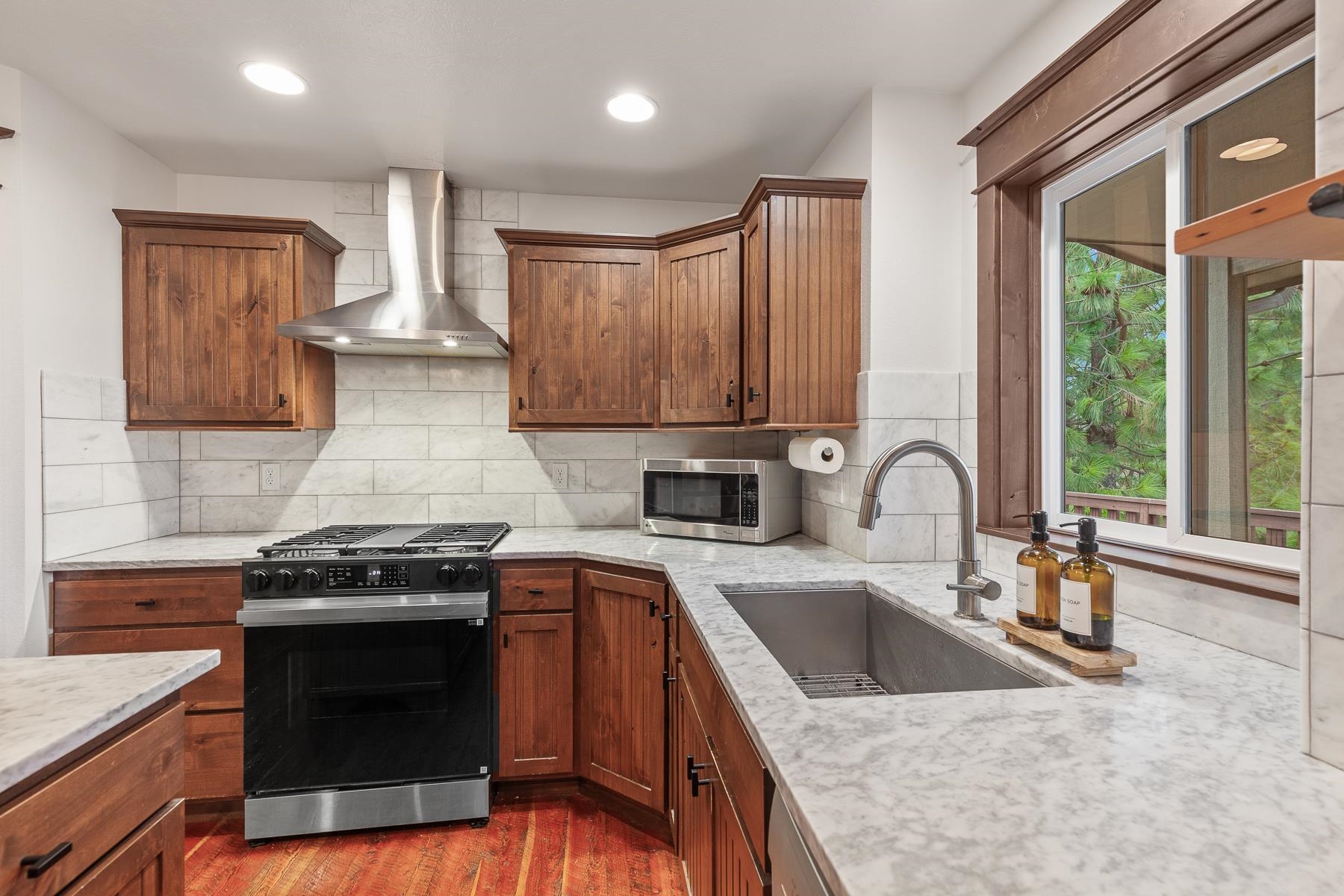 Beautifully upgraded 3-story Craftsman w/ panoramic views in desirable Five Mile area. Borders protected conservation land for natural views and privacy. Main level features cathedral ceilings, expansive windows, built-ins, and double-sided stone fireplace. Chef's kitchen w/marble countertops, custom cabinetry, updated stainless steel appliances, center island, and walk-in pantry.