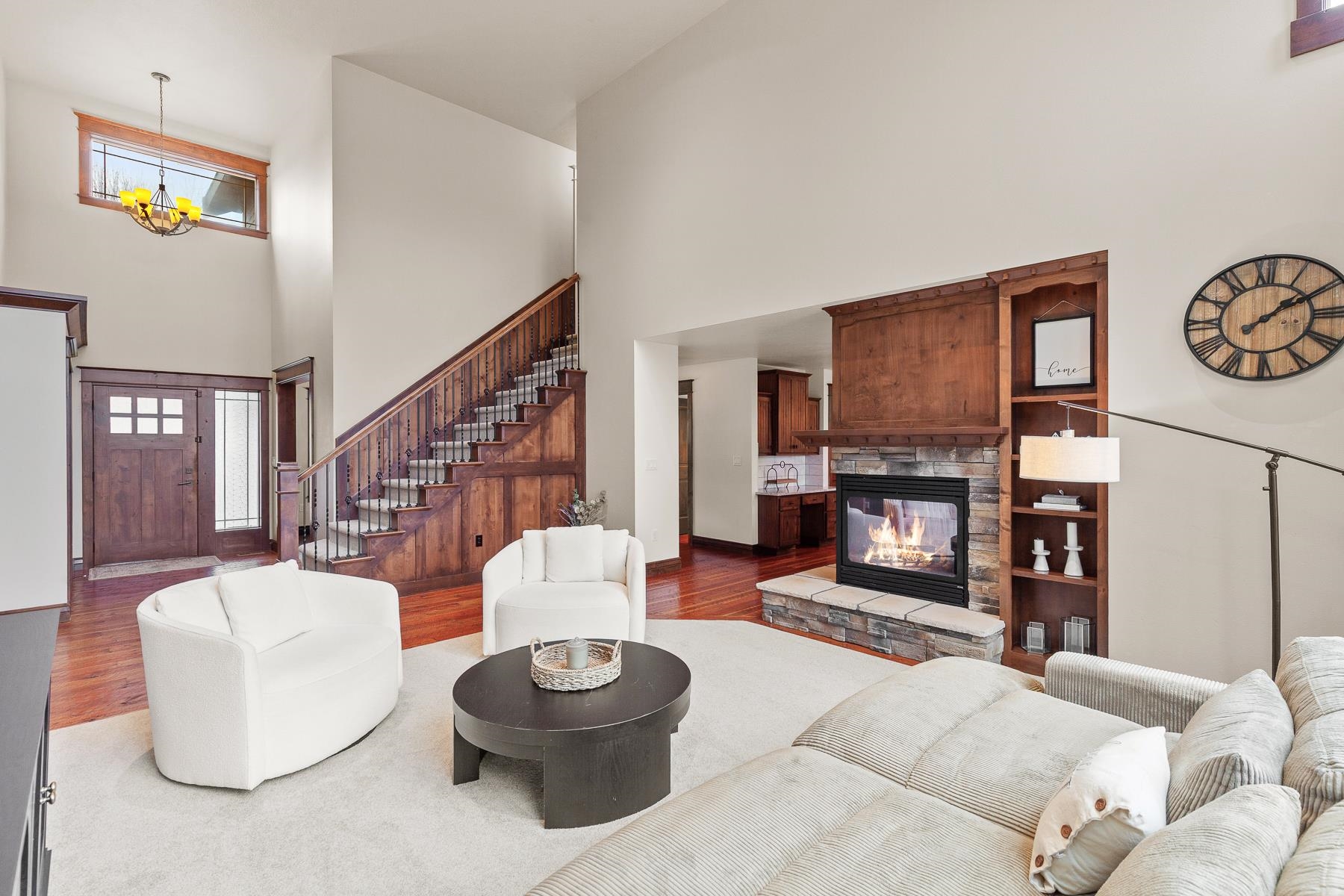 Experience refined luxury in this elegant new-construction home. A wide, welcoming entry leads into a breathtaking great room with an 18' ceiling and sleek gas fireplace with a one of a kind custom mantle hewn from a tree harvested on the property- a striking blend of craftsmanship and local history, setting the stage for sophisticated living.