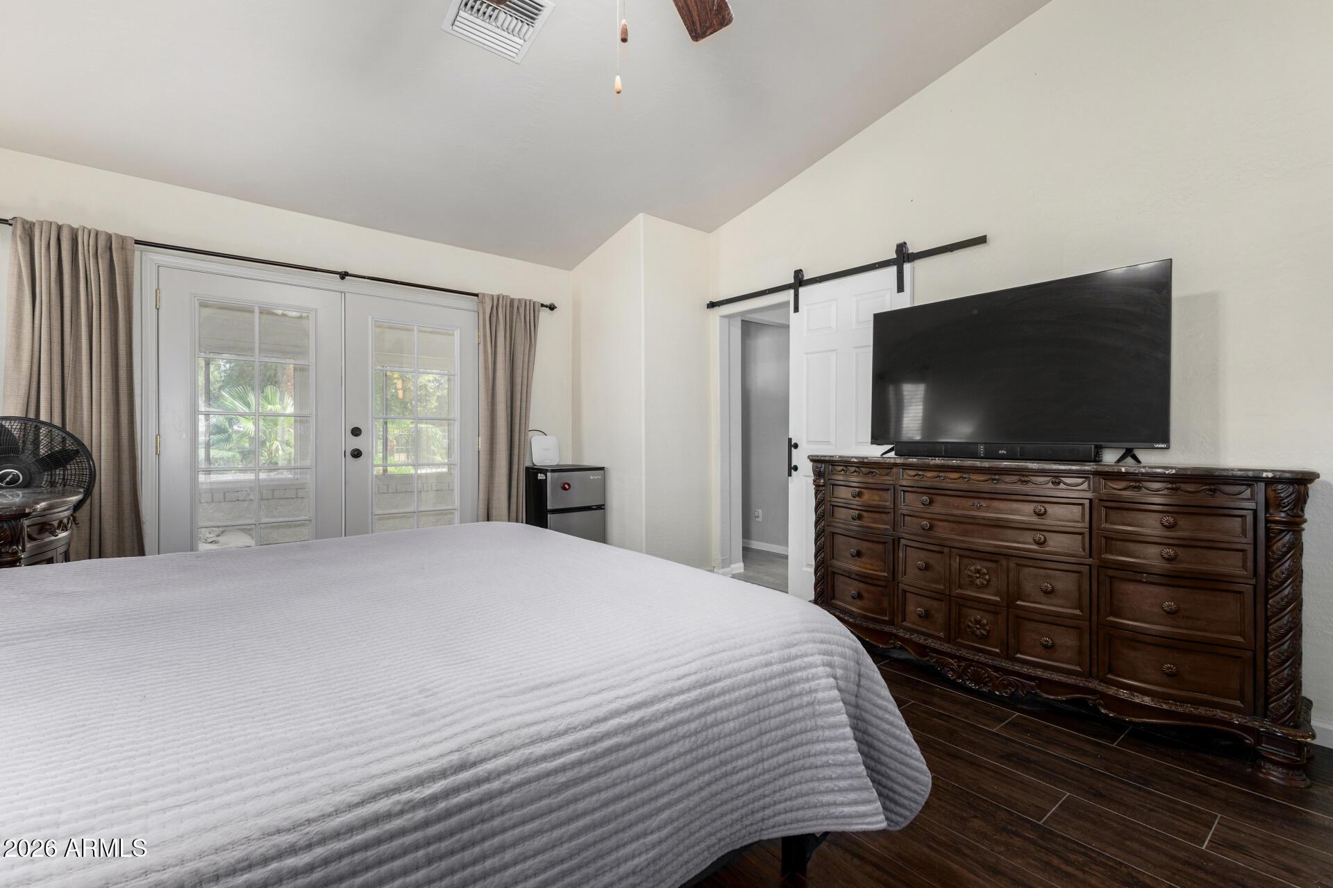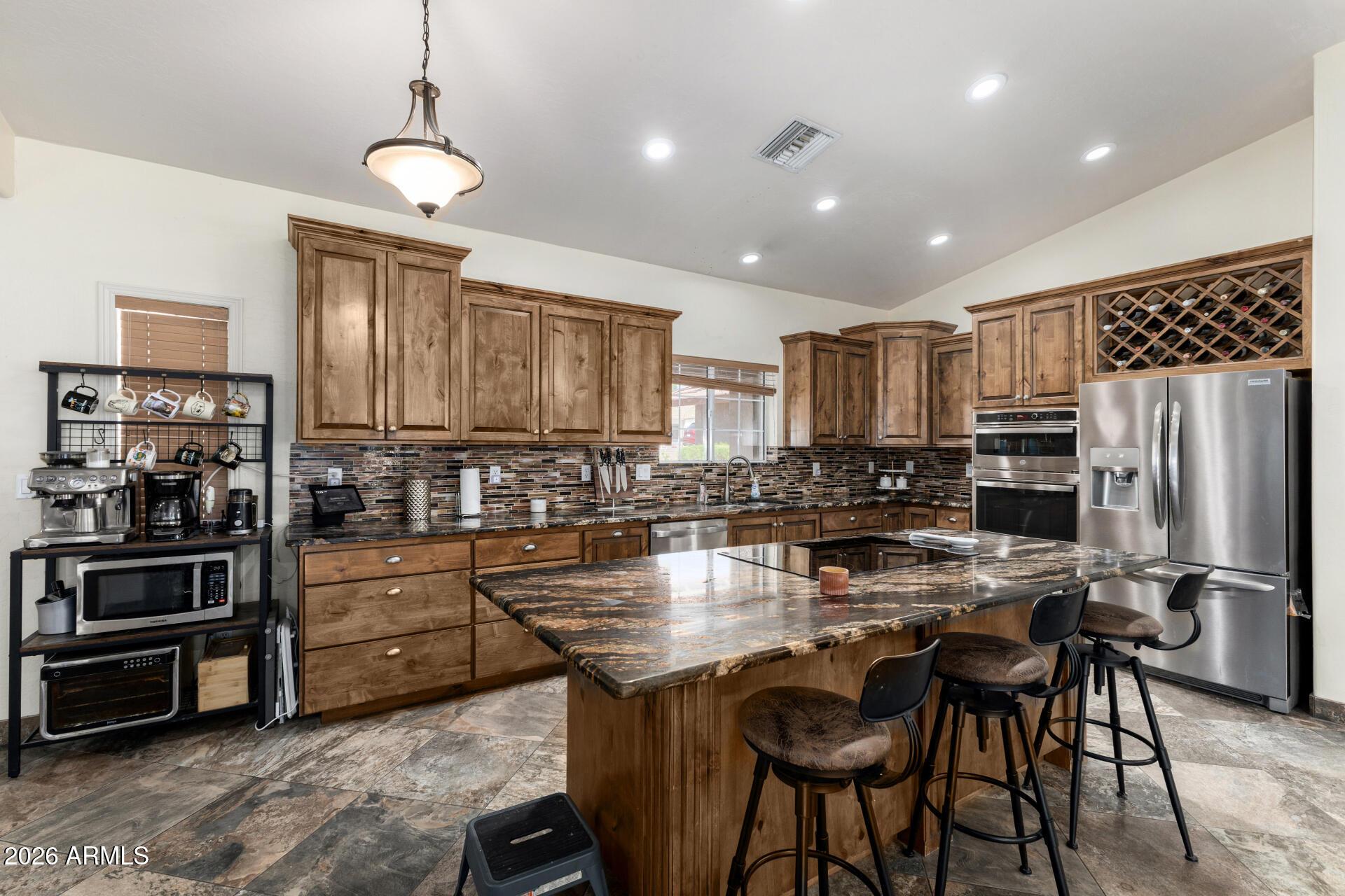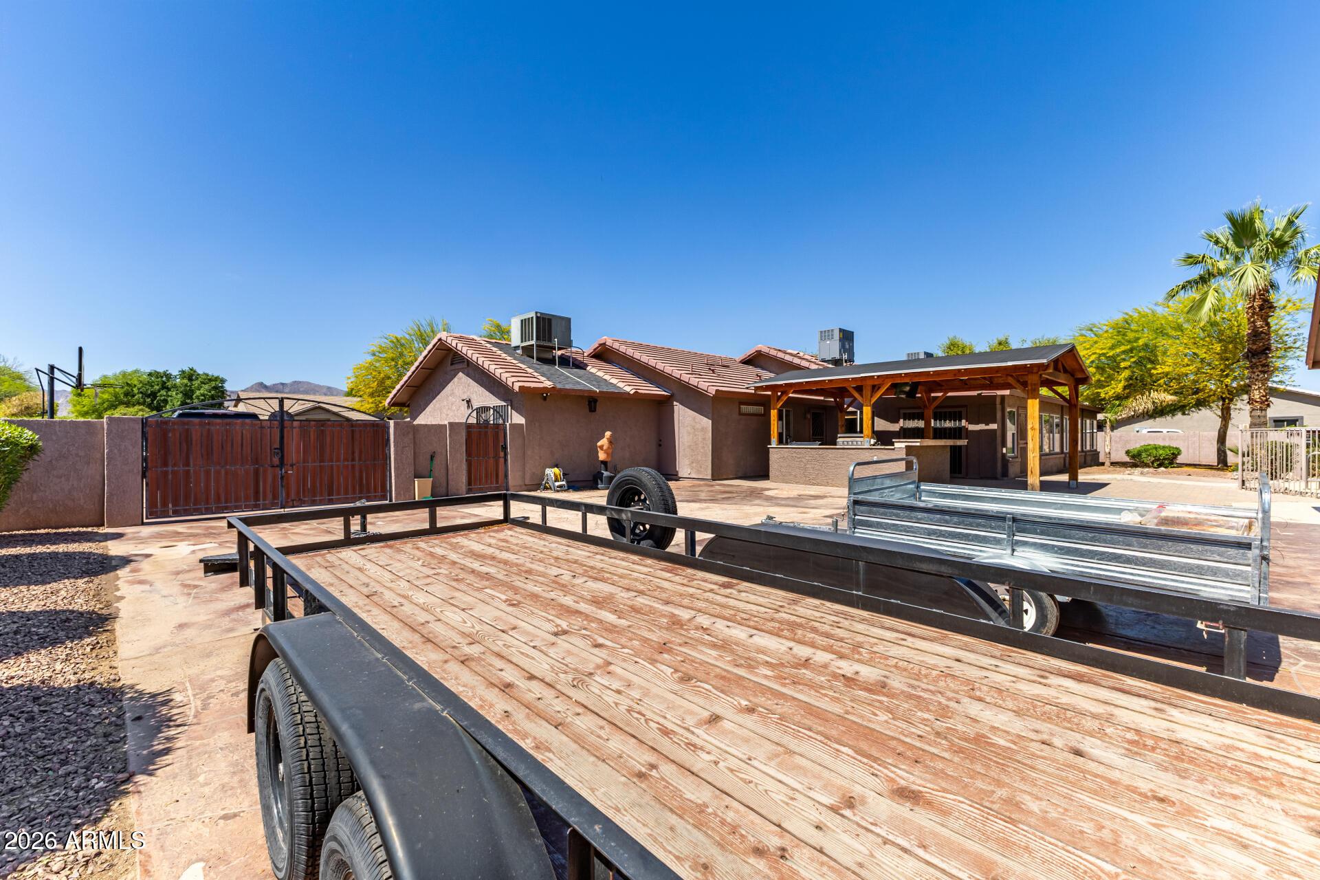 This single level home is situated on over an acre of lush green grass, and trees with a sparkling fenced pool surrounded by palm trees - your own private oasis.. The home features open expansive living spaces with a living room, family room and an Arizona room, you have lots of options for formal or casual living.The open kitchen is an inviting space to prep, cook and gather around the large island. Granite countertops, stainless steel appliances and plenty of cabinet space. There is room for all your toys or hobbies in the detached garages. 2 car garage in front and a single car garage in the rear of property that would be a perfect shop or maybe a great mancave /she shed with both water and electric.Grass is watered through flood irrigation Chickens and horses are welco
