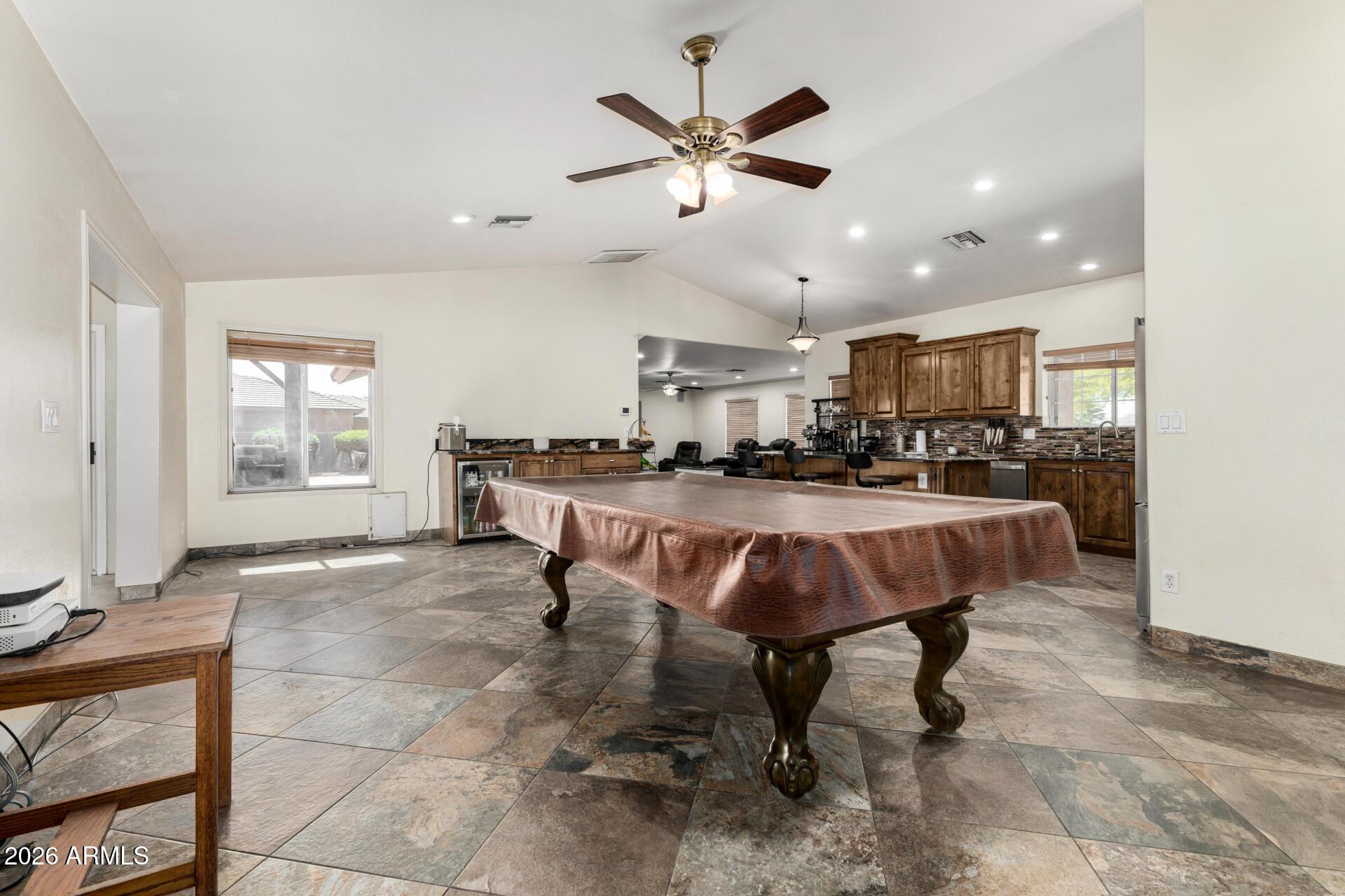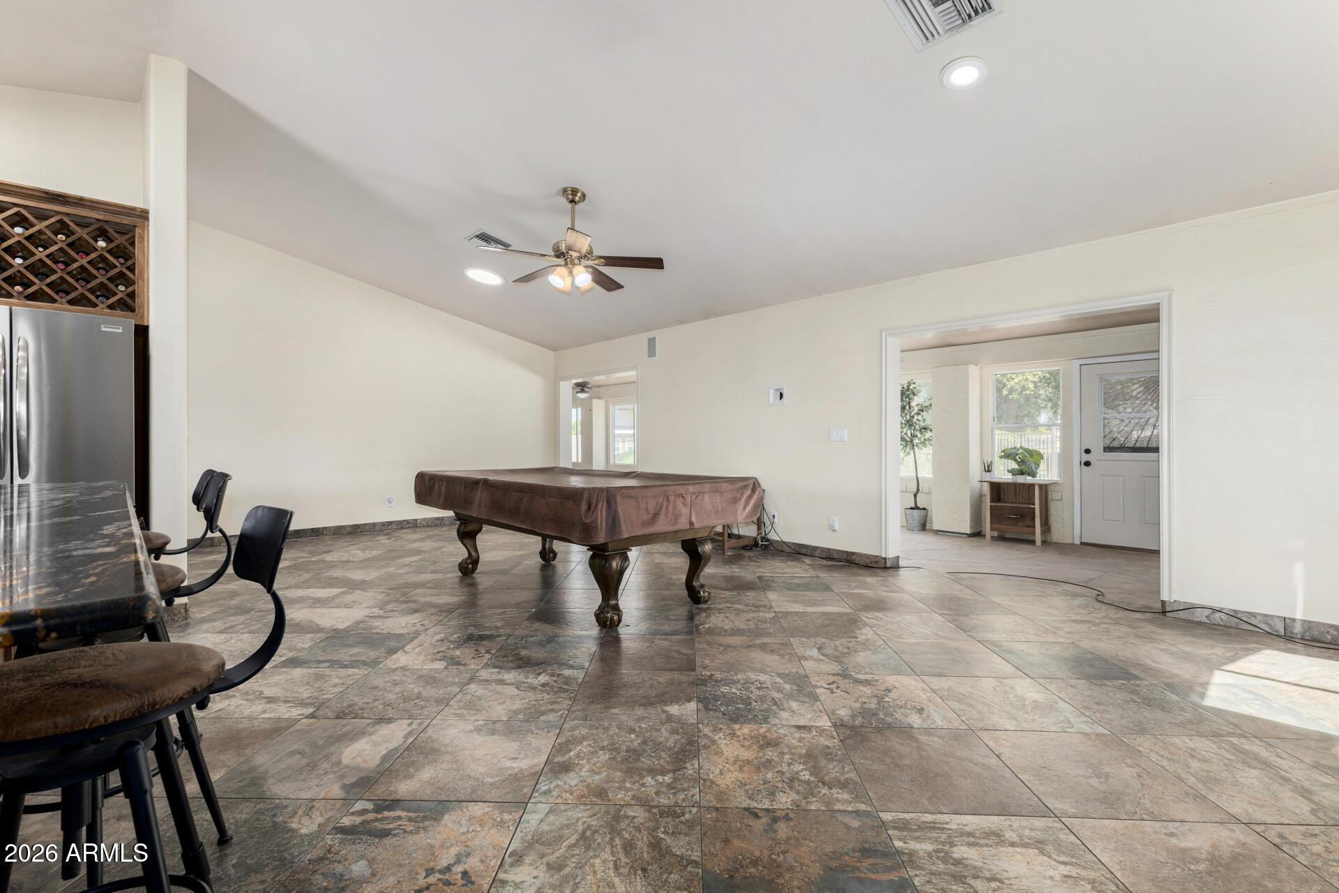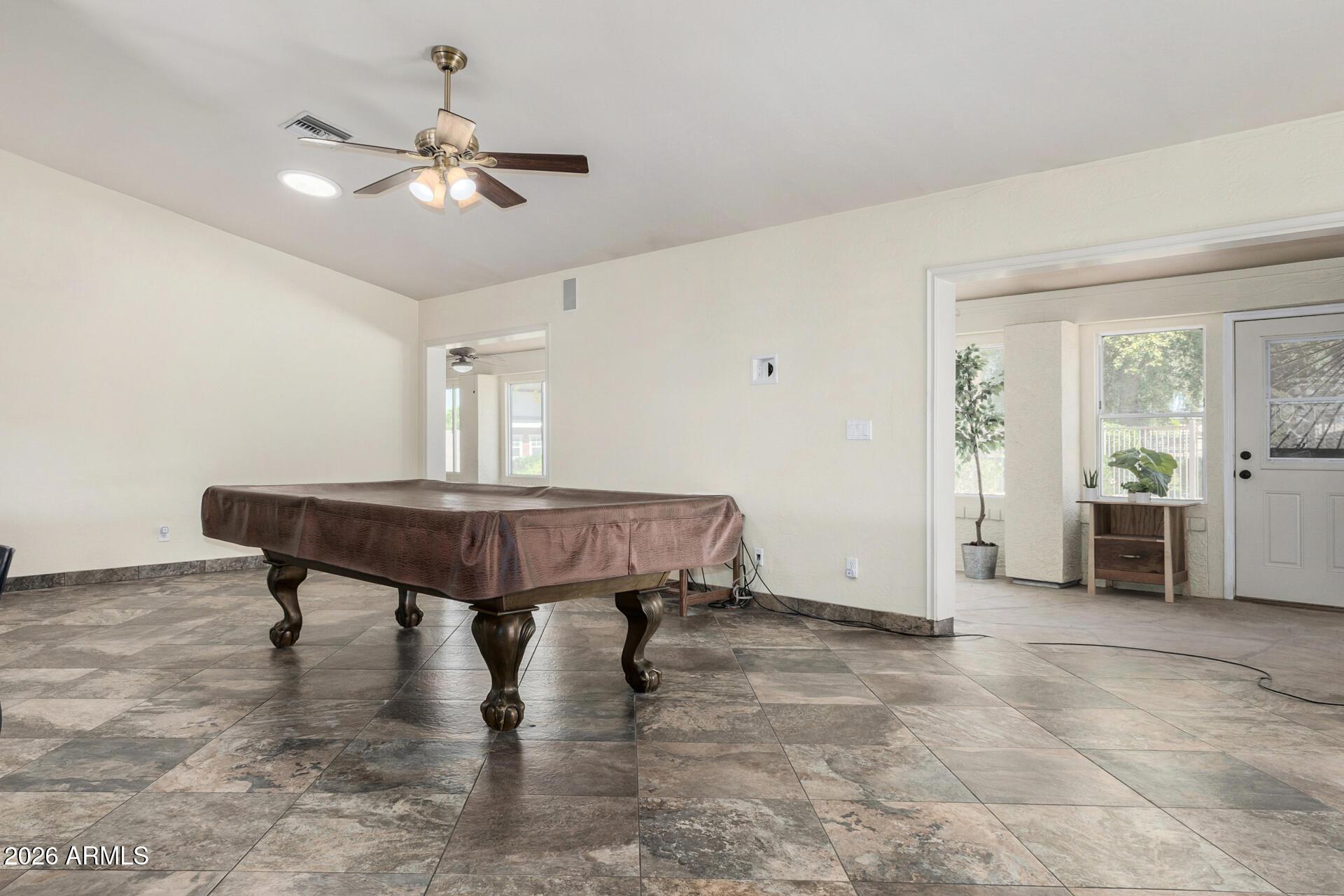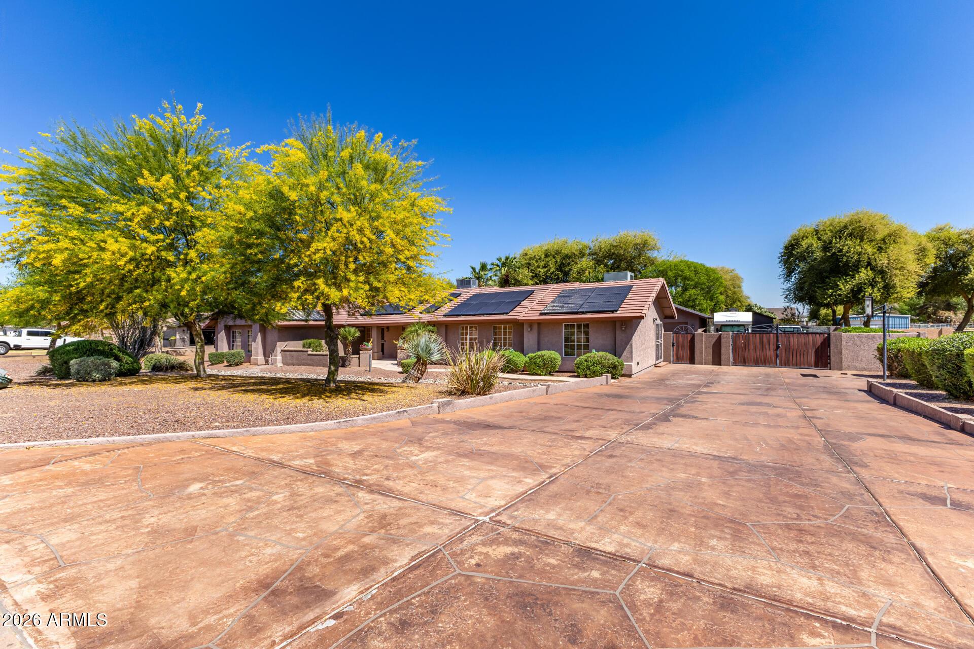 This single level home is situated on over an acre of lush green grass, and trees with a sparkling fenced pool surrounded by palm trees - your own private oasis.. The home features open expansive living spaces with a living room, family room and an Arizona room, you have lots of options for formal or casual living.