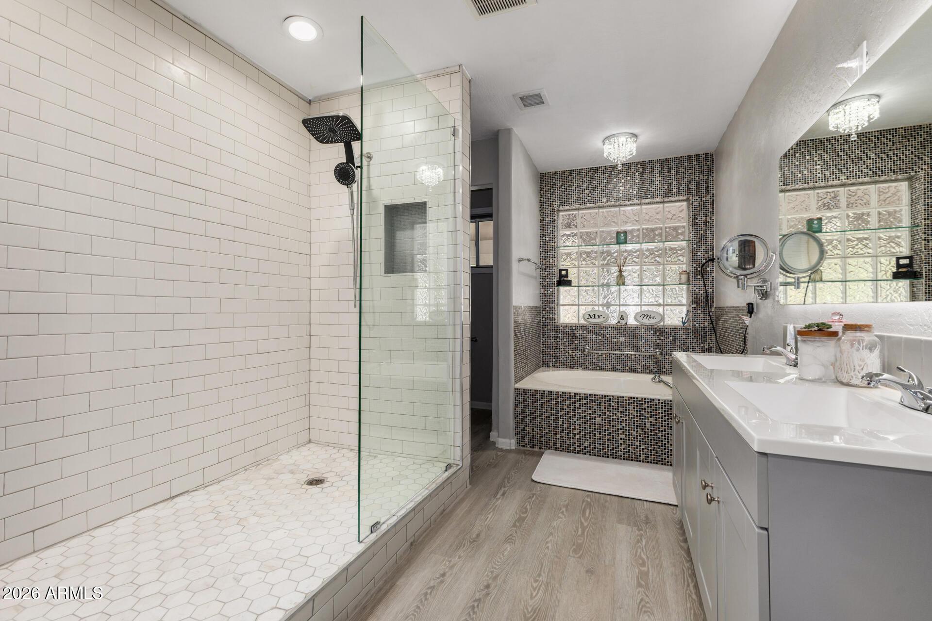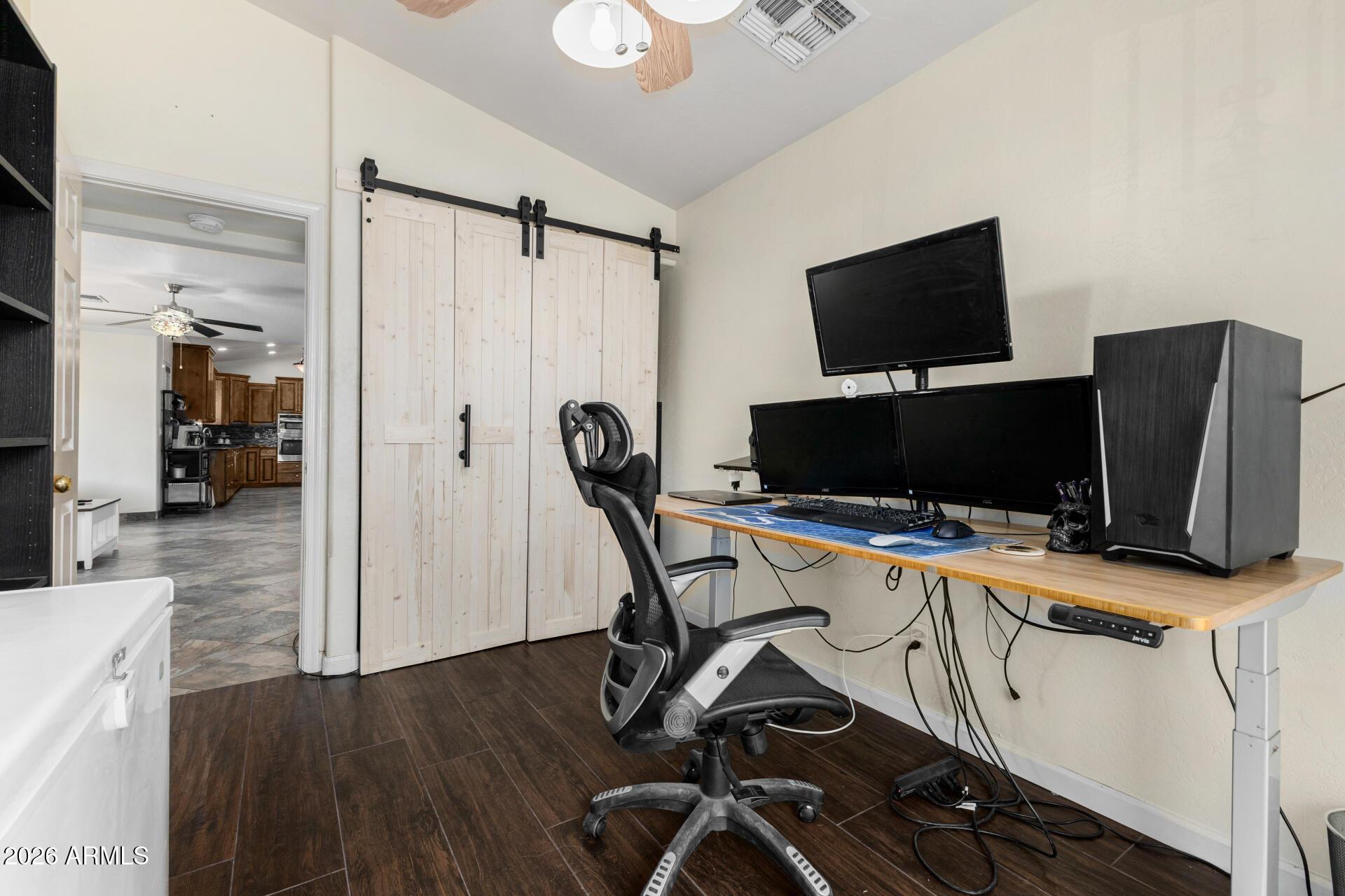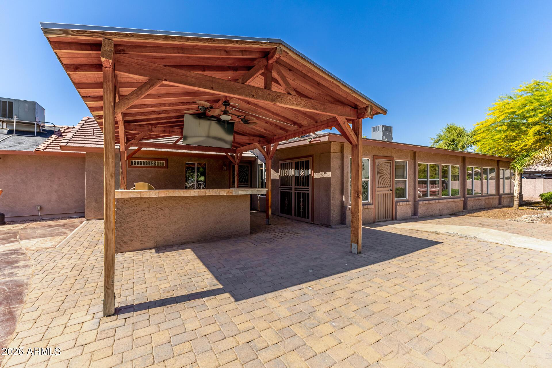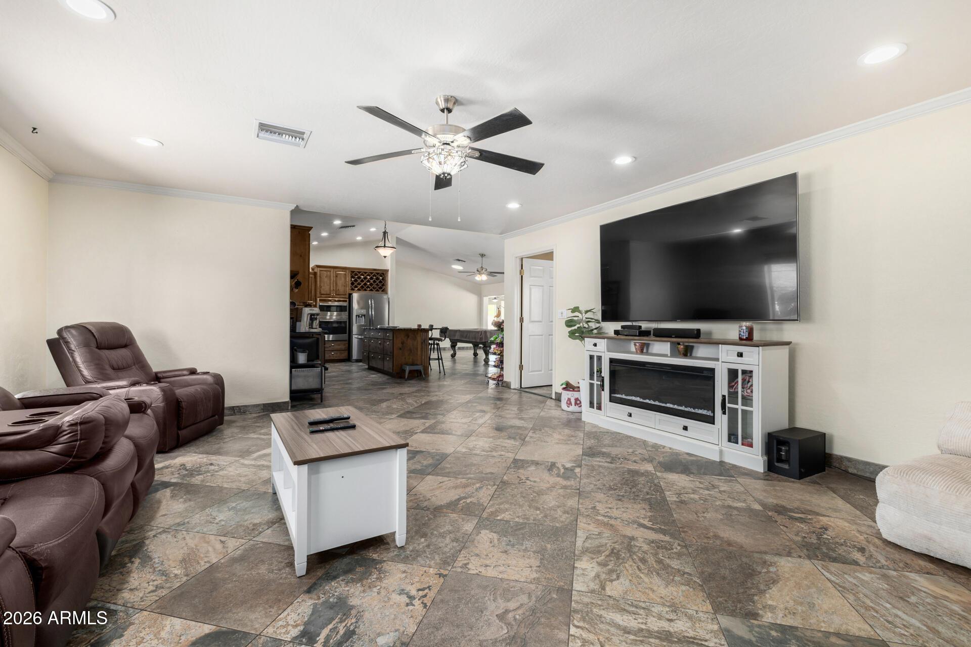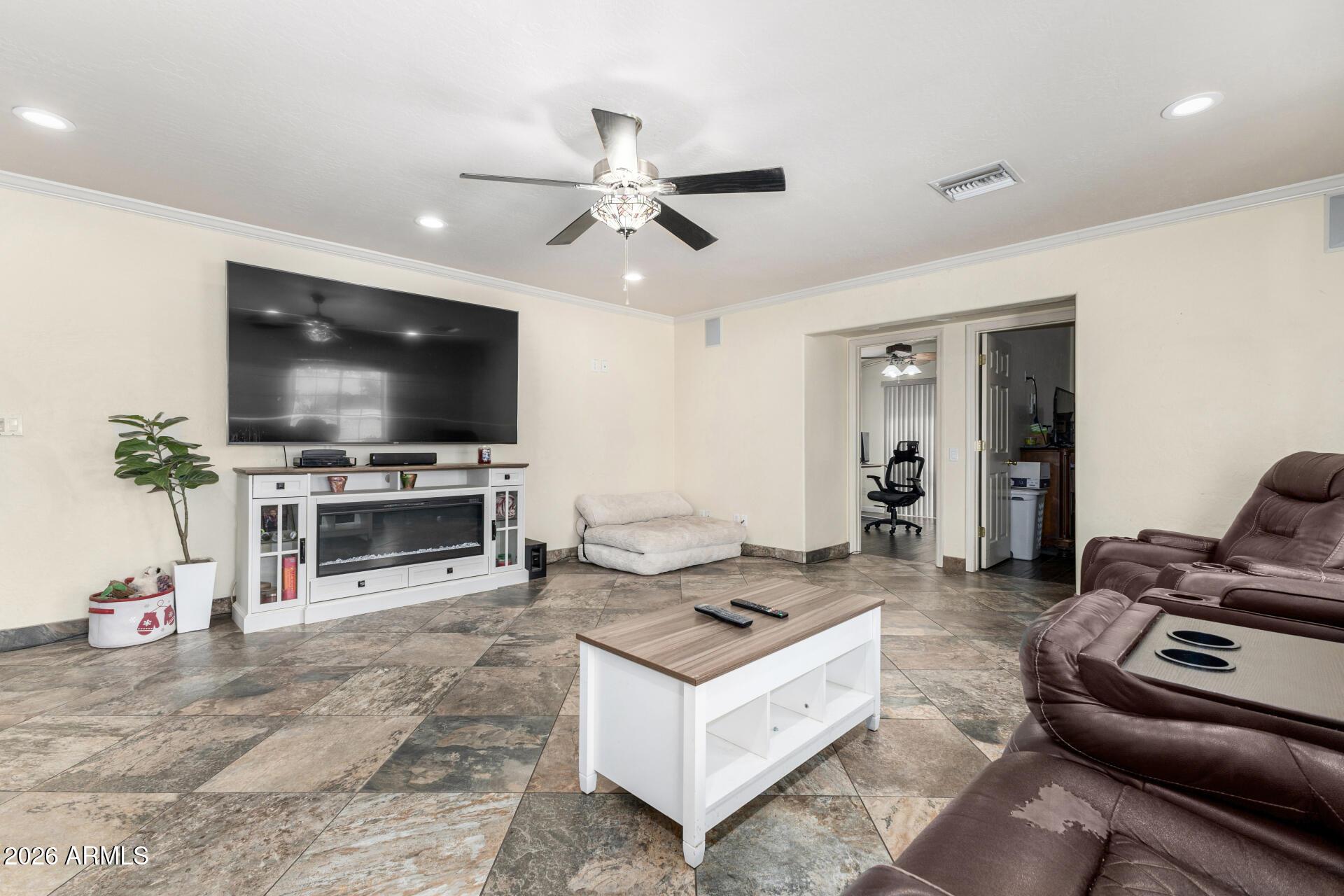 This single level home is situated on over an acre of lush green grass, and trees with a sparkling fenced pool surrounded by palm trees - your own private oasis.. The home features open expansive living spaces with a living room, family room and an Arizona room, you have lots of options for formal or casual living.